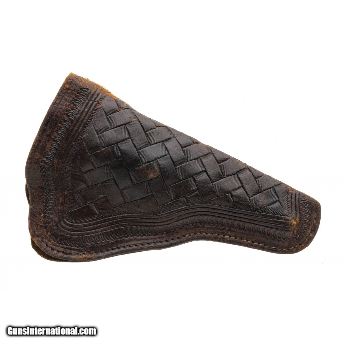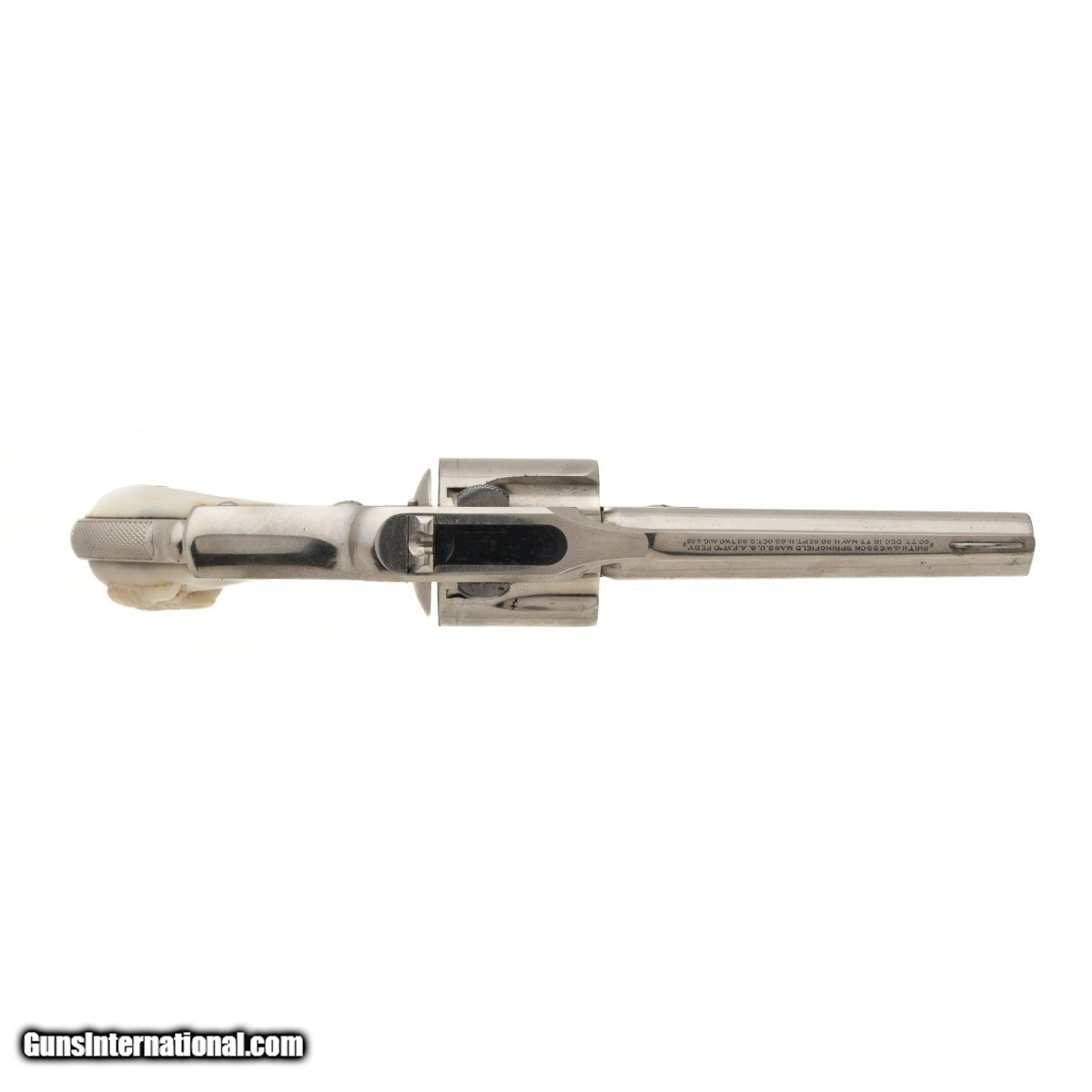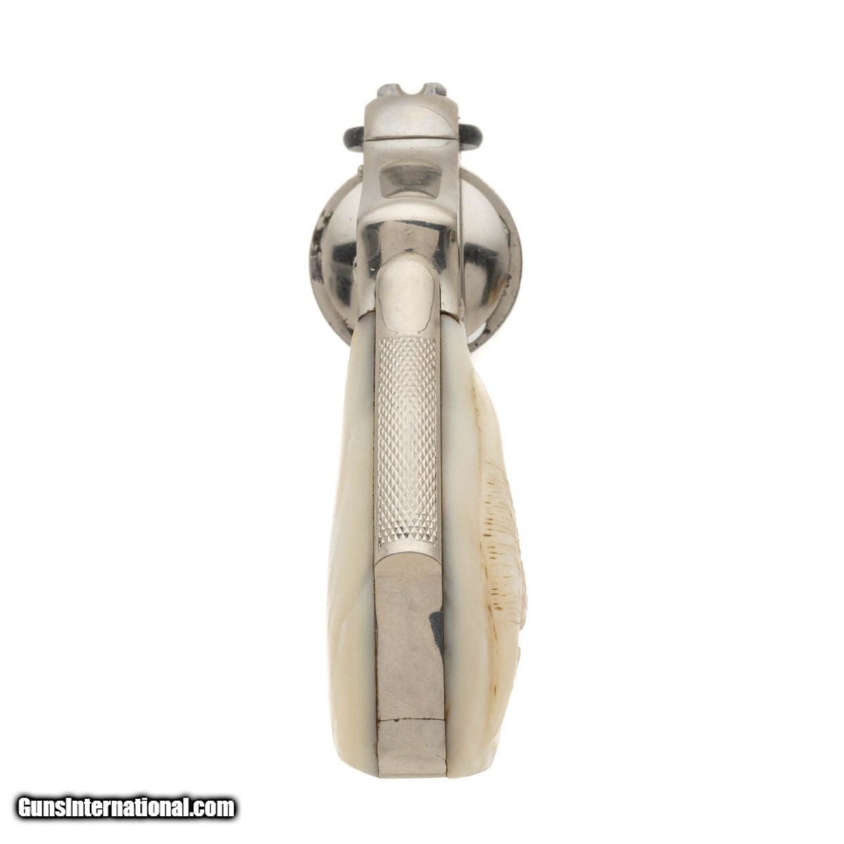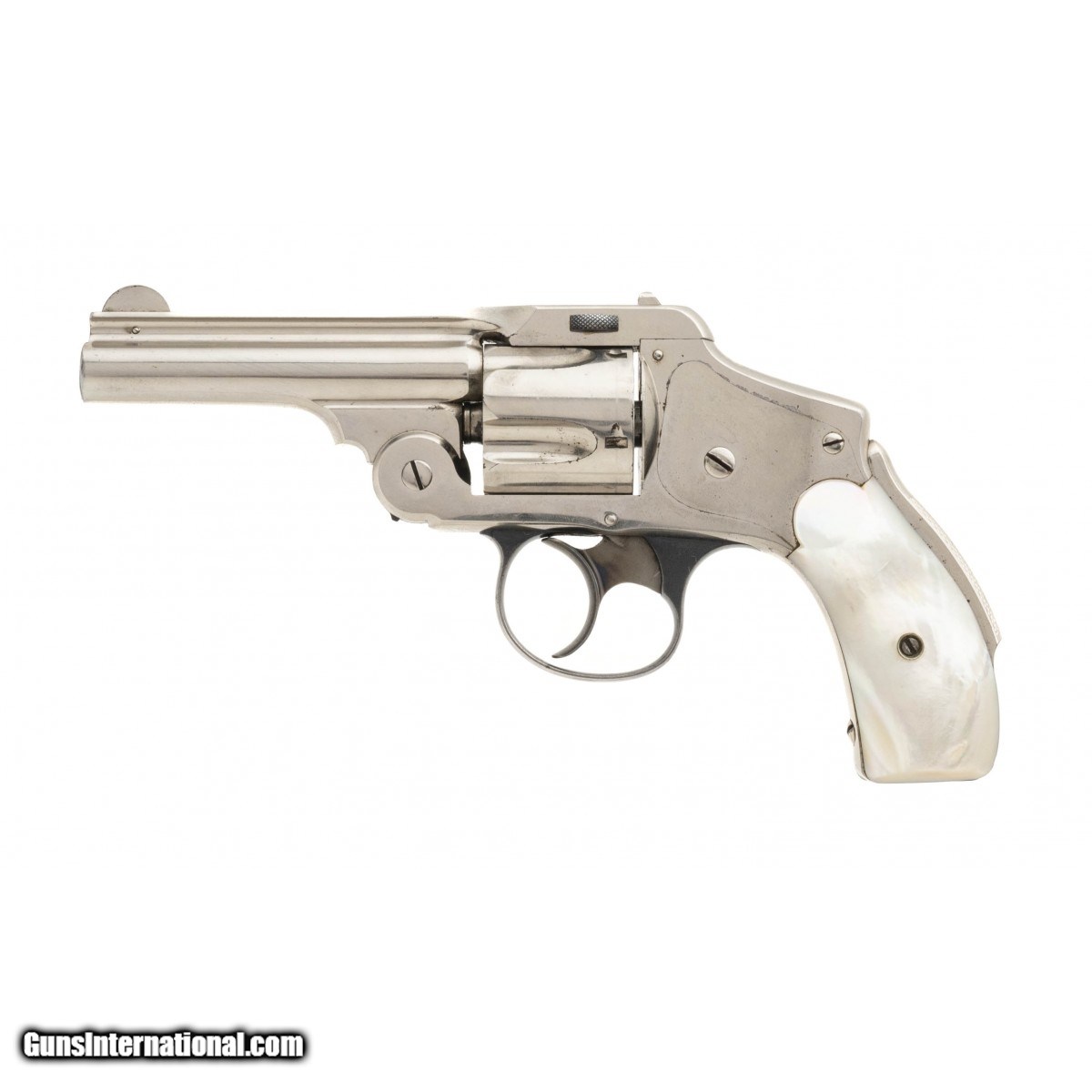 Description: "Serial number 910. Made in 1887. 38 S&W caliber with a 3 ¼" barrel. Very fine 1st Model 38 S&W caliber New Departure Model. This gun is in excellent original condition with 95%+ of the original nickel finish. The grips are two piece pearls with a carved steer head on the right hand side. Along with this gun is a weaved leather holster. Very fine Smith & Wesson New Departure w/ Holster! SOLD Antique: Yes |