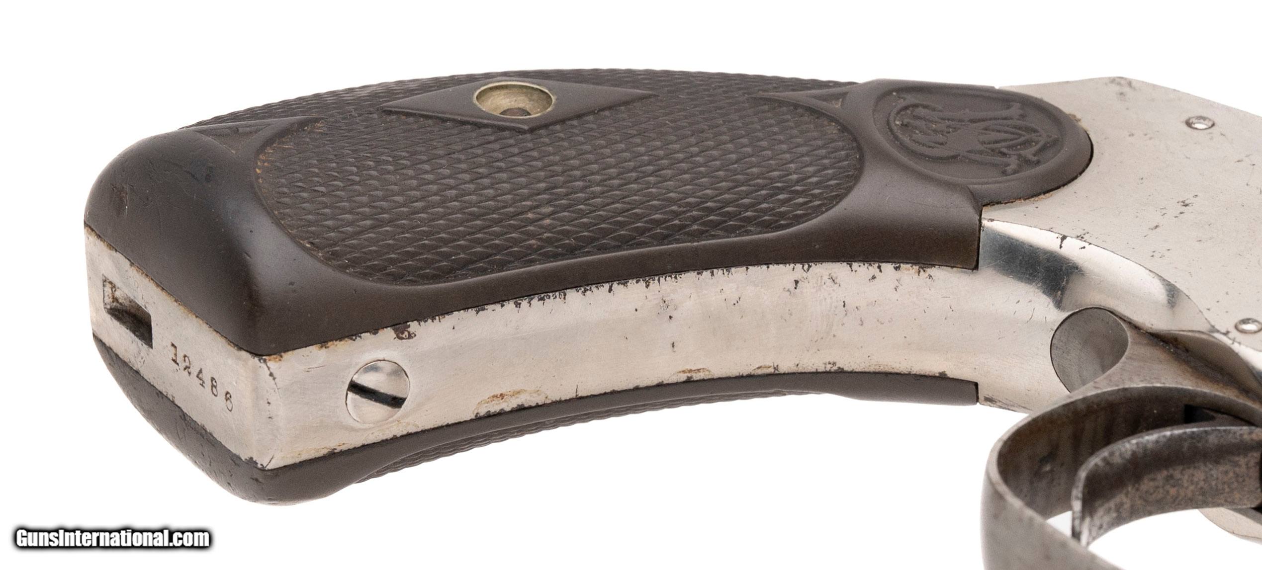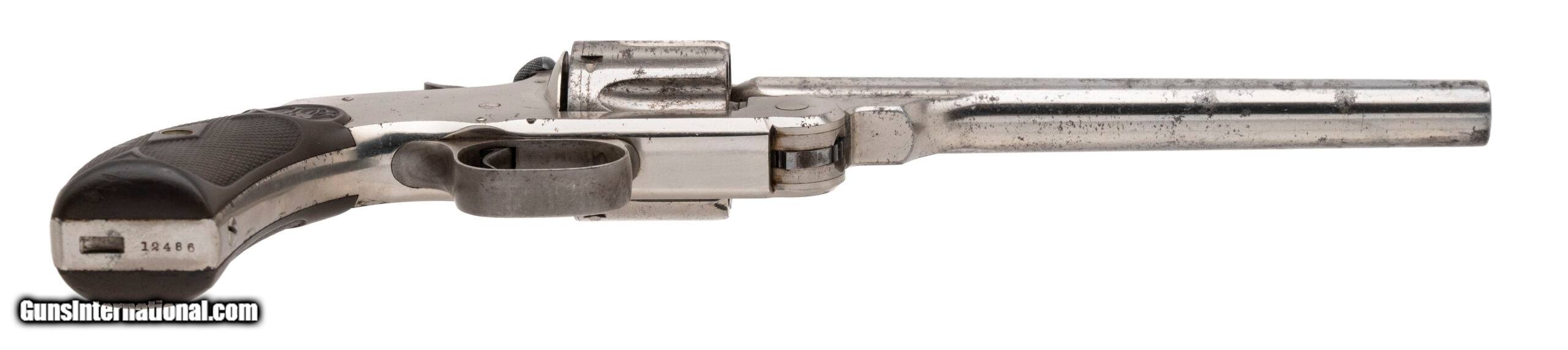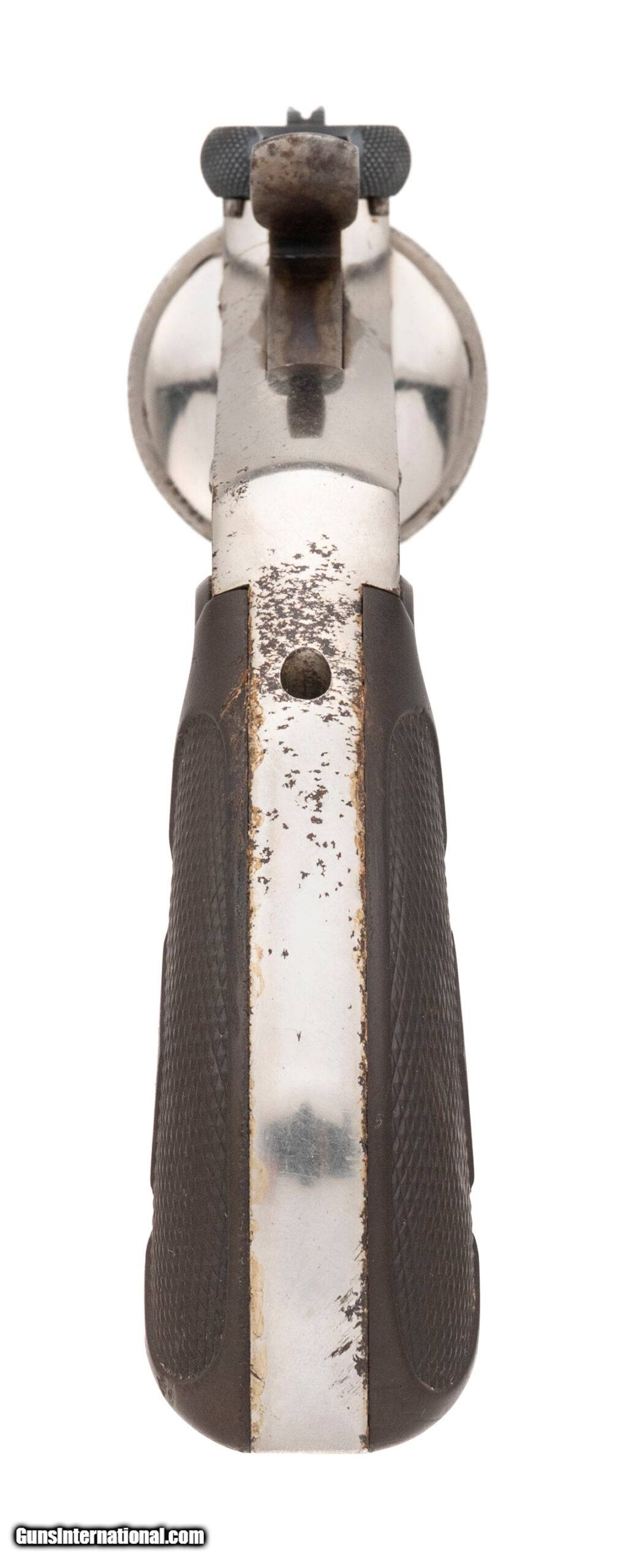 "Serial number 12486. Made circa 1890s. 44 caliber with a 7" barrel. This is in the same serial range as the Australian models. This gun is in very fine condition with 50% of the original nickel finish. This gun appears top have more nickel than it does because the metal has been polished to match the nickel. The grips are excellent. This gun comes with its original stock. The stock is in excellent condition.