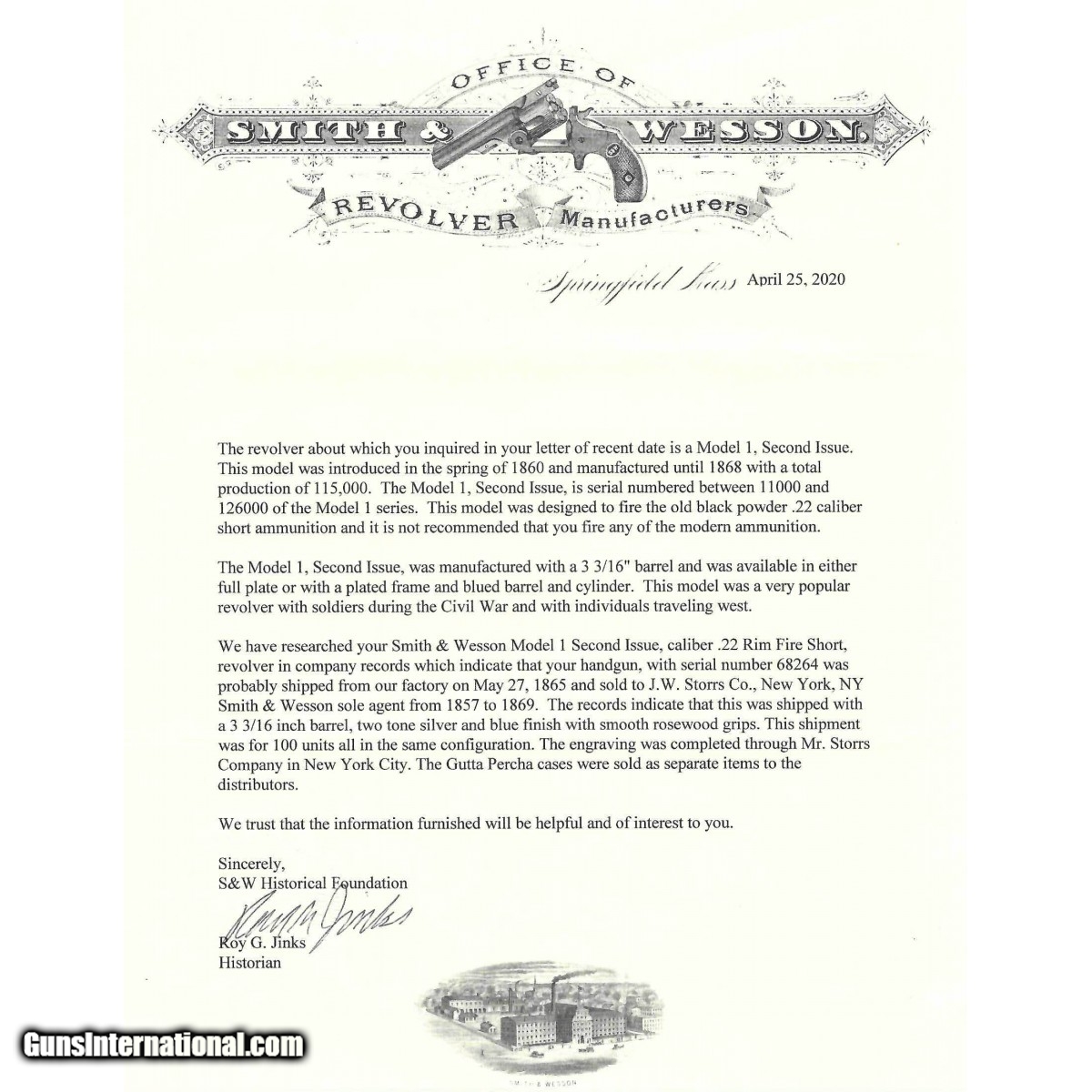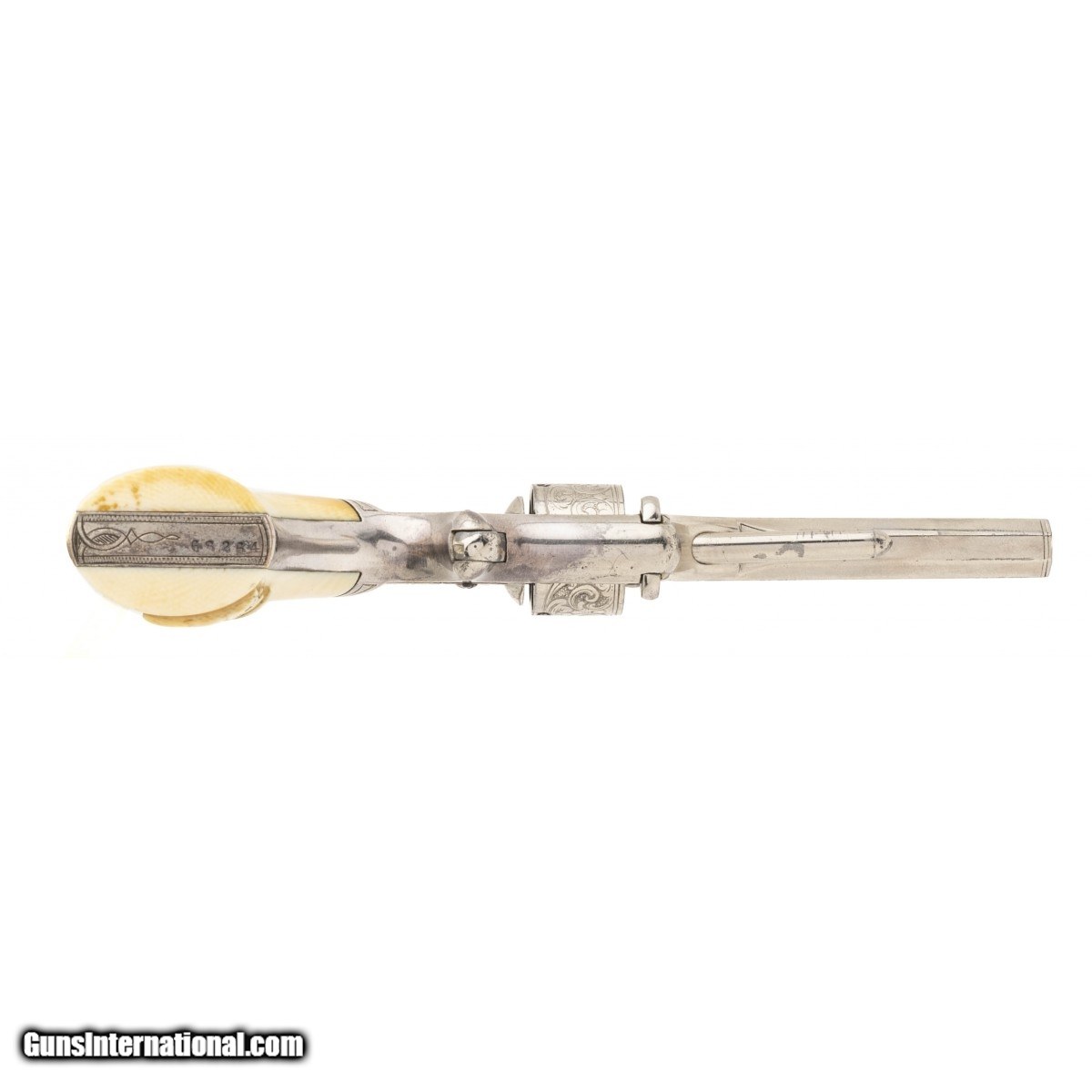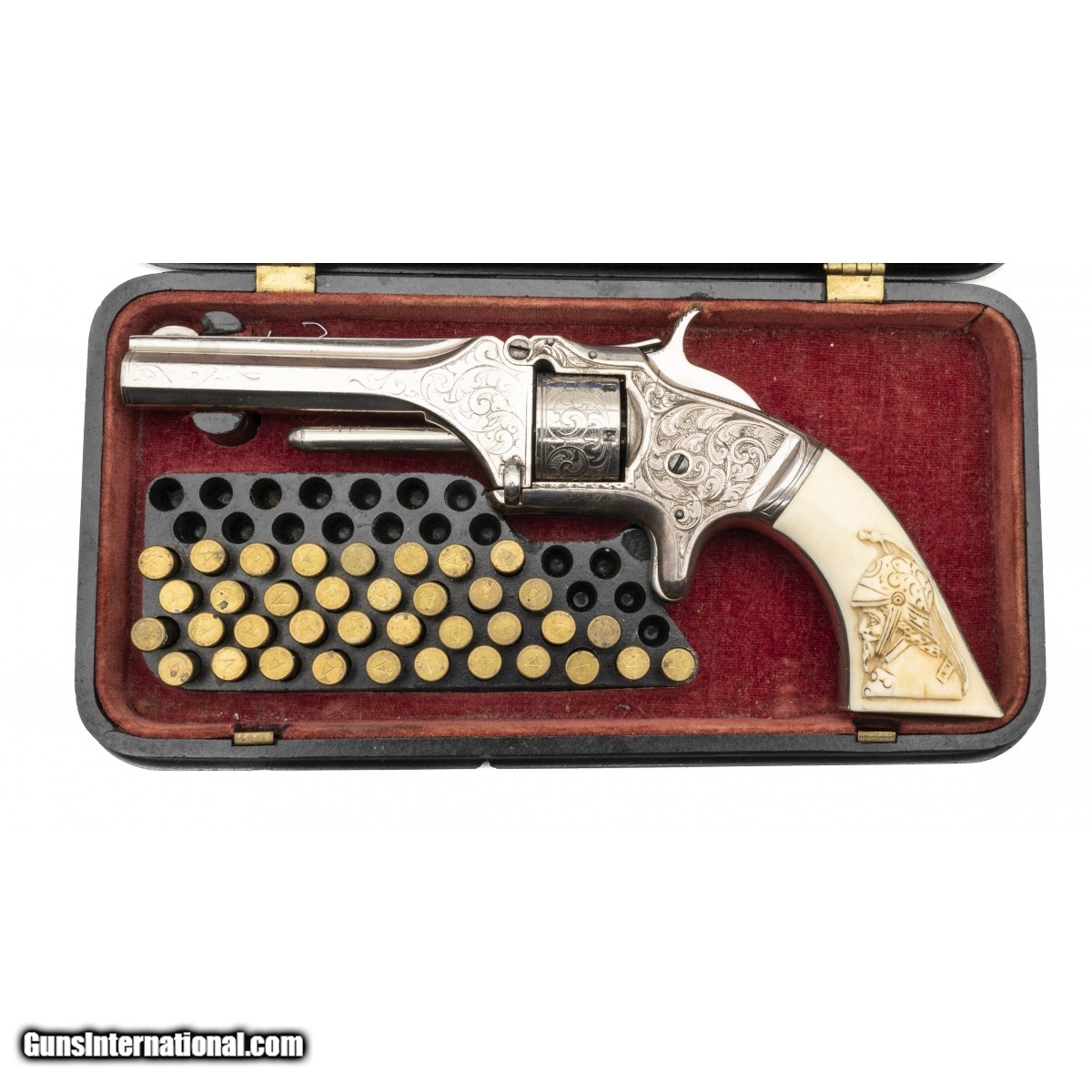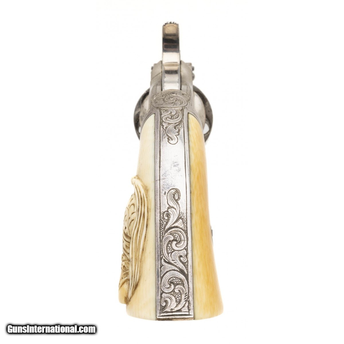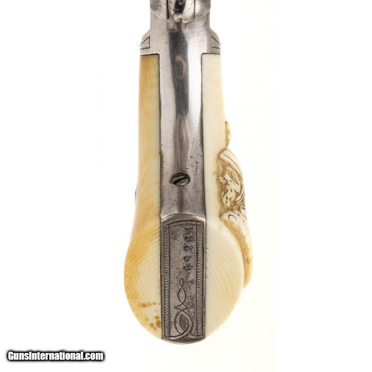 Description: "Serial No. 68264, shipped May 27th 1865, .22 short Rim-Fire, 3.25"" round barrel. Engraved nickel finish with ivory grips, revolver rates in near excellent condition. Bore is good with some frosting visible in the grooves. Rifling remains strong. Grips are in excellent condition. revolver comes with a second style gutta percha hinged lid case which is considered the scarcer of the two. Case is in excellent condition with 37 original rounds. Comes with Jinks letter. Consignment SOLD Antique: Yes |