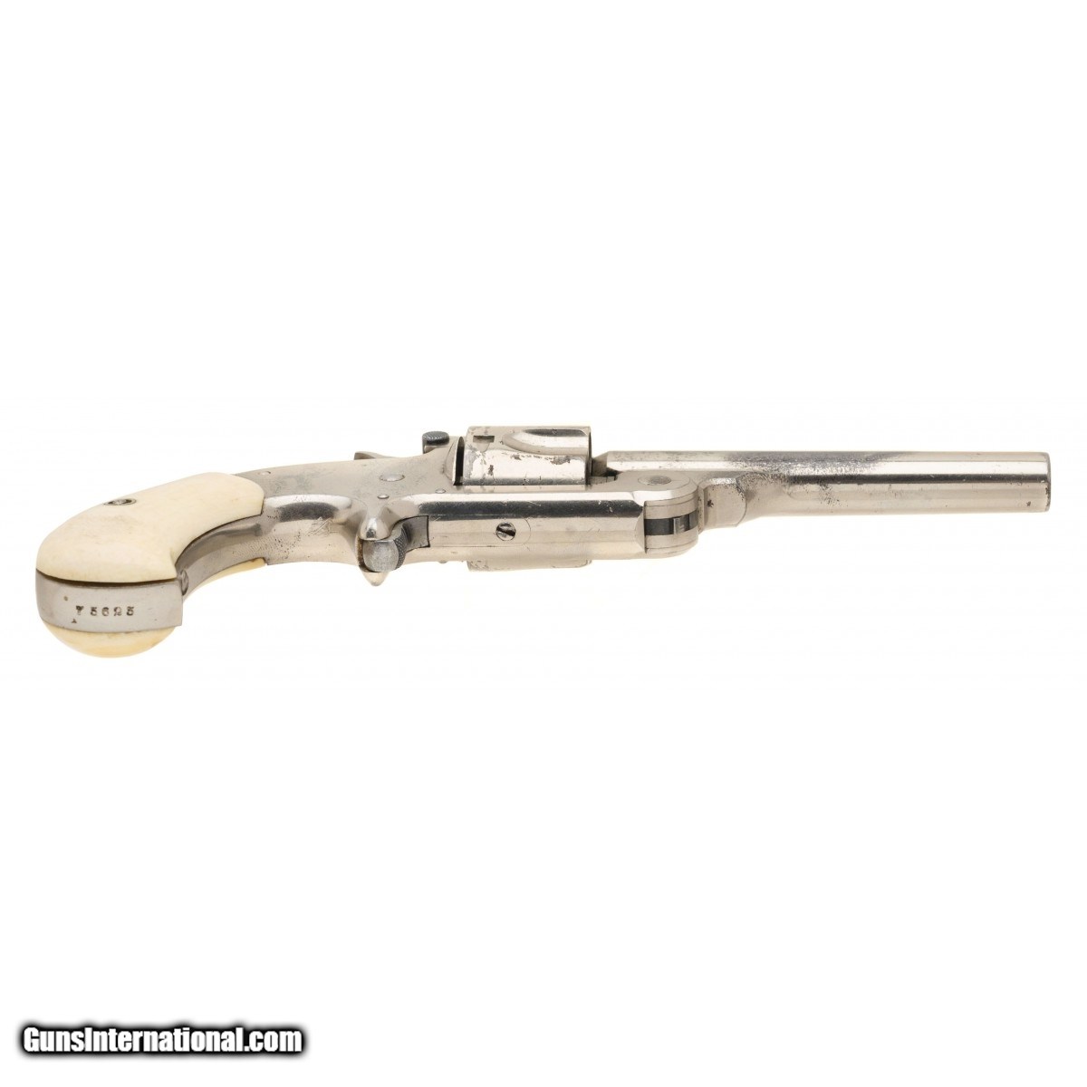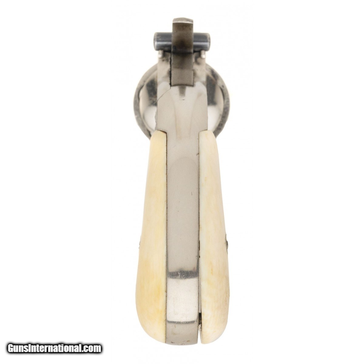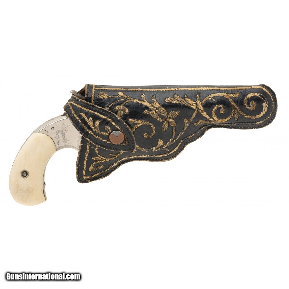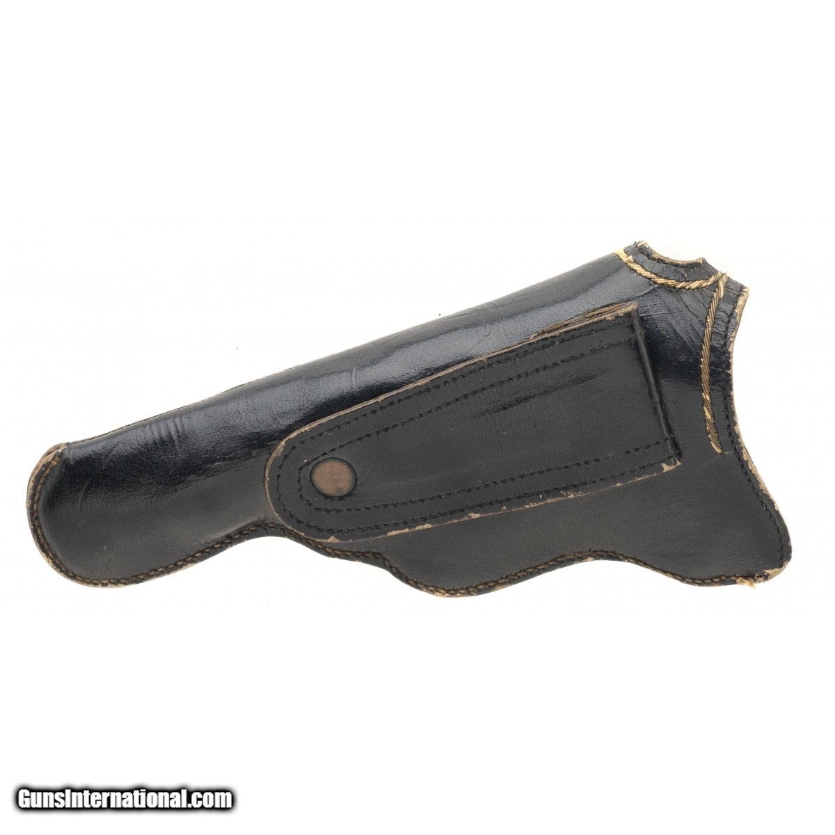 Description: "Serial number 75625. Made circa 1880s. 32 S&W caliber with a 3 ½" barrel. This gun is in excellent with 80% of the original nickel. Grips are original ivory. Even case colors remain on the hammer. This gun comes with a period “slim Jim" style Pieteado Holster. Pieteado holsters were mostly made in Mexico. SOLD Antique: Yes |