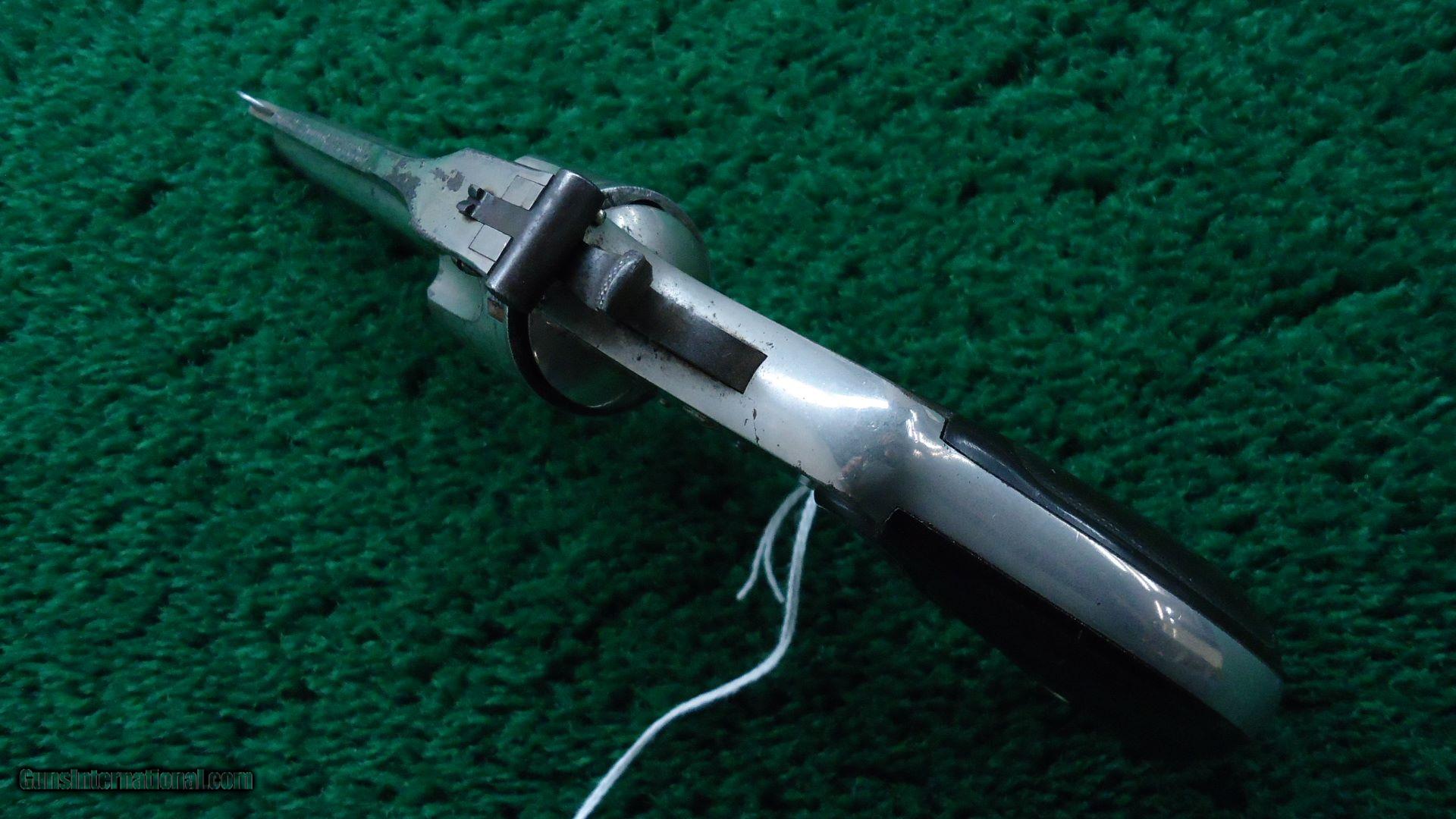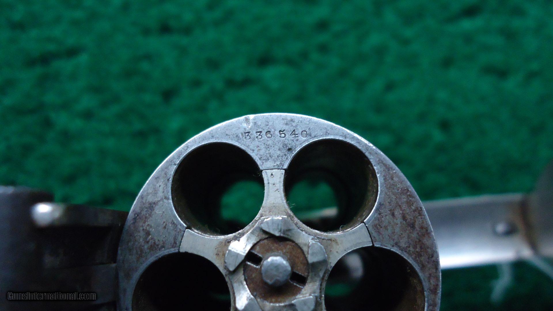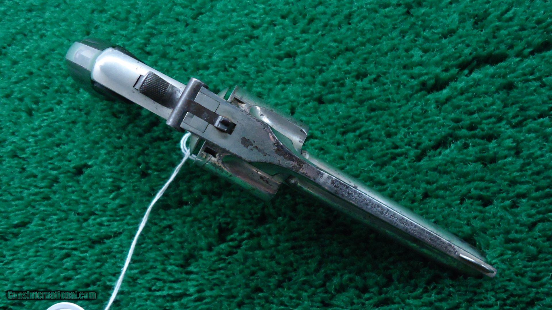 Description: 5 shot 38 S&W caliber. 3 1/4 inch solid rib round barrel. Most all of the original nickel finish remains. Strong traces of case color remain on hammer and trigger. "S&W" monogram checkered black hard rubber grips show some wear but are in good condition. Nice working double action. Good bore. Matching serial numbers. Nice Top-Break Fourth Model Smith & Wesson revolver. 216,300 made between 1895-1909. Leroy Merz Antique Firearms specializes in antique and vintage Winchesters and other fine American firearms. Since 1965 Mr. Merz has taken part in the world of firearms and has been a contributor to many well known reference books. Just recently we mailed the 128th edition of our privately-published catalog. We have hundreds of additional guns in every price range at our home online. Search for Merz Antiques in google. SOLD Antique: Yes |