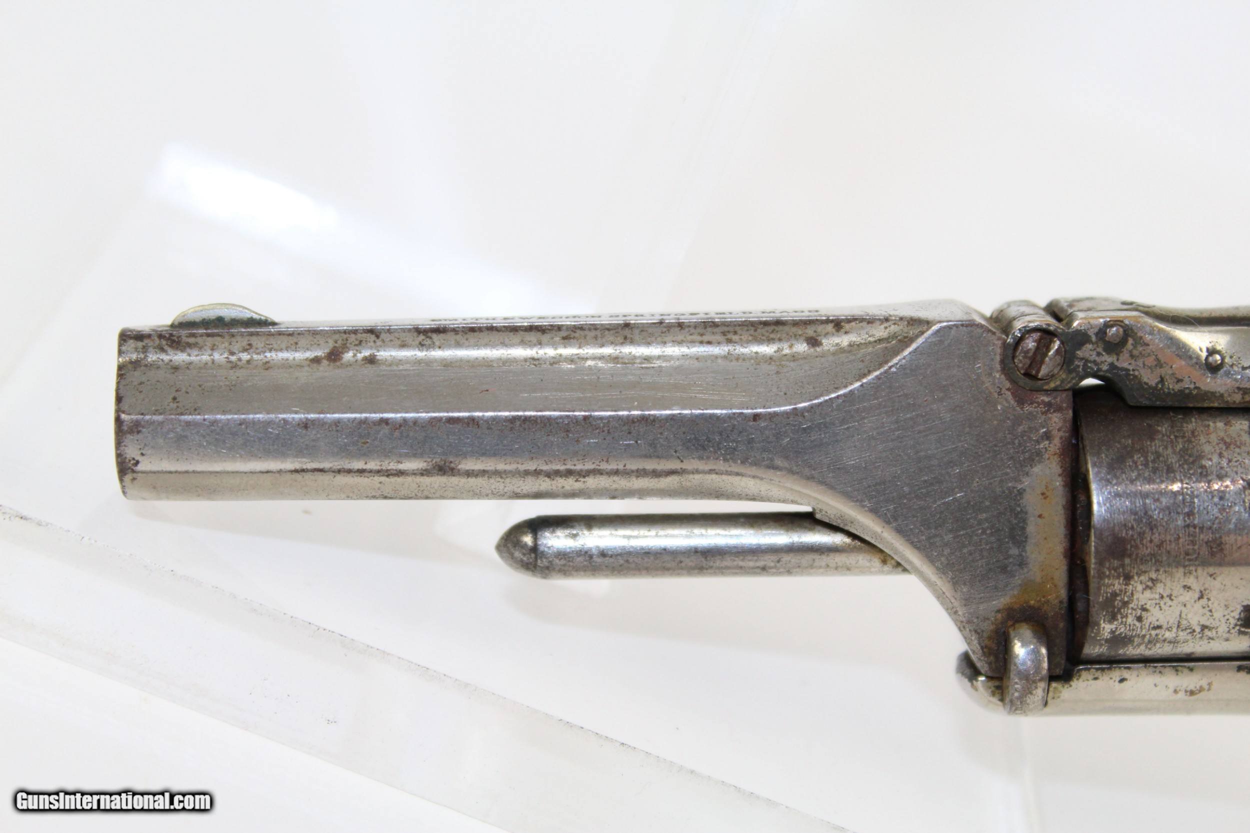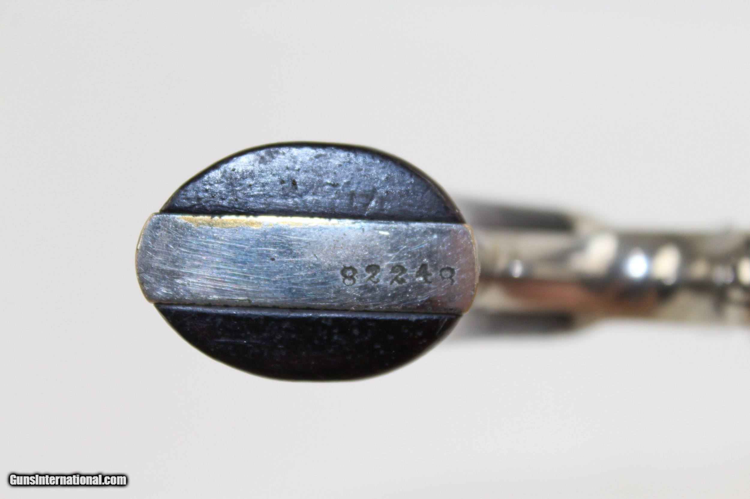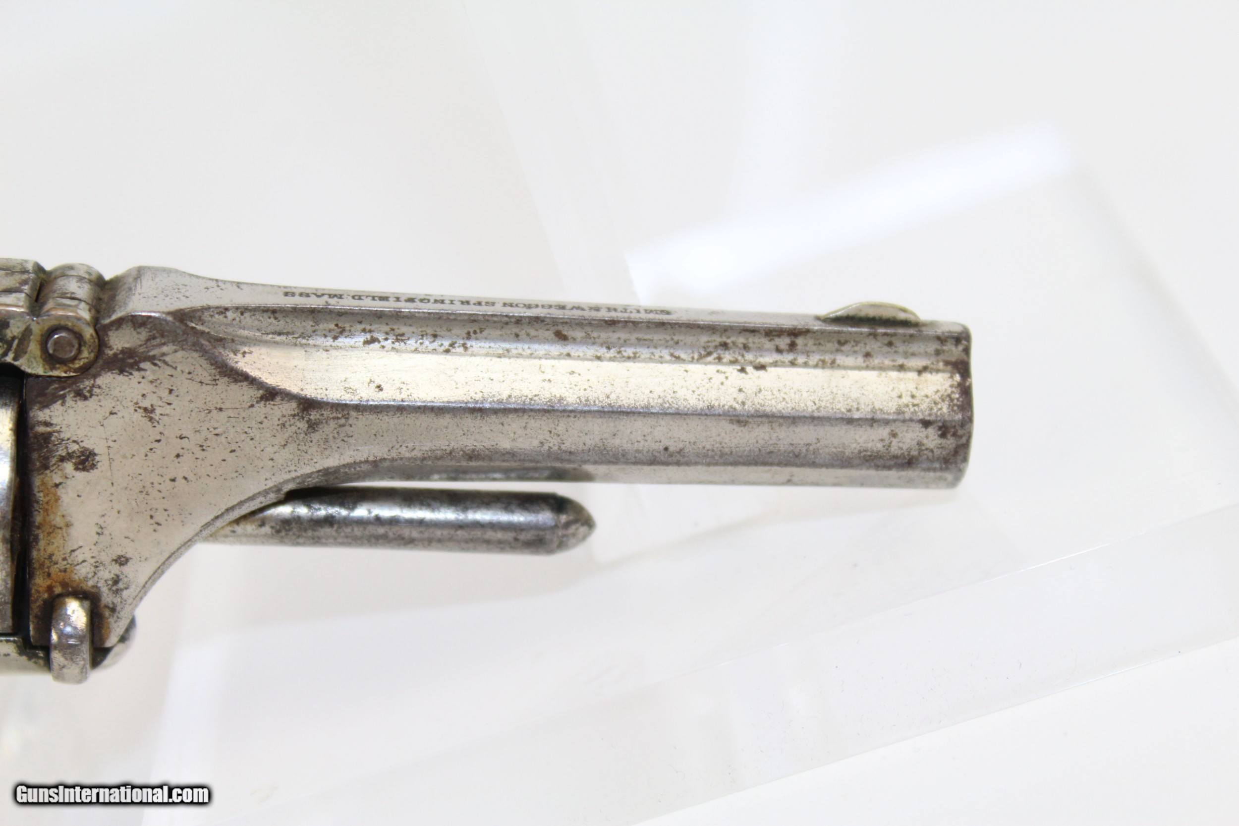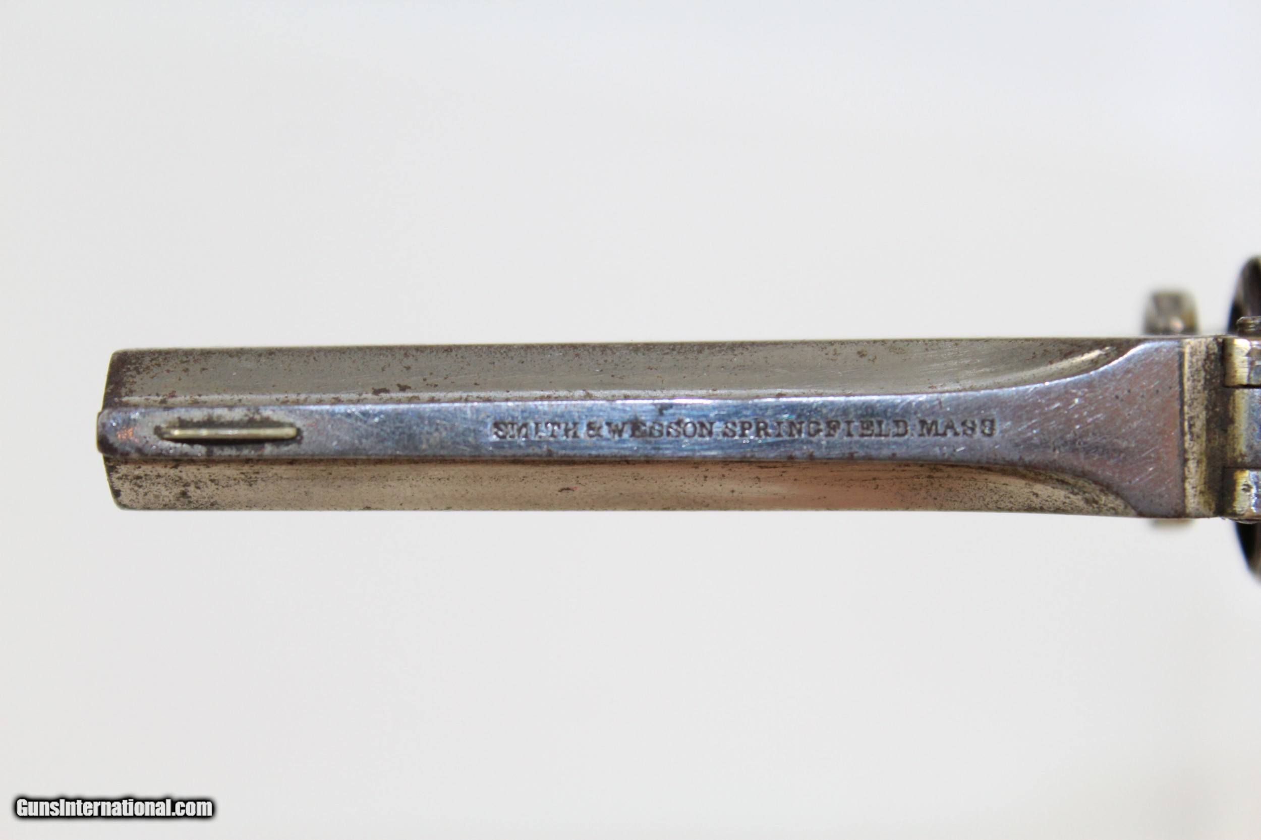 Description: Antique NICKEL Smith & Wesson No. 1 Revolver S&W’s Tiny Flagship Revolver! Here we present an antique Smith & Wesson Model No. 1. Second Issue Revolver, manufactured circa 1868 in Springfield, Massachusetts. The No. 1 was Smith & Wesson’s first metallic cartridge firearm. It utilized the idea of the “bored through cylinder”, which was patented by Rollin White and subsequently exclusively licensed by Smith & Wesson. This concept has forever changed revolving firearms design, and is the same idea used in revolvers today. S&W, via Rollin White himself, aggressively sued any patent infringers and were able to hold their monopoly on the American market for cartridge revolvers from about 1857 to 1870, whereupon their patent expired. The results were a very profitable business, a broke Rollin White, and a grudging U.S. Chief of Ordnance Alexander Dyer, who was still angry in 1870 about not being able to use the technology during the Civil War. The U.S. government ended up giving Colt their contracts since they valued the larger .44 caliber in the Colt 1860 Armies over the .32 caliber full sized No. 2 Armies. This small revolver is a 7-shot .22 rimfire. It was specifically designed to be a pocket gun, being very small and light. The No. 1 was the precursor to larger firearms that were simply scaled up to be more suitable for use as martial weapons. The top of the barrel is marked “SMITH & WESSON SPRINGFIELD, MASS”. The overall condition is very good. 90% of the old nickel finish remains. The markings are clear and legible. The rosewood grips are in great shape. The bore is dark with strong rifling. The action on this revolver is excellent. Own a gorgeous example of Smith & Wesson’s diminutive flagship revolver! Own the original! This is a legitimate antique and not a reproduction. Barrel is 3-3/16 inches. Caliber: .22 Rimfire Overall condition as seen in photos. Very Fast. Very Safe. FREE SHIPPING WORLDWIDE. Delivered directly to your door by express mail! Guaranteed AUTHENTIC & Includes CERTIFICATE OF AUTHENTICITY. ancestryguns $625 #7332 SOLD Antique: Yes |