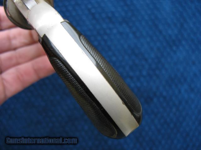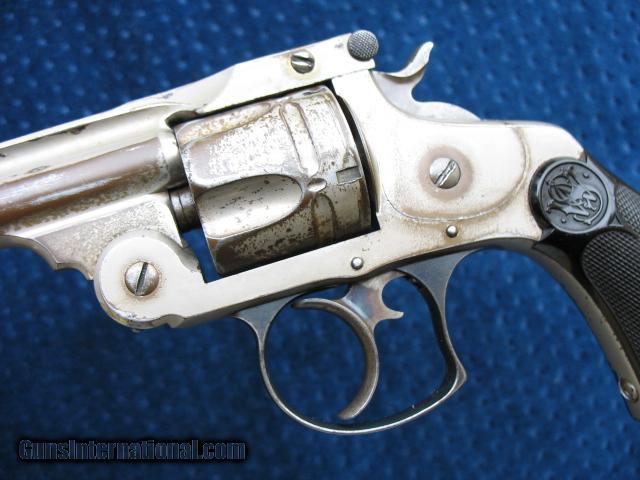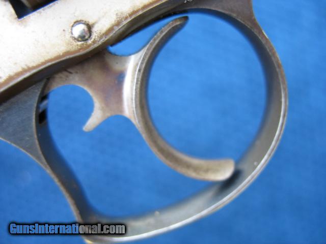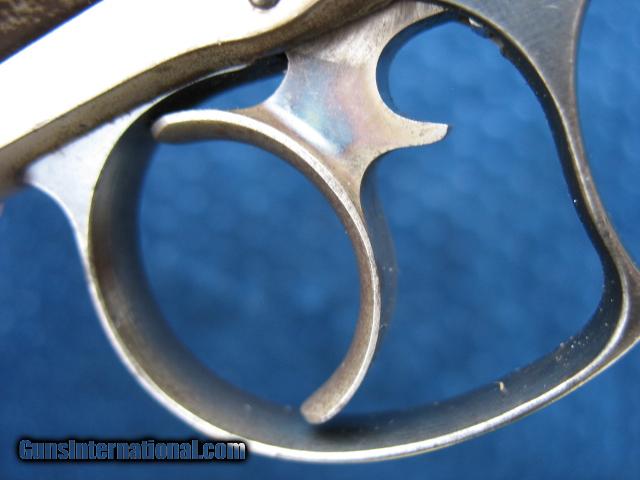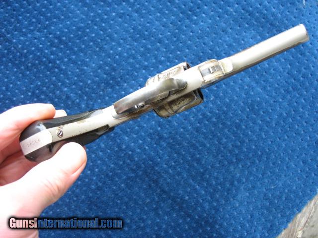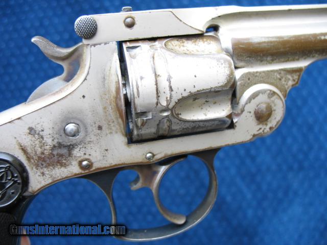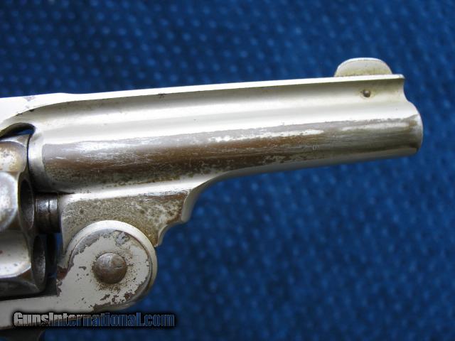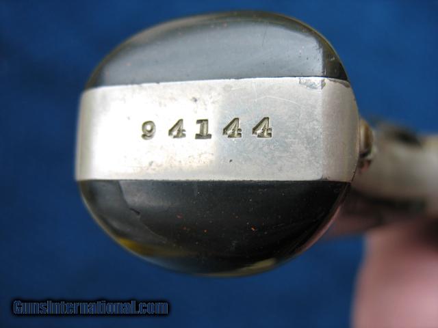 Description: SOLD...Antique Smith & Wesson 2nd model DA. .38 S&W caliber.. Here is a nice and pretty hard to find Smith & Wesson 2nd model. These were made from 1880 to 1884. This one S/N 94144 and ALL matching of course. This one is in nickel finish and it has faded and dulled out OR could possibly be tin plated but I see NO signs of any re finishing. ALL the edges and markings are sharp. Has the standard 3 1/4" barrel. The barrel retains about 75% finish. The cylinder has about 45% or so and the frame has 95% including the front and rear grip straps. The balance of the metal is a smooth medium brown patina. .. There is NO pitting on the gun anywhere. The trigger has some bright vivid case colors in the protected areas as you can see and the trigger guard has nice bright blue remaining on the sides. About 15% blue on the barrel latch. Case colors are visible on the right side of the hammer. These are all original finish and this is why I do not think this gun has ever been messed with or re finished. The mechanics are excellent. Crisp and tight as a new gun and perfect working order in both DA and SA mode. Hammer notches hold on the safety and full cock in the SA mode. Most of these early second models do not function like they are suppose to because most have a seen a lot of wear. This one is perfect. Rock solid barrel to frame fit at the latch and the hinge. NO cylinder movement front to rear and NO side to side wobble. Like I said, this gun is tight as new. The grips are very nice and still show their fine luster and strong checkering with very little wear. A perfect factory fit. The bottom of the left grip shows a small crack that is still solid with nothing missing. Very common to see this crack on these pocket S&W's and many are chipped out in this area. The bore is very good with strong rifling with just some minor roughness as can be expected. The chambers will clean to excellent with no roughness. ALL the markings and edges are perfect and sharp. The front sight has been lowered a little long ago. Original owner did not like the way in shot to the sights and this is what happens.!!! All the screw heads are still sharp but do show some turning as can be expected but not all burred up and abused. This is really an above average early second model DA that are fairly hard to find in nice condition and much better than the beat up, no finish ones that do not work properly. It is offered at a reasonable price also. $51 insured priority mail shipping. Call 765-728-8049 with any questions or more photos. Please check out my other listings by clicking on the link to see all Toms guns. I may have something else of interest to you and I do give package deals on mutiple purchases. SOLD Antique: Yes |