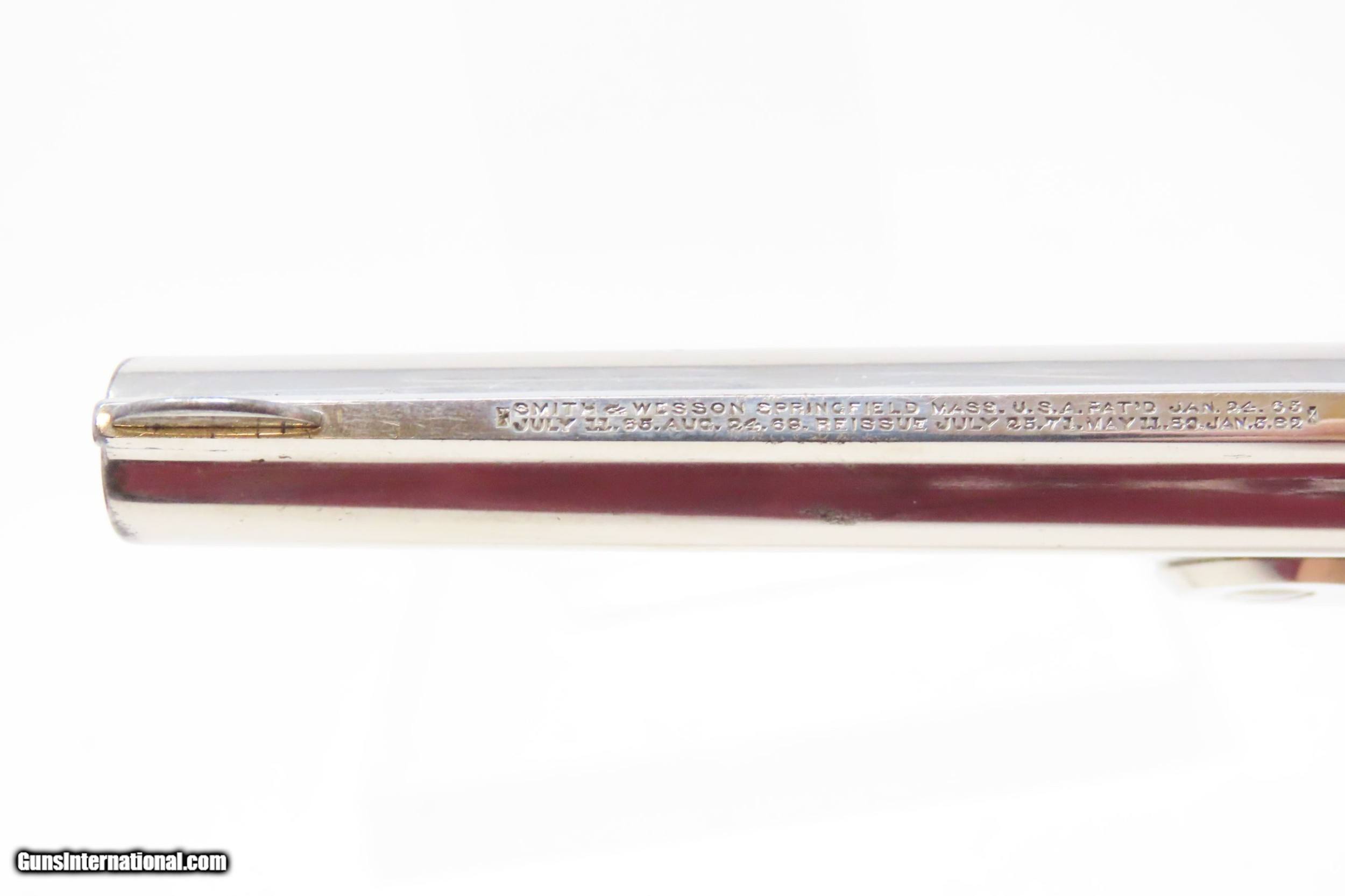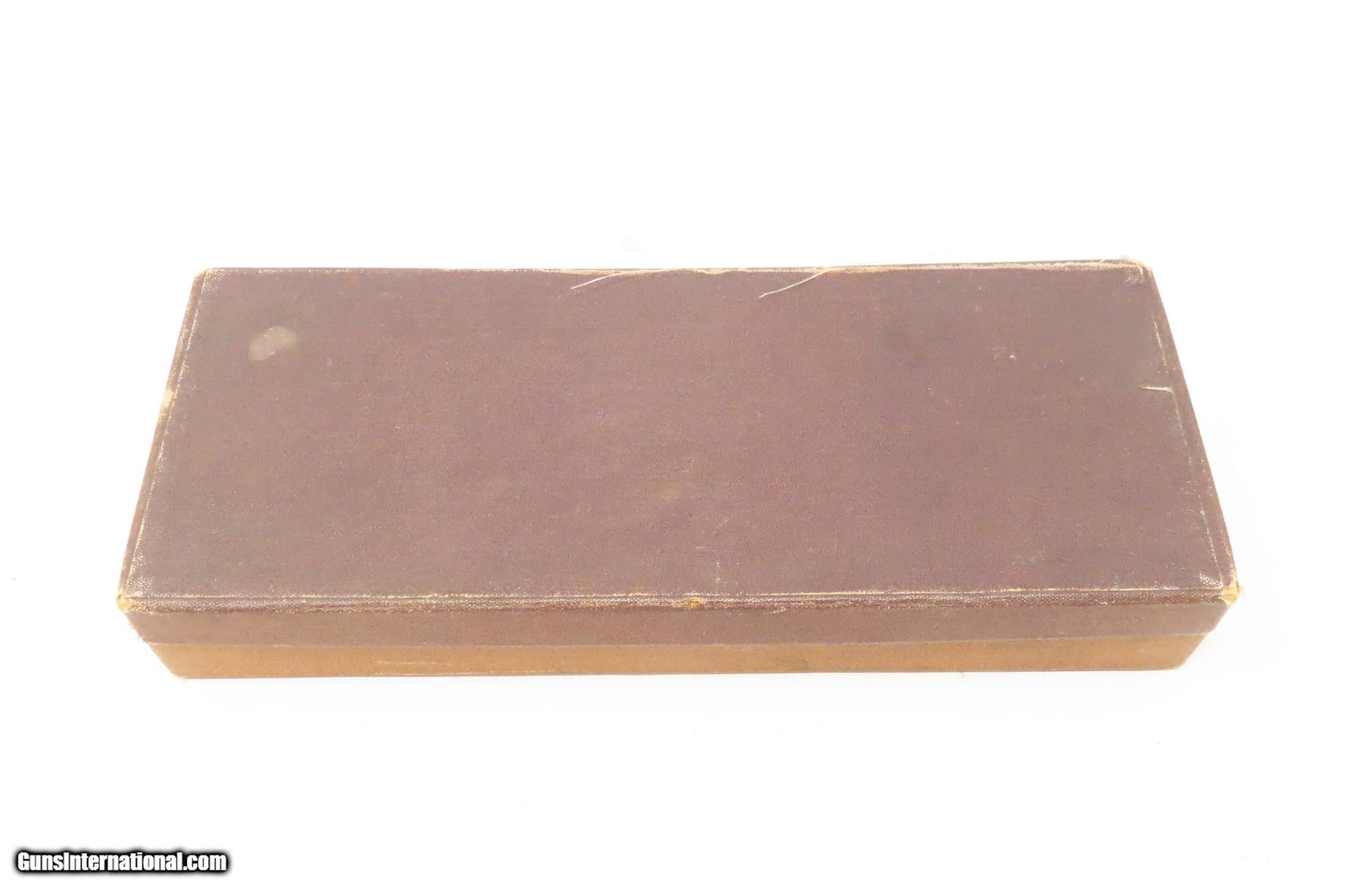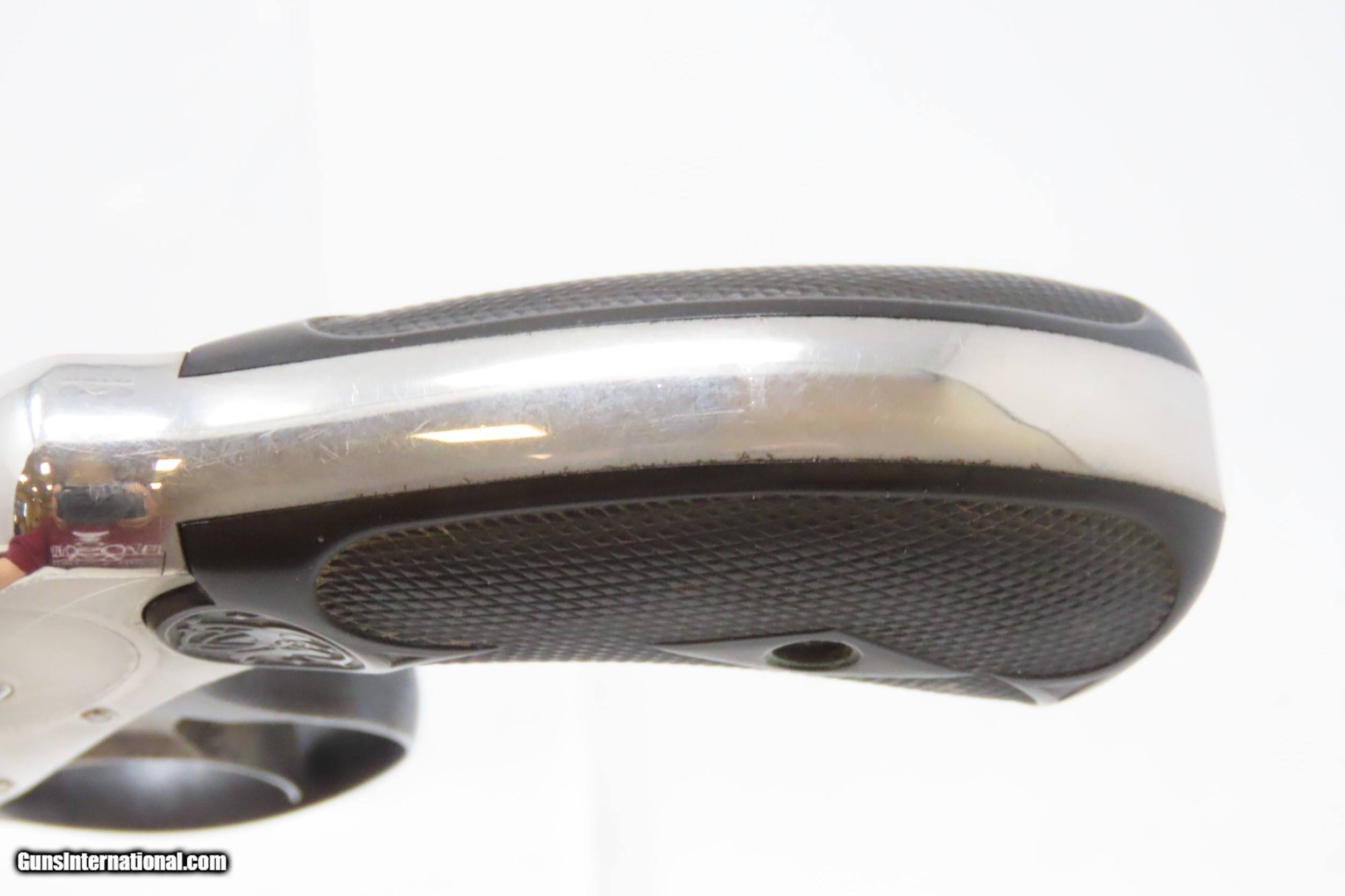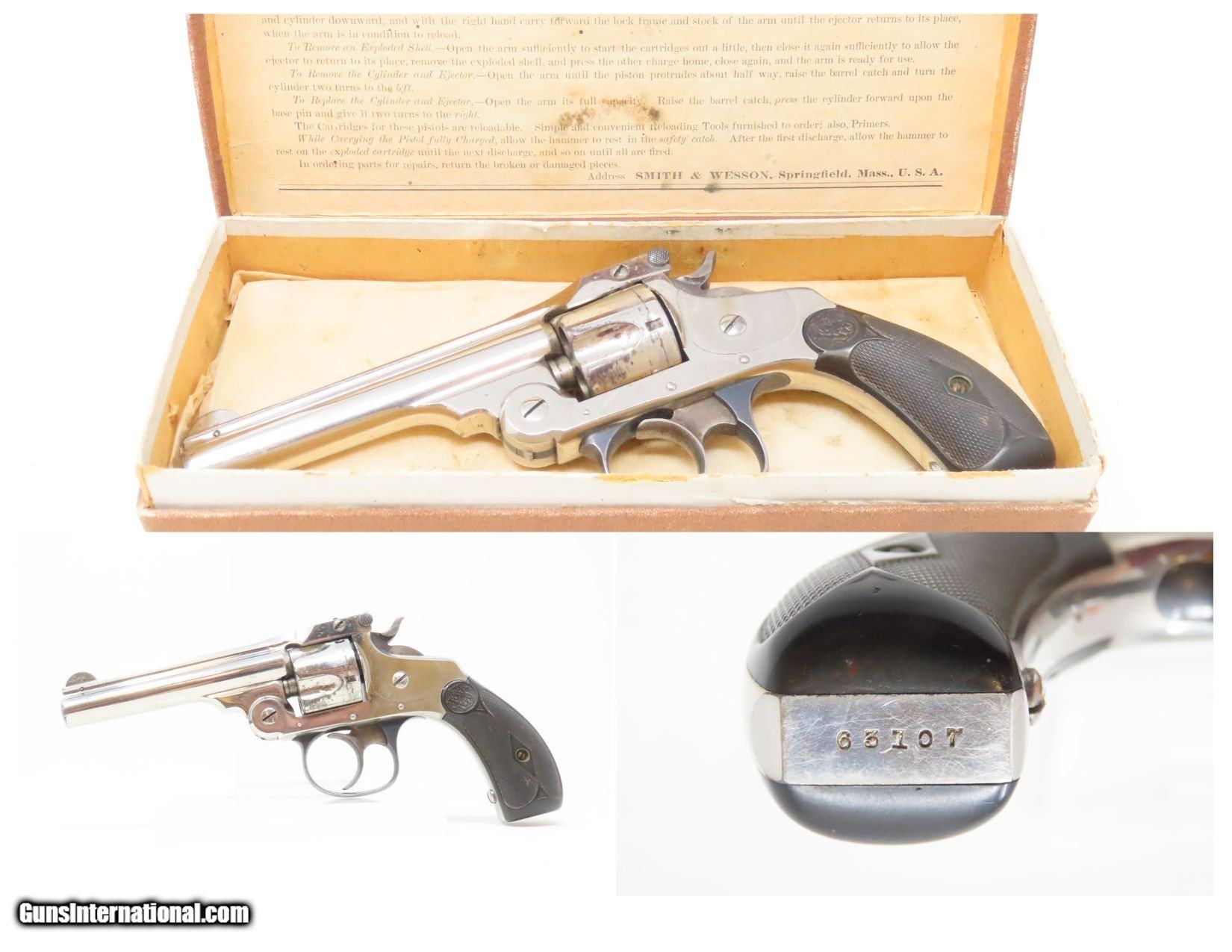 Description: Antique SMITH & WESSON .32 Caliber S&W 4th Model Revolver with FACTORY BOX NICKEL PLATED .32 S&W Top Break Revolver! Here we present an antique Smith & Wesson Double Action Revolver in .32 S&W, made circa 1885 in Springfield, Massachusetts. The 4th model was made between 1883 and 1909 with a total of roughly 240,000 revolvers made. The fourth model ran from serial number 43,406 and continued to about 282,999. Improvements in the 4th model were in the trigger guard, and internal changes in the shape of the sear and the cylinder stop. At the end of the 4th model production about 10,000 guns of the 5th model used some parts from both. These revolvers featured 3 and 3-1/2 inch barrels, but additional barrel lengths of 8″ and 10″ were offered and sold. This would have been a nice gun to wear in a small belt holster or slip into a pocket for self-defense. Smith & Wesson, then as now, were known for their high quality revolvers. The overall condition is very good. Original nickel finish preserved. The bore is bright. In double action the functionality is excellent, while in single action the hammer can be pushed out of cock. Both grips are in good shape. Numbers match. The original box is included. Own the original! This is a legitimate antique and not a reproduction. Barrel is 3-1/2 inches. Caliber: .32 S&W Overall condition as seen in photos. Very Fast. Very Safe. FREE SHIPPING WORLDWIDE. Delivered directly to your door by express mail! Guaranteed AUTHENTIC & Includes CERTIFICATE OF AUTHENTICITY. ancestryguns $1400 #217449 SOLD Antique: Yes |