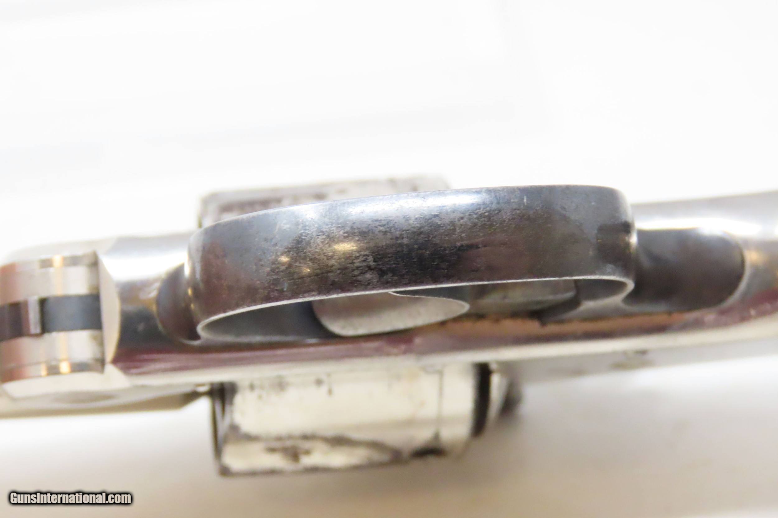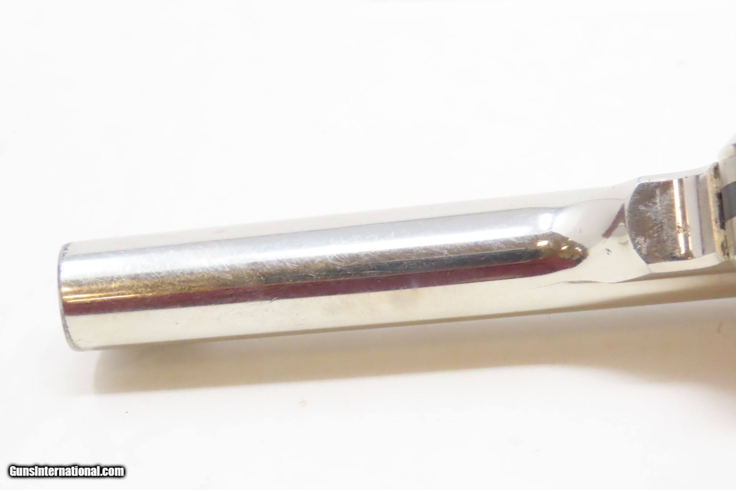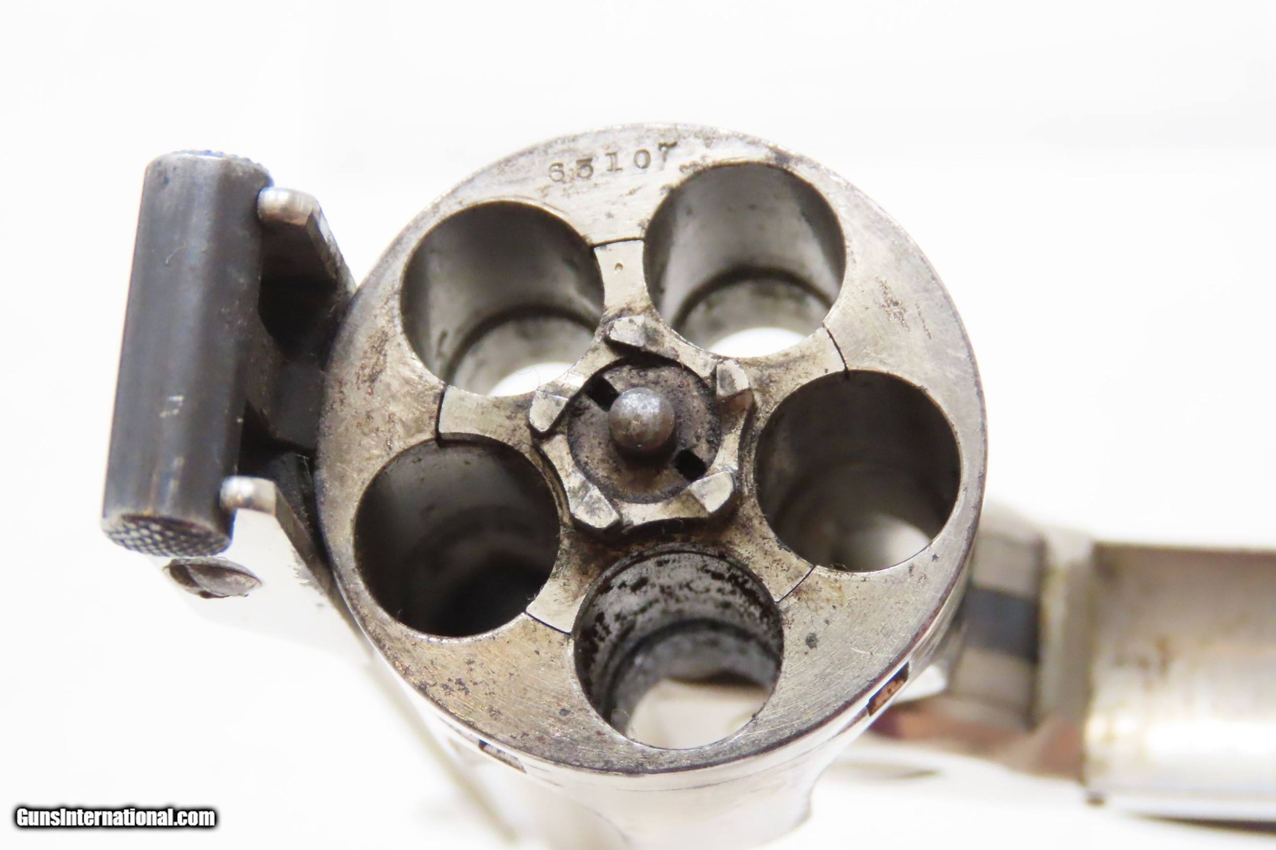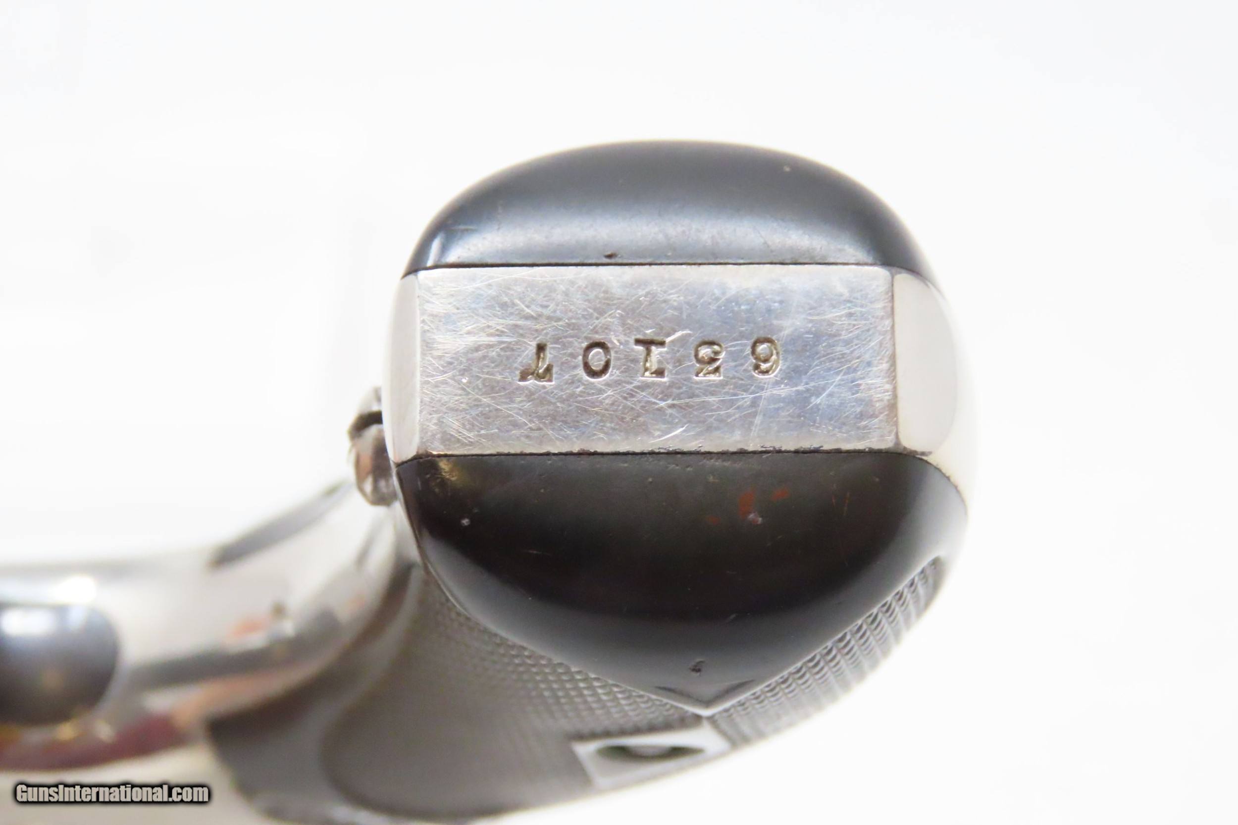 Description: Antique SMITH & WESSON .32 Caliber S&W 4th Model Revolver with FACTORY BOX NICKEL PLATED .32 S&W Top Break Revolver! Here we present an antique Smith & Wesson Double Action Revolver in .32 S&W, made circa 1885 in Springfield, Massachusetts. The 4th model was made between 1883 and 1909 with a total of roughly 240,000 revolvers made. The fourth model ran from serial number 43,406 and continued to about 282,999. Improvements in the 4th model were in the trigger guard, and internal changes in the shape of the sear and the cylinder stop. At the end of the 4th model production about 10,000 guns of the 5th model used some parts from both. These revolvers featured 3 and 3-1/2 inch barrels, but additional barrel lengths of 8″ and 10″ were offered and sold. This would have been a nice gun to wear in a small belt holster or slip into a pocket for self-defense. Smith & Wesson, then as now, were known for their high quality revolvers. The overall condition is very good. Original nickel finish preserved. The bore is bright. In double action the functionality is excellent, while in single action the hammer can be pushed out of cock. Both grips are in good shape. Numbers match. The original box is included. Own the original! This is a legitimate antique and not a reproduction. Barrel is 3-1/2 inches. Caliber: .32 S&W Overall condition as seen in photos. Very Fast. Very Safe. FREE SHIPPING WORLDWIDE. Delivered directly to your door by express mail! Guaranteed AUTHENTIC & Includes CERTIFICATE OF AUTHENTICITY. ancestryguns $1400 #217449 SOLD Antique: Yes |