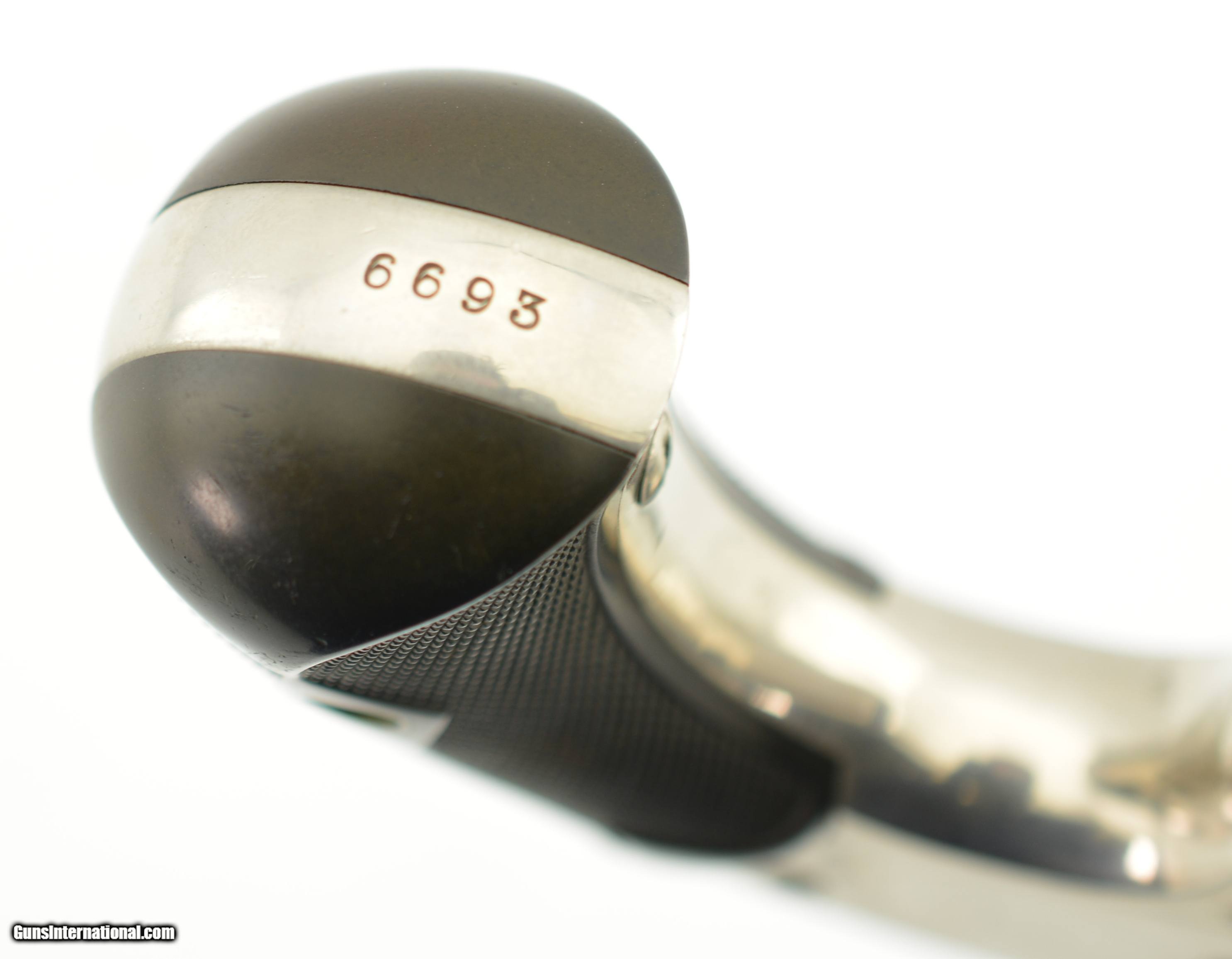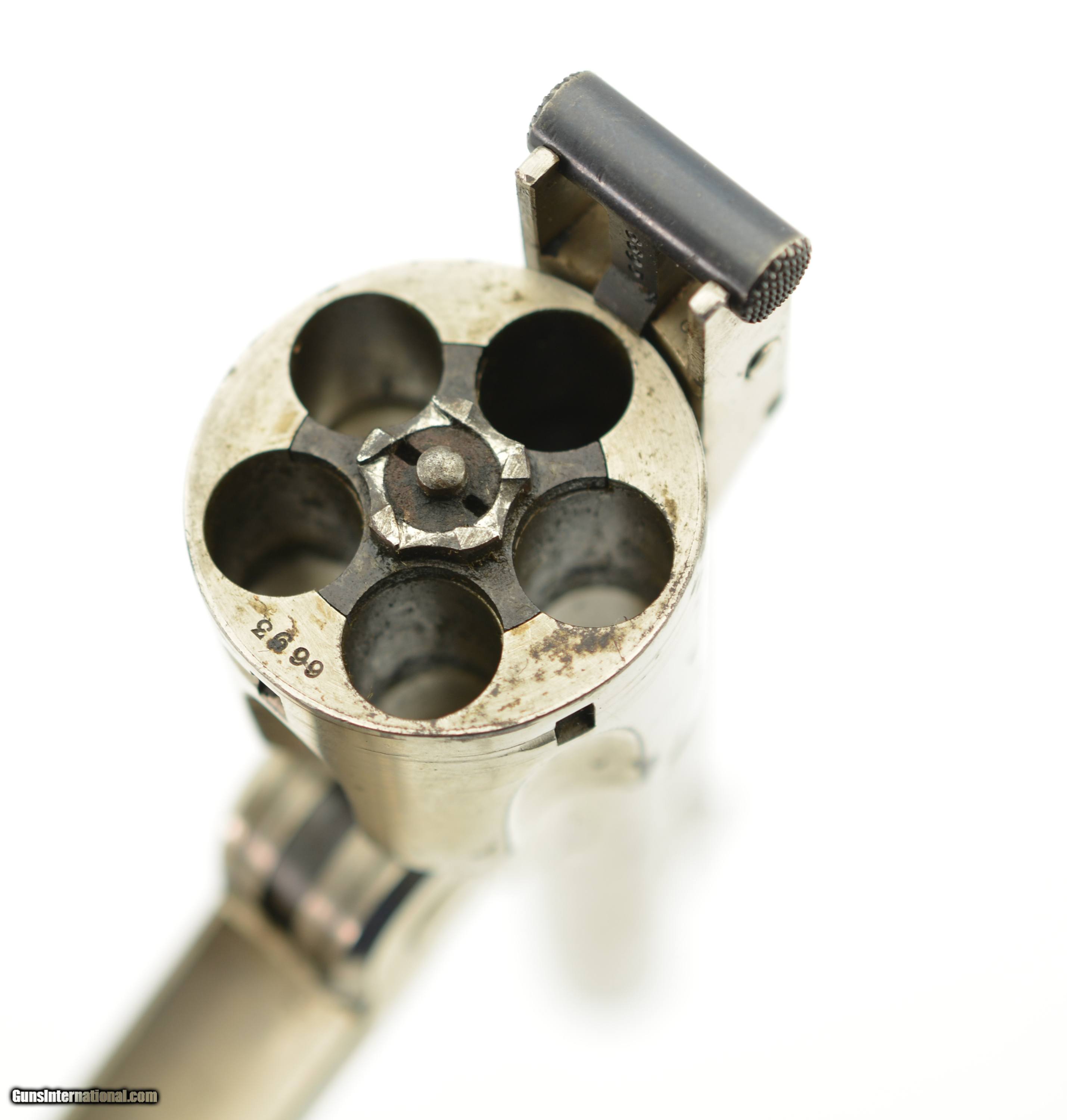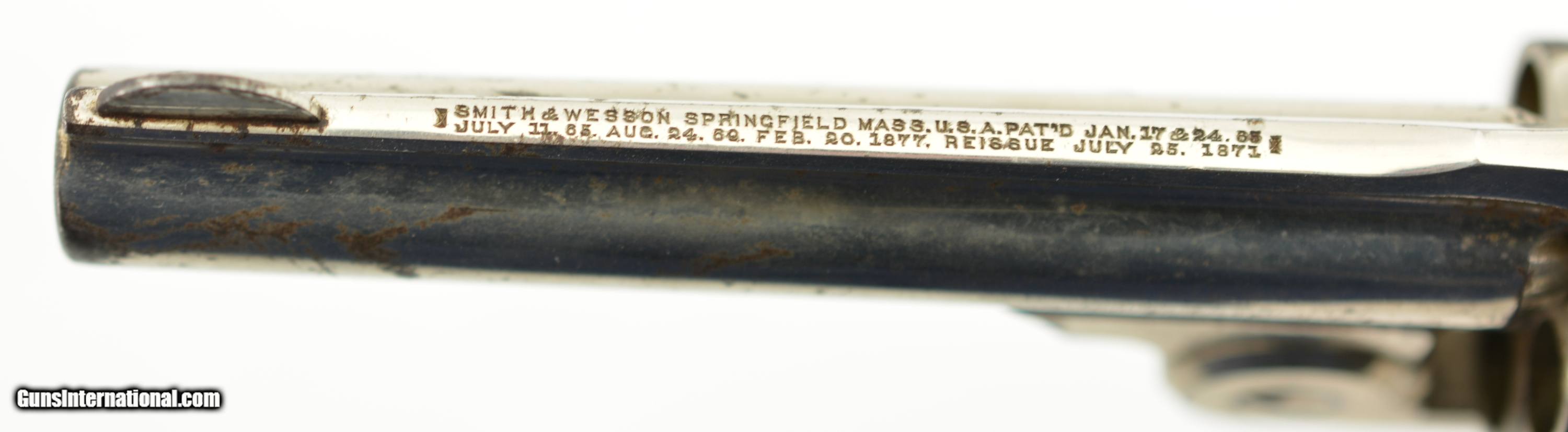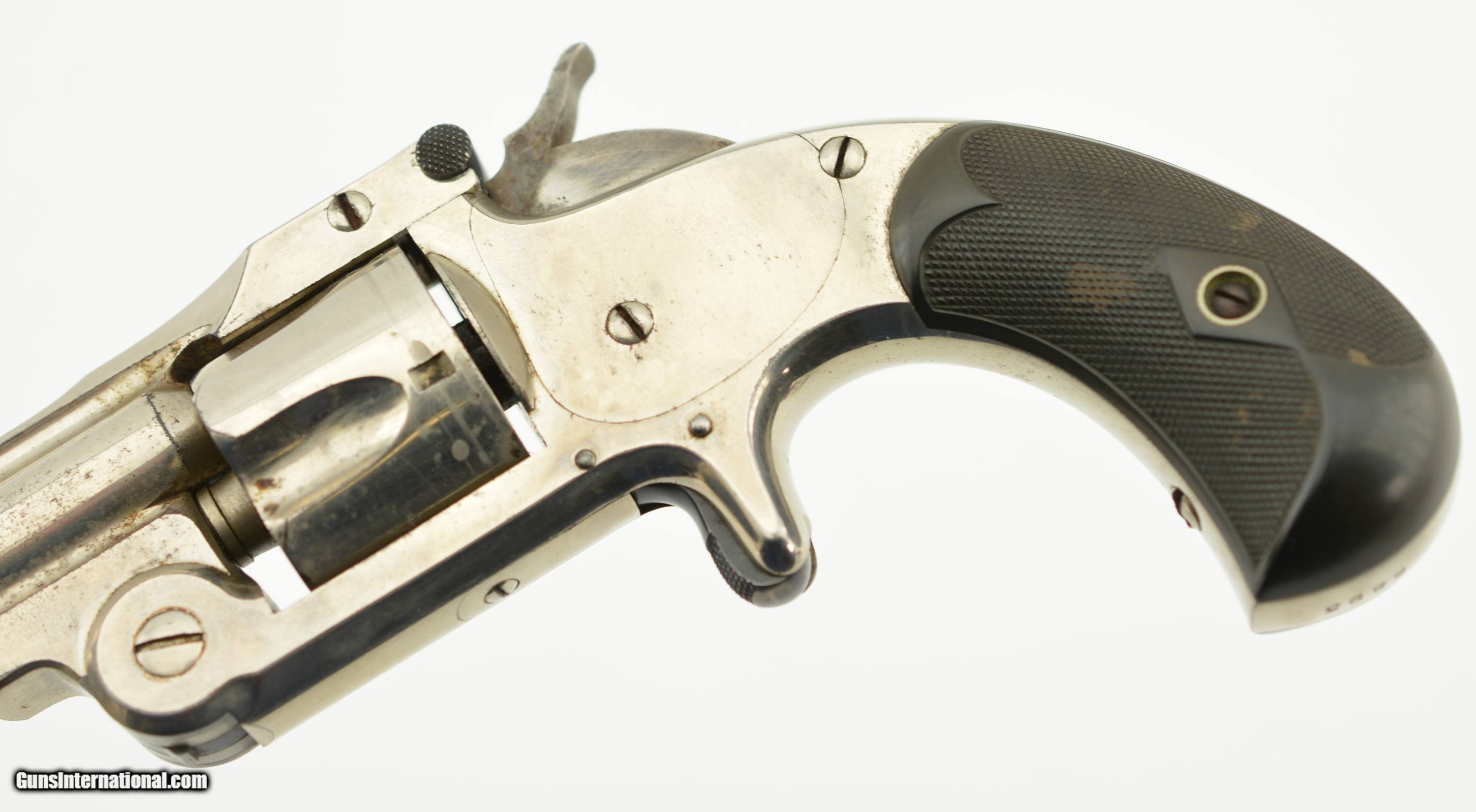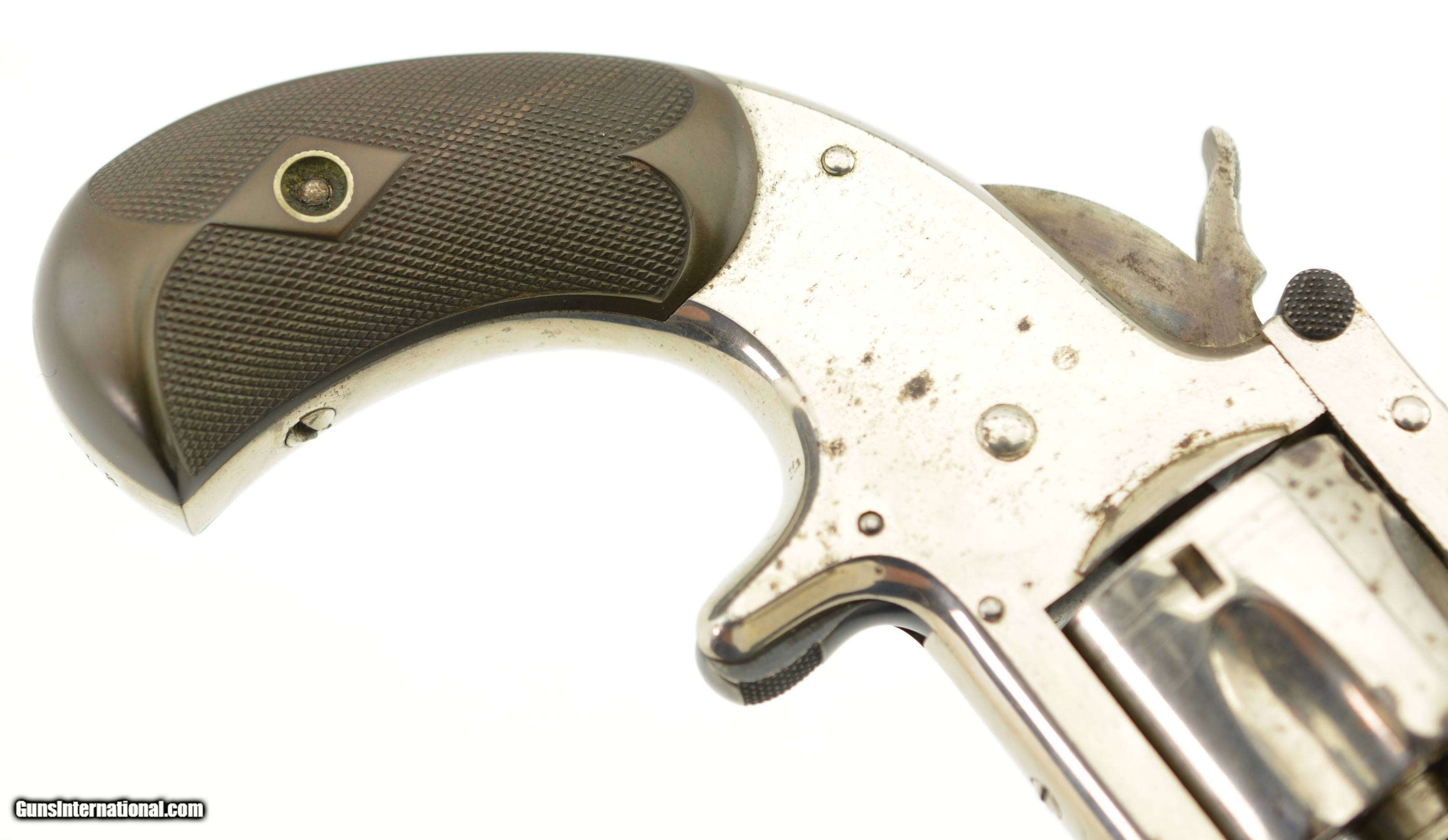 Description: Serial #6693, 32 S&W, 3 1/2" barrel with light scattered oxidized pitting in the bore. This is the model 1-1/2 Single Action Revolver (32 Single Action) manufactured by Smith and Wesson from 1878-1892 and was S&W's first 32 caliber revolver with automatic ejection. This lovely little, near excellent, gun has strong original nickel plate retaining perhaps 96-97% showing scattered light oxidation blemishes, a few minor pinprick pits near the muzzle and handling marks. The hammer retains very strong case-hardened colors with operational wear, the spur trigger has toned to gray. The diamond checkered hard rubber grips are in excellent condition and pencil numbered to the gun. This early “later" model features a strain screw, includes the 1877 patent date, and all appropriate parts are correctly numbered to the gun. The barrel-to-frame fit is tight, the action is crisp with correct timing and lock up. A nice example of No. 1 1/2. Antique SOLD Antique: Yes Manufacturer: S&W Model: 1 1/2 Caliber Info: .32 S&W Gauge Info: .32 S&W |