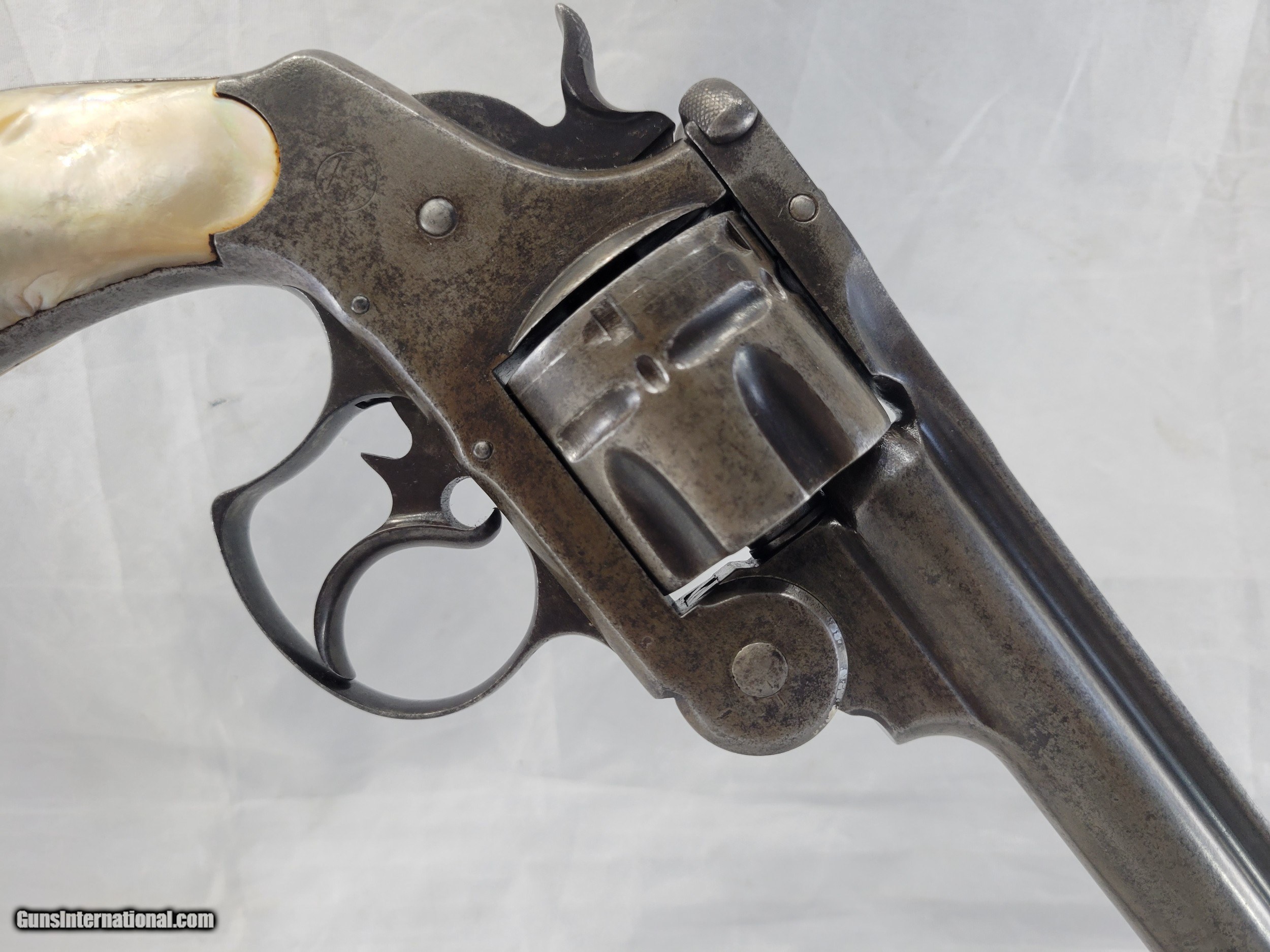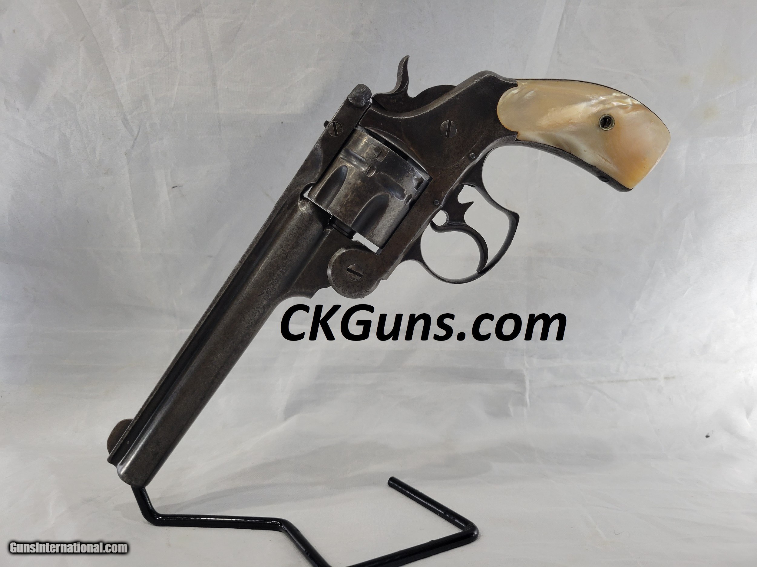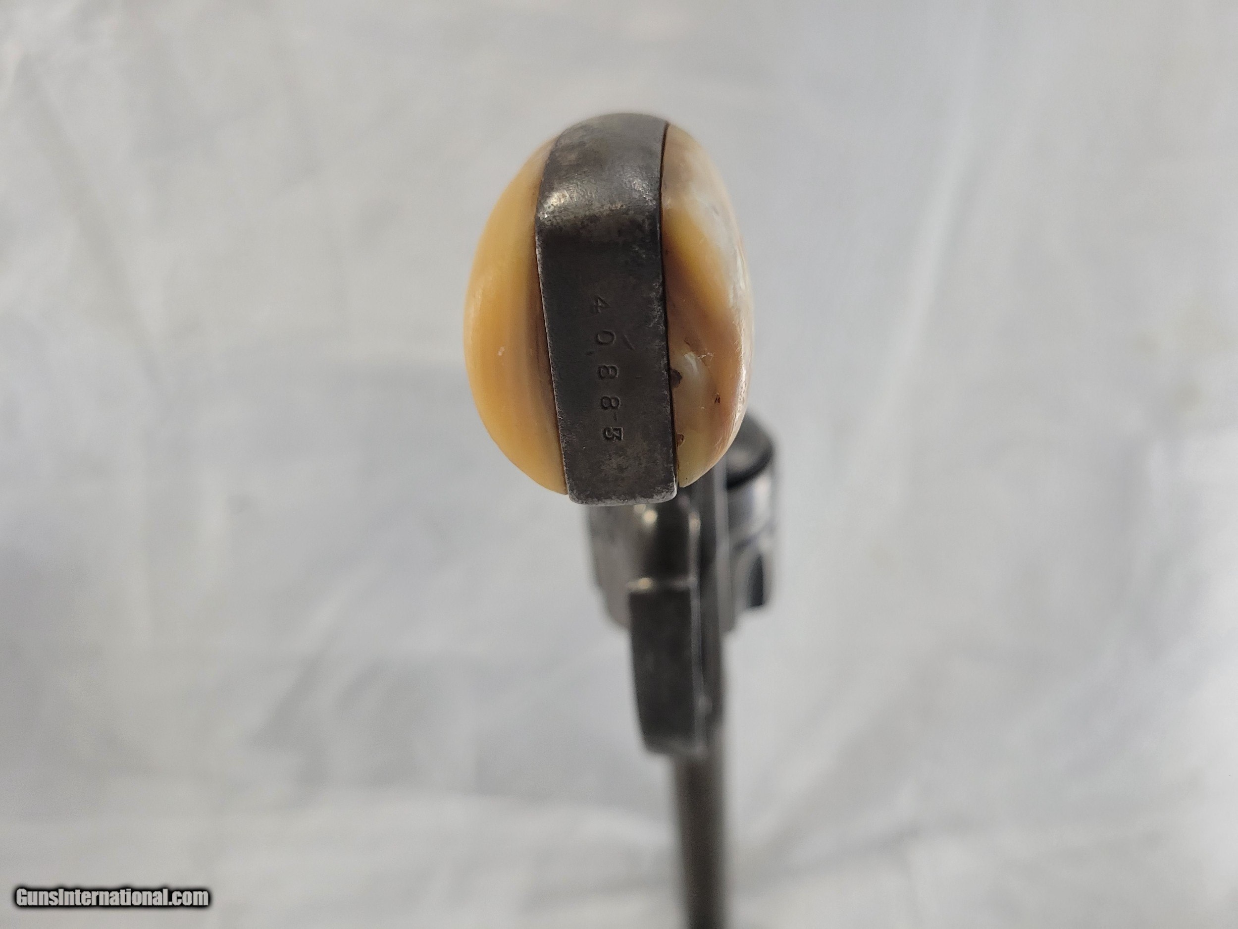 Description: INV 10618 AWESOME SMITH & WESSON MDL. DOUBLE ACTION FRONTIER CAL. .44 RUSSIAN SER. 40883. BEEN THERE AND DONE THAT. THIS OLD DOUBLE ACTION COWBOY GUN RETAINS ABOUT NONE OF ITS ORIGINAL FINISH. WHATS REMAINING IS ALONG THE BARREL RECESSES WITH SMALL PITS THROUGHOUT THE ENTIRE GUN. THE GUN BARES THE SMITH AND WESSON LOGO ON THE LEFT SIDE AND THE SMITH AND WESSON PATENT DATES ALONG THE TOP OF THE BARREL. THE PEARL GRIPS HAVE CHIPS WITH SOME LIGHT DINGS AND SCRATCHES. THE GUN FUNCTIONS FLAWLESSLY BUT THE ACTION IS LOOSE IN THE FRAME AND THE CYLINDER HAS SOME WOBBLE. THE BORE IS BRIGHT AND SHNIY WITH FROST THROUGHTOUT. ALL VISIBLE SERIAL NUMBERS MATCH. A GREAT WALL HANGER FOR THE MAN CAVE OR FOR SOMEONE WHO WANTS AN OLD PROJECT.. MODESTLY PRICED AT.... $895. To purchase this firearm or if you want to request more information contact us at: Email ckguns[at]ymail[dot]com Phone 201-512-0002 Cell 201-575-6838 FAX 201-215-4759 We accept most major credit cards. Prices shown are Discounted 3% for Cash or Check. The buyer must be familiar with all the laws governing the purchase and the ownership of firearms in their own city and state. The Yankee Armorer, Inc is not responsible for any failure to comply with or observe these laws. The Yankee Armorer, Inc will only ship after full payment and receipt of all required documents. Shipping: Add $35.00 for handguns, $45.00 for long guns. New Jersey buyers are subject to a 7% sales tax. The Yankee Armorer, Inc offers a 3 day inspection period with full refund upon return of intact firearm and in the original condition. The Yankee Armorer, Inc offers a no interest lay away program - 25% down; 25% in 30 days; 25% in 60 days; and full payment in 90 days. Any violation of this policy is subject to restocking and forfeiture of all payments. Any variation from this policy must be agreed to in advance. Unshipped Cancelled sales are subject to a 20% restocking fee. Be advised that all firearms sold by The Yankee Armorer, Inc. or the Gun Exchange, LLC (SELLER) are sold as collector’s items. They have not been fired or tested for safety and must be examined by a license gunsmith prior to use. By purchasing any item from the (SELLER), you are agreeing to hold the (SELLER) free from any damages or lawsuits of any nature. Any item left for transfer or storage will be charged to $25.00 per month, per item from the day of its receipt. Any variation from this policy must be agreed to in advance. Store hours 10:00 am to 5:00 pm Tuesday -Saturday. It's always best to call for appointment. Store 201-512-0002, cell 201-575-6838. SOLD |