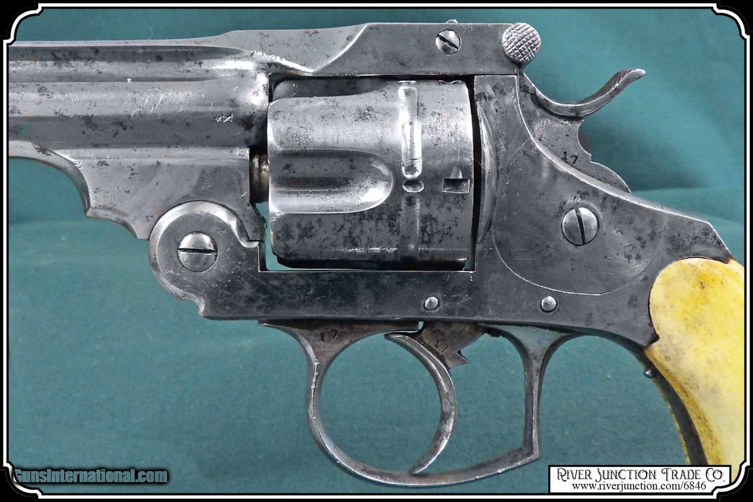 Description: Copy of a Smith & Wesson Double Action with original antique holster and Stag grips. An early Belgium Copy of a Smith & Wesson pocket Fourth Model Double Action Revolver in .38 Short. Shows several proof marks on the back of the cylinder. It has the number 17 on the trigger, trigger guard and the hammer. The barrel measures 3 1/4 inches and has a bright clean strongly rifled bore. This is a top-break, single action pulls a little hard over one chamber, the double action functions very well, as it should. The lock-up is tight. This is a 5 shot revolver based on the S&W Patent. The nickel plated finish is smooth with some dark spots and displays well as you can see. The STAG grips are interesting feature. The grips are in very good condition with no cracks or chips. You can find these advertised in the Sears & Roebuck and Montgomery catalogs of the 1880s. This is an ANTIQUE and can be shipped directly to you. Sold as an Antique ~ no guarantees, warranties, or liabilities for any actual usage. If any firearms are to be used for shooting purposes, a qualified gunsmith should inspect them first. The included holster is in very good using condition with fully alive leather. It has a few missing stitches in the trigger guard area. Payment: This antique can be shipped DIRECTLY to you. You can order online. WE DO NOT CHARGE ANY CREDIT CARD FEE. Order with a credit card or pay-pal on our site. Just click on the blue link above “Visit Our ” and paste the four digit numerals into the search box. Before you checkout you will see shipping cost and total. OR If you prefer: Pay by cash, postal money order, cashiers check, personal & business checks. We wait for checks to clear. We always answer questions and entertain offers. Have questions? Call me 563-880-4588. Jim SOLD |