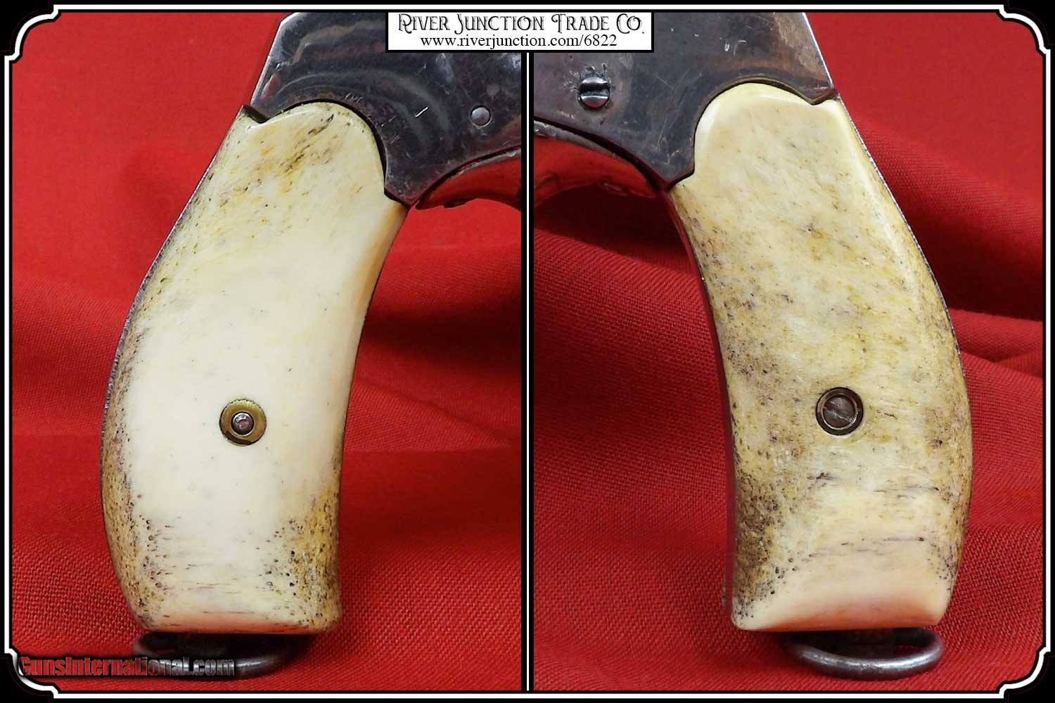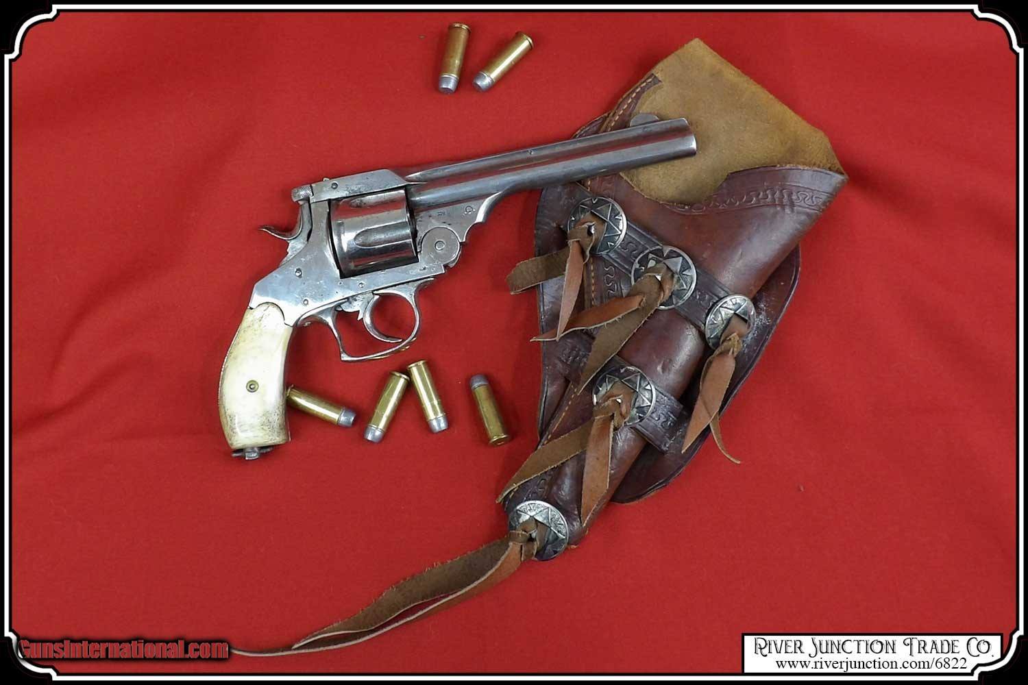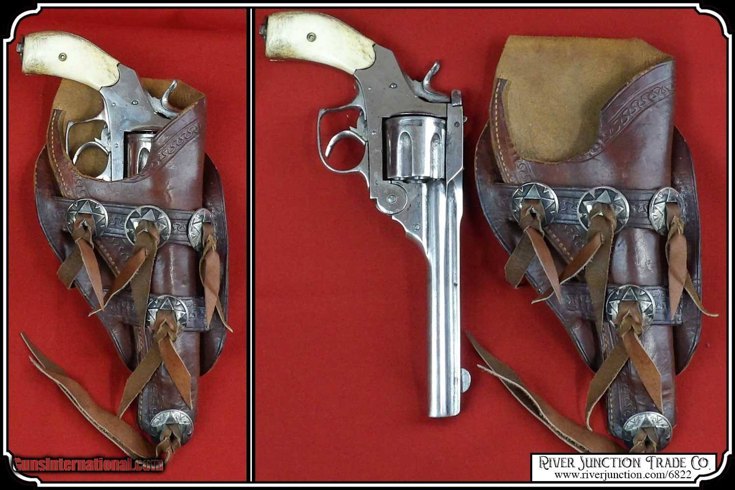 Description: Copy of a Smith & Wesson Double Action Frontier Mod. Chambered for .44-40 Win. Caliber. with original antique Wild West holster An early Belgium Copy of a Smith & Wesson Frontier First Model Double Action Revolver in .44 WCF (.44-40 Winchester cartridge). It is so marked on the left side of the frame. (W.C.F.) that stands for Winchester Center Fire. Also shows several proof marks on the back of the cylinder as well as more proof marks and the country of manufacture "BELGIUM", on the right side of the barrel. It has no serial number anywhere I can find. The barrel measures 6 inches and has a bright clean strongly rifled bore. This is a top-break, auto-eject, double action six shot revolver based on the S&W Patent Style. The action functions perfectly, strong hammer spring and lock-up is tight, single action also works well. There is very little pitting or rust on this nickel plated gun, with a smooth finish. The BONE grips and lanyard ring are interesting features. The grips are in very good condition with no cracks or chips likely a bunk house addition. You can find these advertised in the Sears & Roebuck and Montgomery catalogs of the 1880s. This is an ANTIQUE and can be shipped directly to you. Sold as an Antique ~ no guarantees, warranties, or liabilities for any actual usage. If any firearms are to be used for shooting purposes, a qualified gunsmith should inspect them first. The included holster is in very good using condition with fully alive leather no missing stitches. As you can see the trigger guard area has been cut to allow a faster draw. Payment: Item, can be ordered on line with a credit card or paypal on our sight. Just Google (riverjunction) and type in the River Junction Trade Co. item number (6822) in the search box. Before you checkout you will see shipping cost and total. OR If you prefer: Pay by cash, postal money order, cashiers check, personal & business checks. We wait for checks to clear. We always answer questions and entertain offers. Have questions? Call me 563-880-4588. Jim SOLD |