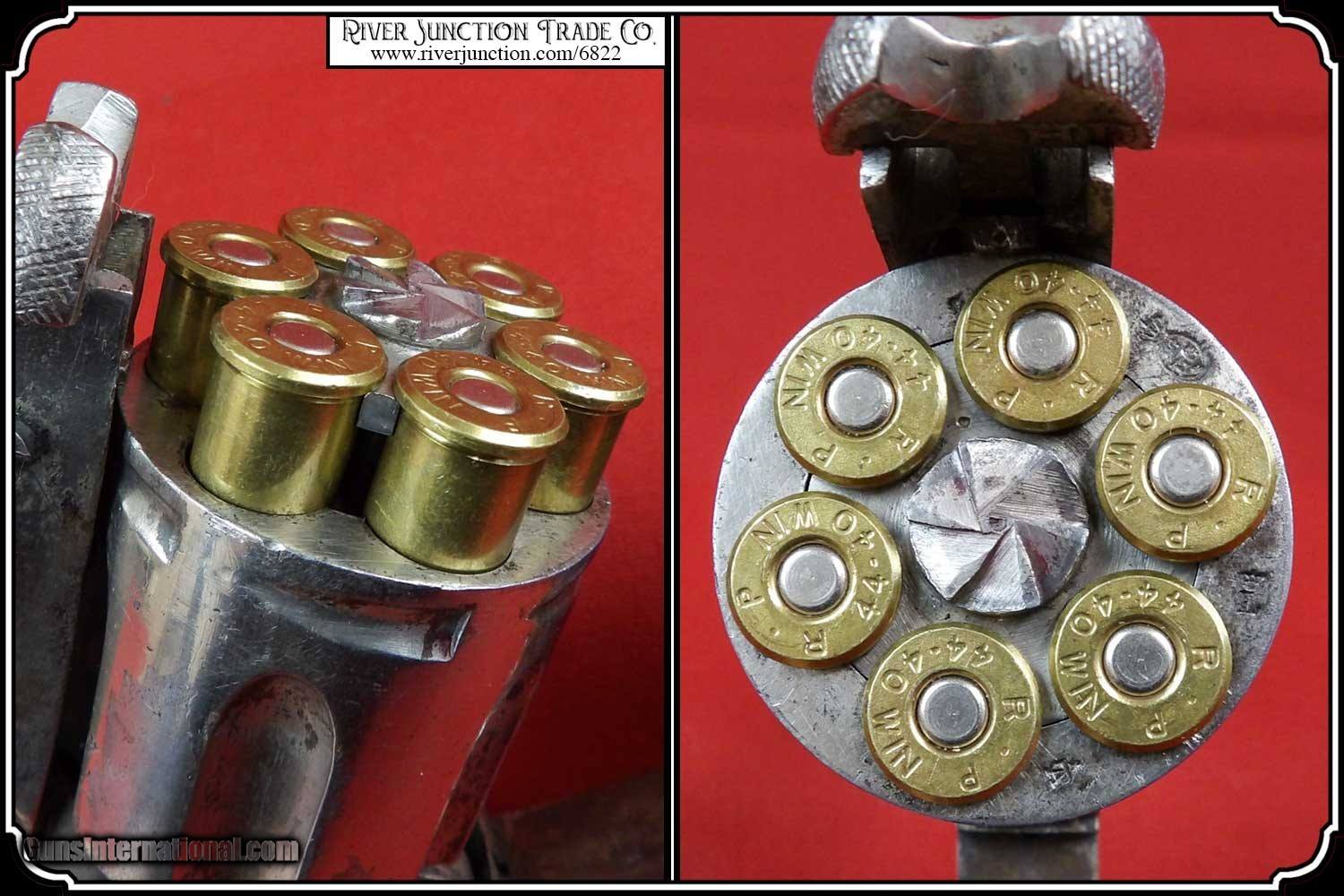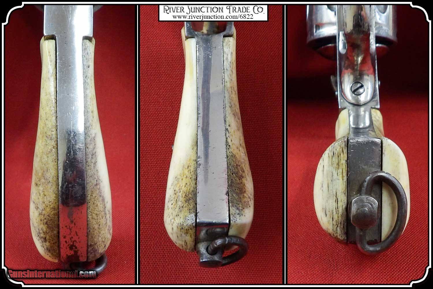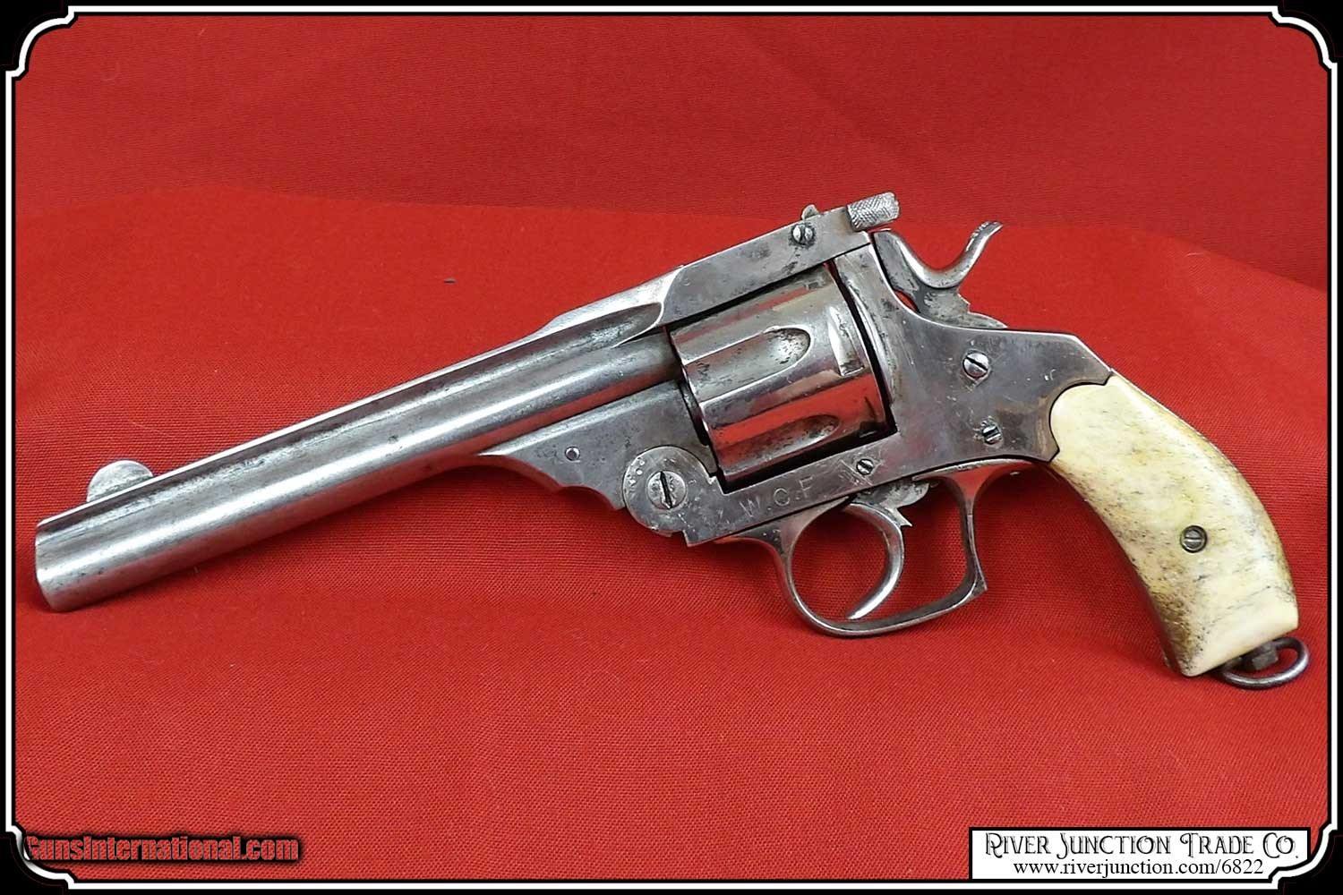 Description: Copy of a Smith & Wesson Double Action Frontier Mod. Chambered for .44-40 Win. Caliber. with original antique Wild West holster An early Belgium Copy of a Smith & Wesson Frontier First Model Double Action Revolver in .44 WCF (.44-40 Winchester cartridge). It is so marked on the left side of the frame. (W.C.F.) that stands for Winchester Center Fire. Also shows several proof marks on the back of the cylinder as well as more proof marks and the country of manufacture "BELGIUM", on the right side of the barrel. It has no serial number anywhere I can find. The barrel measures 6 inches and has a bright clean strongly rifled bore. This is a top-break, auto-eject, double action six shot revolver based on the S&W Patent Style. The action functions perfectly, strong hammer spring and lock-up is tight, single action also works well. There is very little pitting or rust on this nickel plated gun, with a smooth finish. The BONE grips and lanyard ring are interesting features. The grips are in very good condition with no cracks or chips likely a bunk house addition. You can find these advertised in the Sears & Roebuck and Montgomery catalogs of the 1880s. This is an ANTIQUE and can be shipped directly to you. Sold as an Antique ~ no guarantees, warranties, or liabilities for any actual usage. If any firearms are to be used for shooting purposes, a qualified gunsmith should inspect them first. The included holster is in very good using condition with fully alive leather no missing stitches. As you can see the trigger guard area has been cut to allow a faster draw. Payment: Item, can be ordered on line with a credit card or paypal on our sight. Just Google (riverjunction) and type in the River Junction Trade Co. item number (6822) in the search box. Before you checkout you will see shipping cost and total. OR If you prefer: Pay by cash, postal money order, cashiers check, personal & business checks. We wait for checks to clear. We always answer questions and entertain offers. Have questions? Call me 563-880-4588. Jim SOLD |