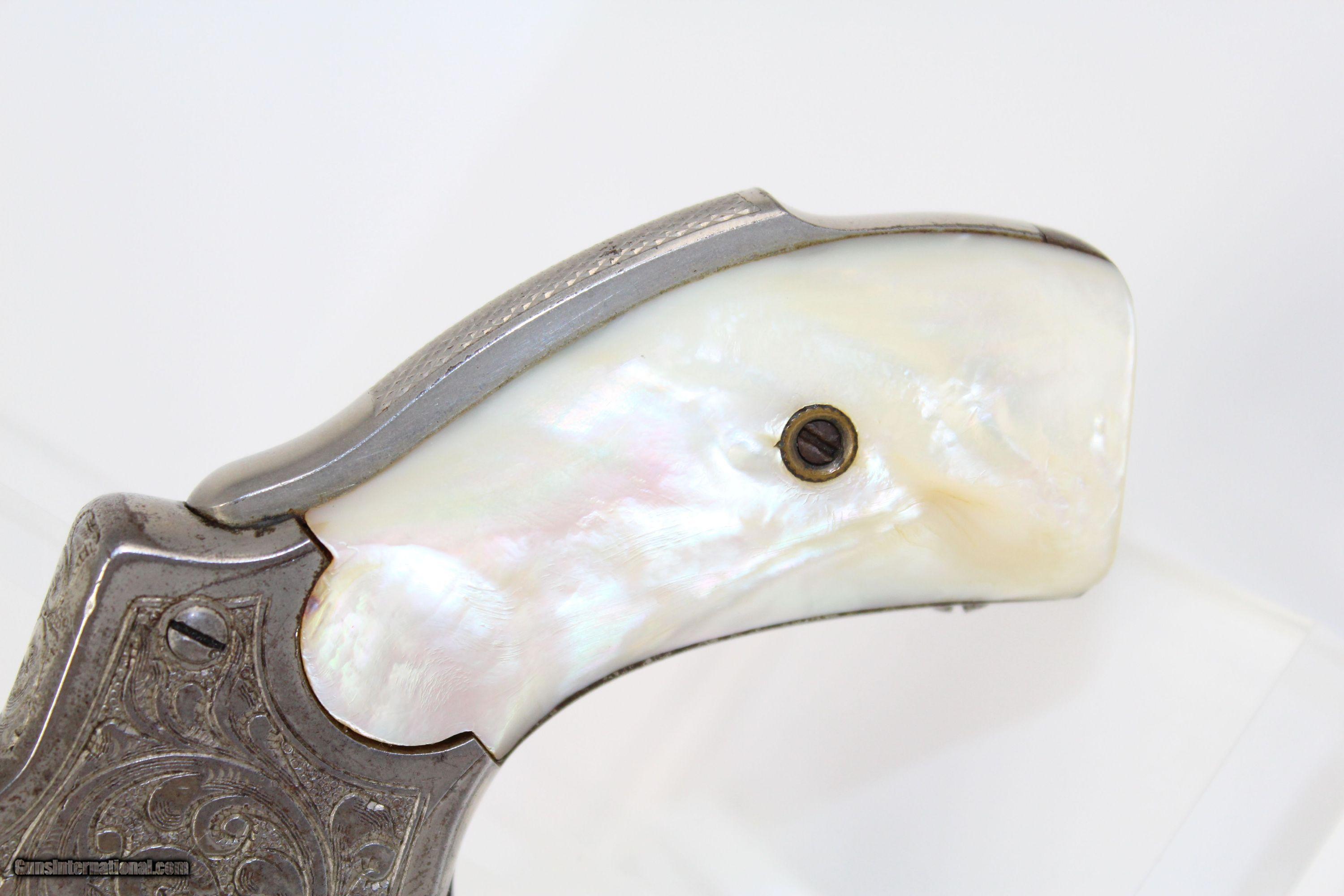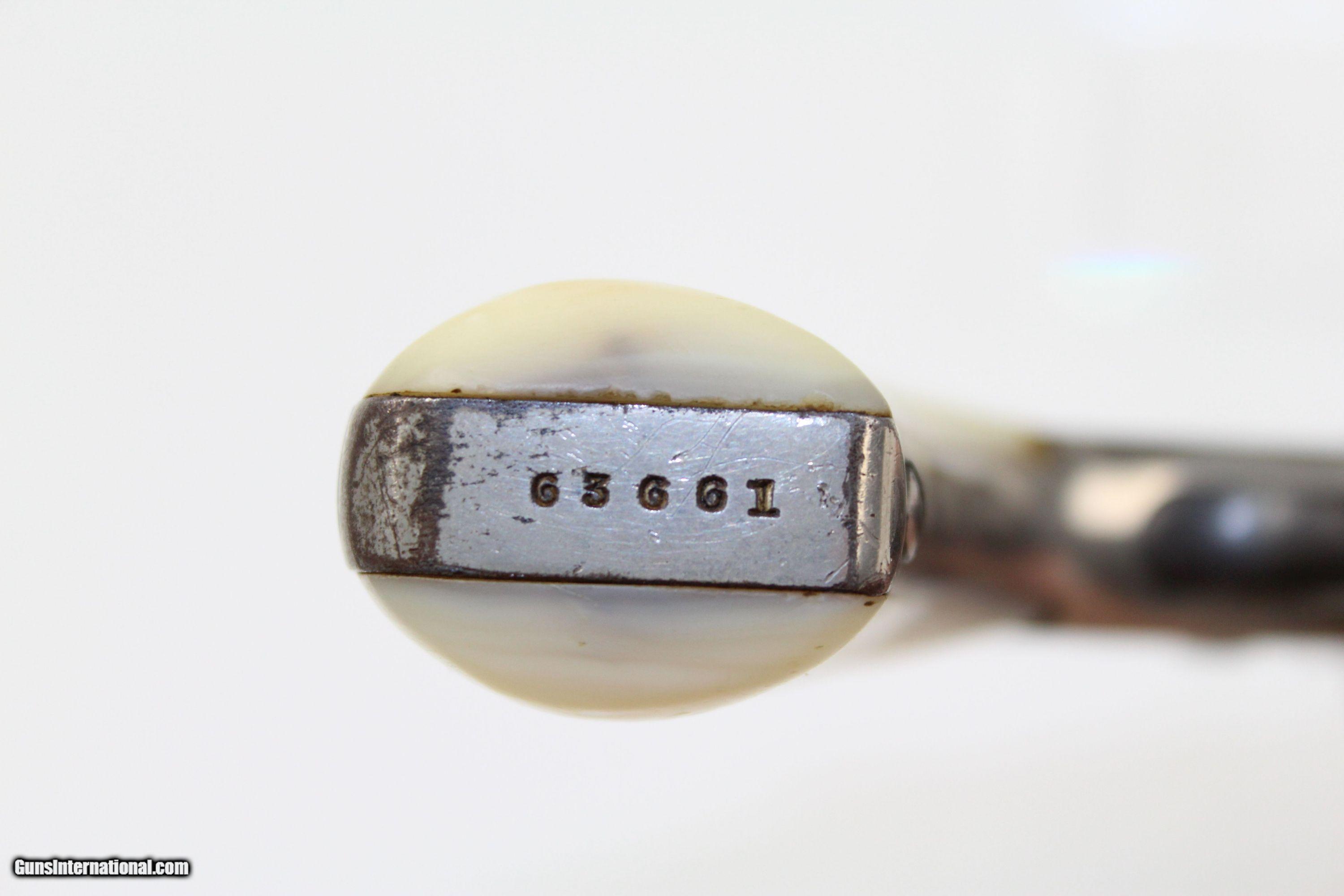 Description: ENGRAVED, Boxed S&W Antique “NEW DEPARTURE” Rev With Mother of Pearl Grips in Original Box! Here we present an antique Beautifully Engraved Smith & Wesson .38 New Departure Revolver, made circa 1891 in Springfield, Massachusetts. This 5-shot .38 S&W, top-break revolver was designed for self-defense and was very popular for the public. This specimen is gorgeously engraved and features Mother-of-Pearl grips, something not often seen, especially in the original box. The overall condition is very fine. The original nickel finish is 95%. The markings and engravings are clear. The grips are very good. The bore is clean and sharp. The action on this revolver is excellent. Own the original! This is a legitimate antique and not a reproduction. Barrel is 3-1/4 inches. Caliber: .38 S&W Overall condition as seen in photos. Very Fast. Very Safe. FREE SHIPPING WORLDWIDE. Delivered directly to your door by express mail! Guaranteed AUTHENTIC & Includes CERTIFICATE OF AUTHENTICITY. ancestryguns $1500 #6333 SOLD Antique: Yes |