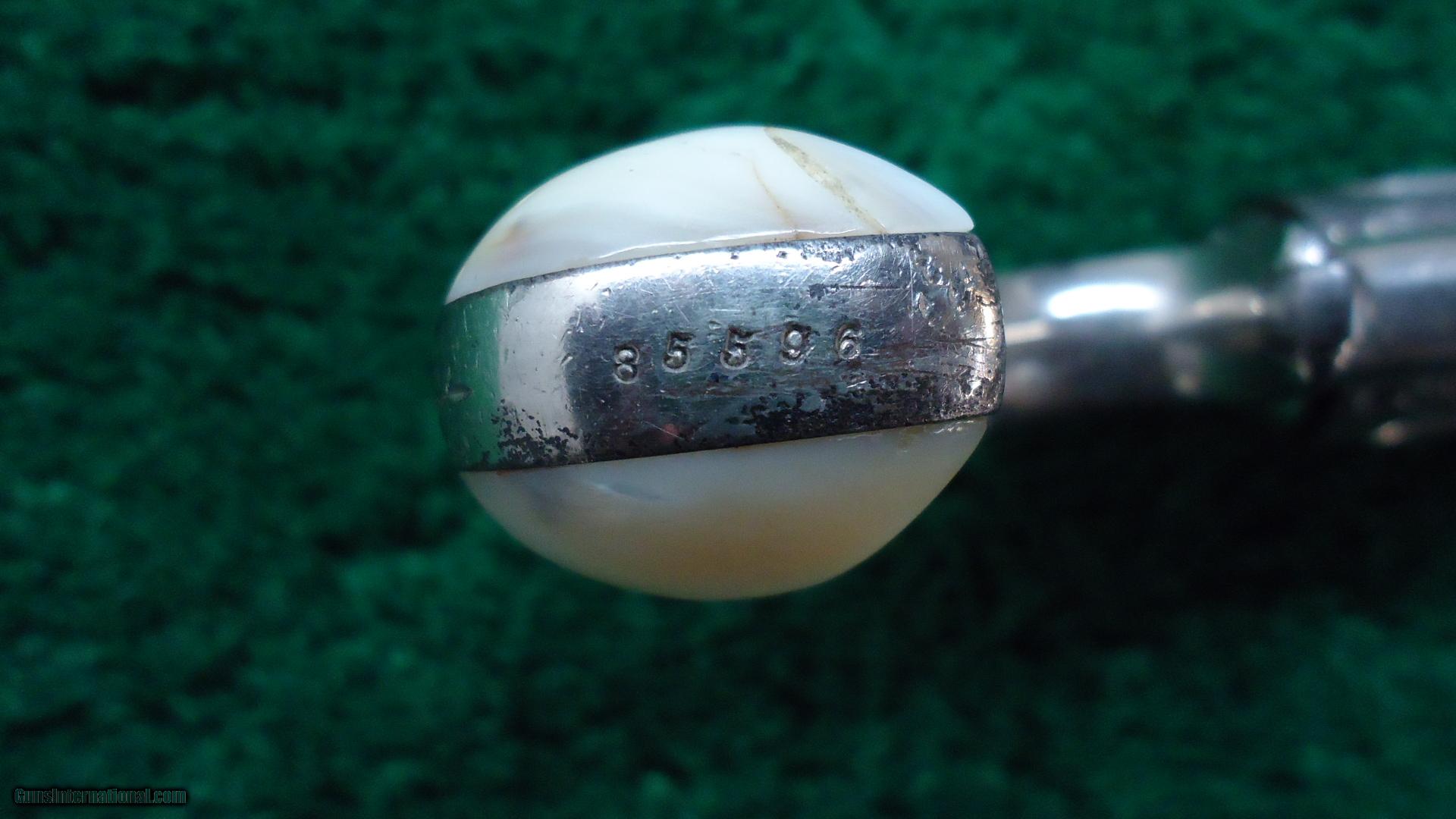 Description: Also known as "New Model 1-1/2". This is a nickel plated engraved revolver in 32 RF. Engraving is in the New York style with nearly full coverage. Most of the nickel remains with just some light wear and flaking. This gun has a very tight hinge pin and also positive lock-up. Action functions nicely. To top it off is the Mother of Pearl grips. There is a chip on the right hand grip that was repaired and is barely visible. Leroy Merz Antique Firearms specializes in antique and vintage Winchesters and other fine American firearms. Since 1965 Mr. Merz has taken part in the world of firearms and has been a contributor to many well known reference books. Just recently we mailed the 126th edition of our privately-published catalog. We have hundreds of additional guns in every price range at our home online. Search for Merz Antiques in google. SOLD Antique: Yes |