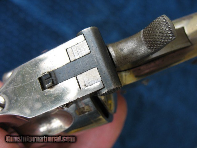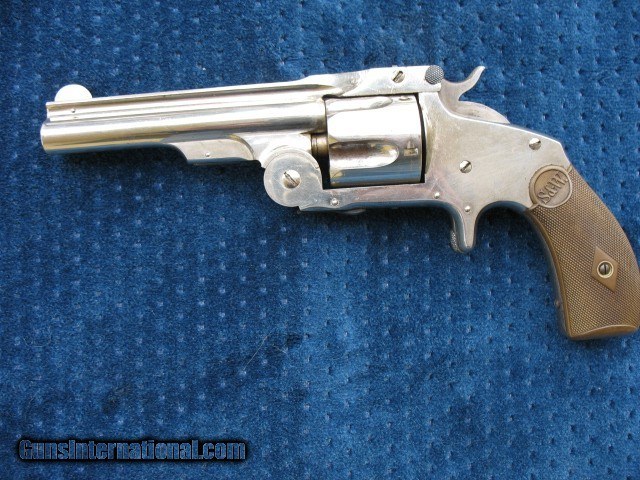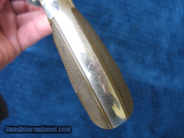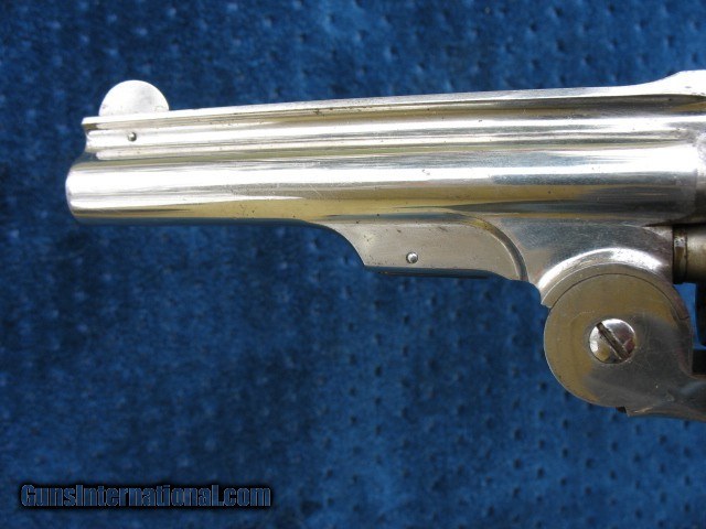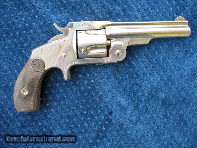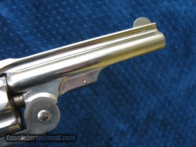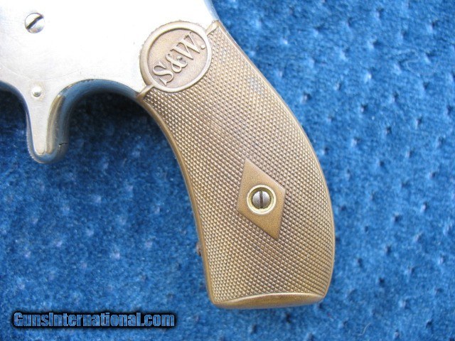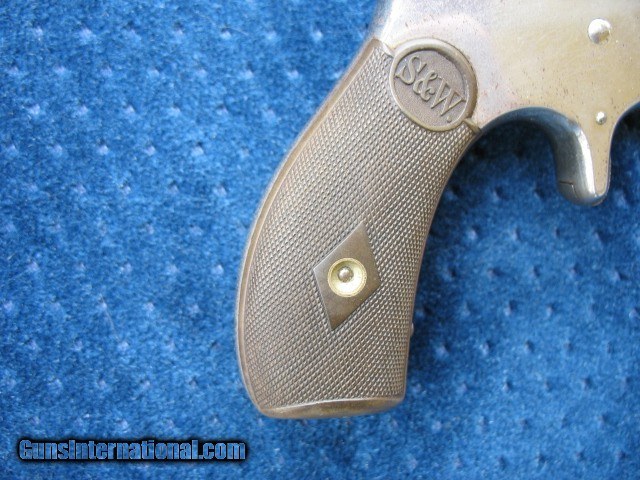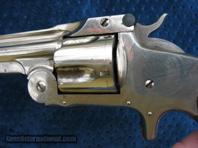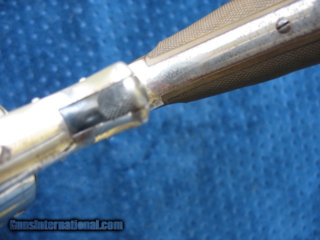 Description: SOLD...Antique Smith & Wesson 1st model Baby Russian.. Here is an excellent Smith & Wesson Baby Russian.. Caliber is the .38 S&W black powder of course.. Has the more harder to find 4” barrel.. The S/N is 6225 and all matching of course.. Only 25,548 of this model made from 1876 to 1877. As you can see this gun retains most all of the original nickel finish.. The barrel has 99% finish. The frame has 99% including the front and rear grip straps. The cylinder has about 90% with the finish loss being down in the flutes of the cylinder as you can see. The nickel finish is a little cloudy on the back strap from handling but has never been cleaned or polished on.. No pitting anywhere on the gun.. The finish is not flaking. The hammer has very nice case colors showing.. The barrel latch has 98% bright blue. The trigger even retains 80% bright blue.. Just missing the blue on the very bottom from light use.. The trip latch on the bottom of the frame has traces of blue.. The markings are excellent. Excellent front sight never filed on. The screw head slots look untouched but the latch screw shows some minor turning only. The mechanics are excellent.. Tight and crisp as a new gun.. Rock solid barrel to frame fit at the barrel latch and the barrel to frame hinge.. NO wobbles.. Cylinder locks up tight as new with NO cylinder movement.. Both hammer notched are correct and positive. Extractor works perfectly of course. You will not find a tighter gun than this.. The grips are excellent as well and show all the fine checkering with no wear or flattening.. NO cracks or chips and a perfect snap on factory fit.. They do show some light fading to a brownish color from exposure to the sun and very light handling. This also happens when a gun is displayed in direct sun light.. The bore is excellent with no pitting as expected showing excellent sharp rifling with just very minor frosting.. The cylinder chambers are excellent as well with no pitting. I think this gun has been fired very little as all of the nickel finish is present on the face of the cylinder. This little Smith would be hard to improve on unless you found a mint un fired one in the factory box. This one is absolutely good enough for a factory box if you have one or can find one for a 4” barrel.. Call 765-728-8049 with any questions or more photos.. $25 insured priority mail shipping and packed with care.. Don't miss this little jewel.. SOLD Antique: Yes |