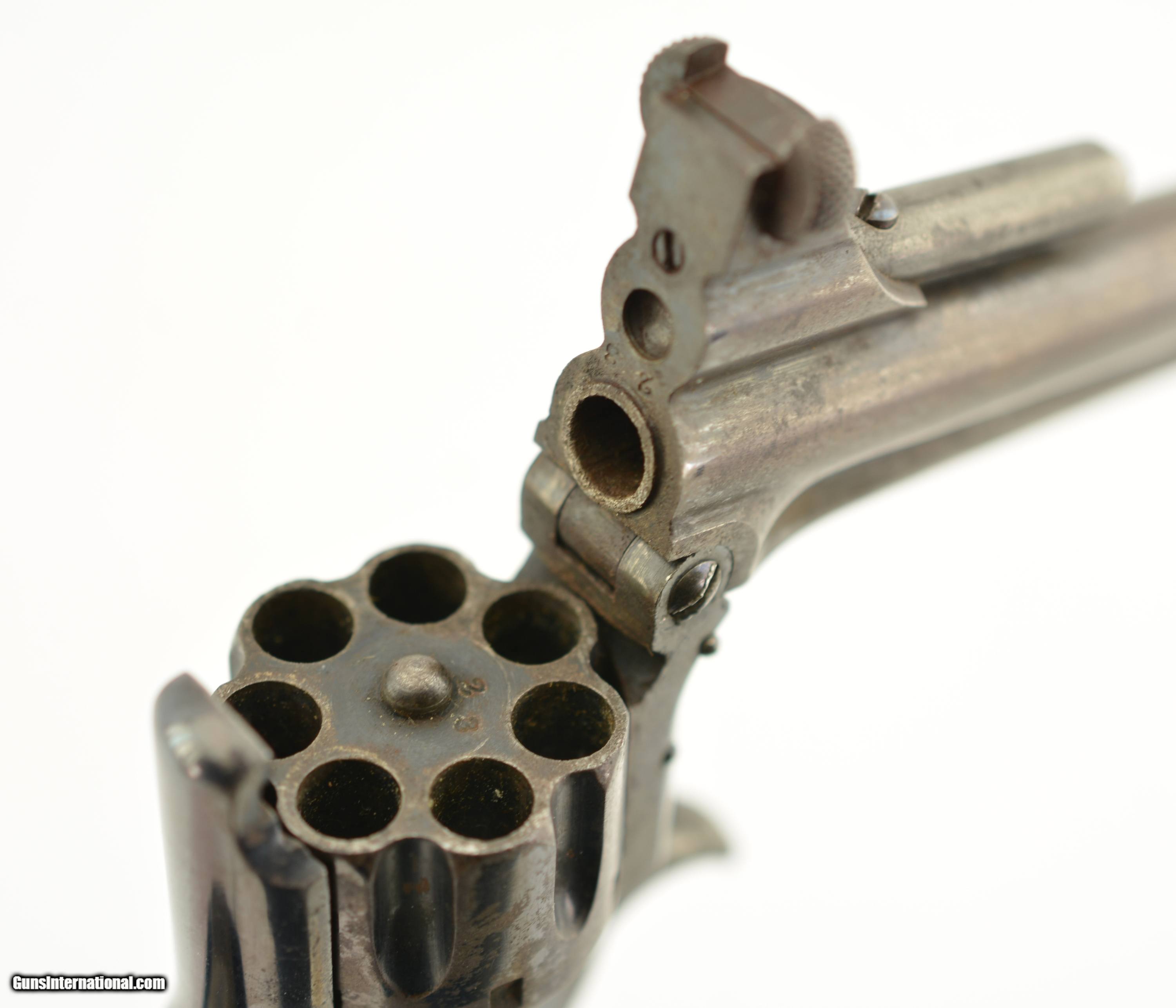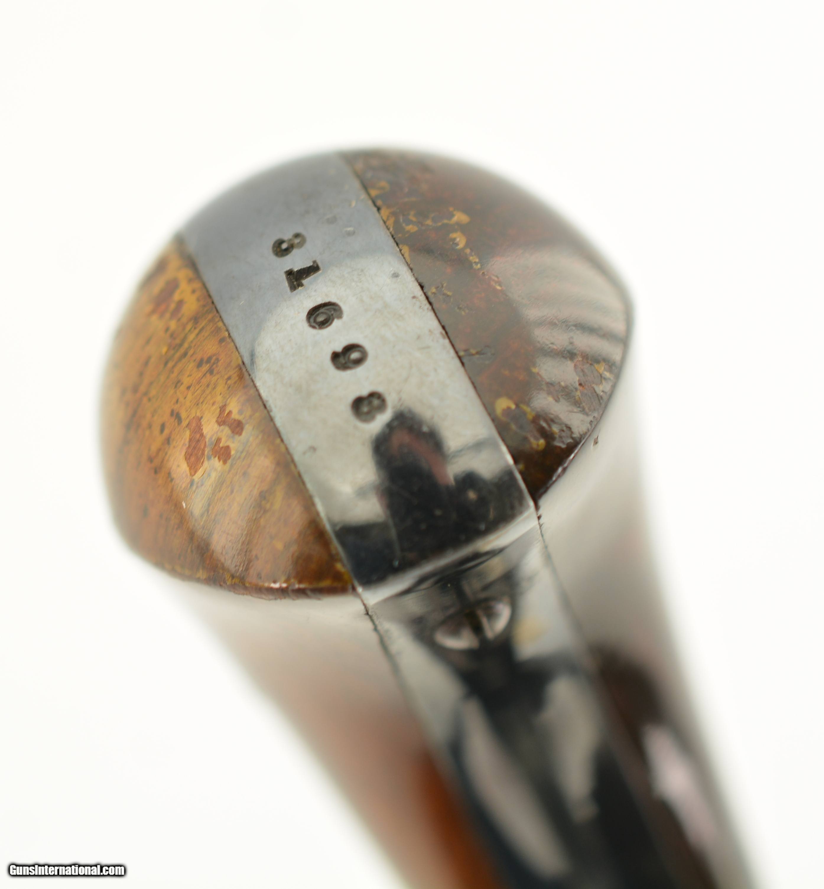 Description: Serial #31698, .22 Rim Fire, 3 3/16 inch ribbed round barrel with a very fine plus mostly bright bore with some areas of light pitting and overall strong rifling. This is the Smith & Wesson model Number One 3rd Issue revolver manufactured from 1868-1881. The little antique revolver is in near excellent overall condition with the frame retaining about 94-96% of the original bright blue finish with some very mild flaking. The barrel and cylinder have mostly flaked to a pleasant gray-brown patina showing some scattered tiny dings and streaks of original bright blue. The hammer retains some wisps of case-hardened colors while the trigger and ejector rod are a medium gray case-hardened patina. The barrel markings remain crisp and the smooth rosewood grips remain in very fine condition retaining about 96% original varnish showing some light flaking and handling marks. Their fit is excellent, the right panel is properly stamp-numbered matching and the other numbered parts are matching by assembly number. Barrel-to-frame fit is excellent but the action will require some mechanical attention as the spring is broken so the cylinder will not lock up properly though the hammer cocks normally which is not uncommon for the delicate action of these revolvers. Antique SOLD Antique: Yes |
