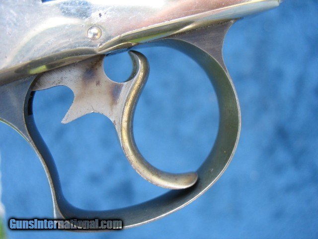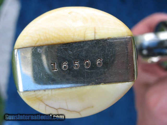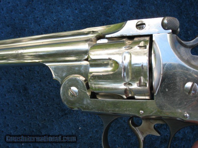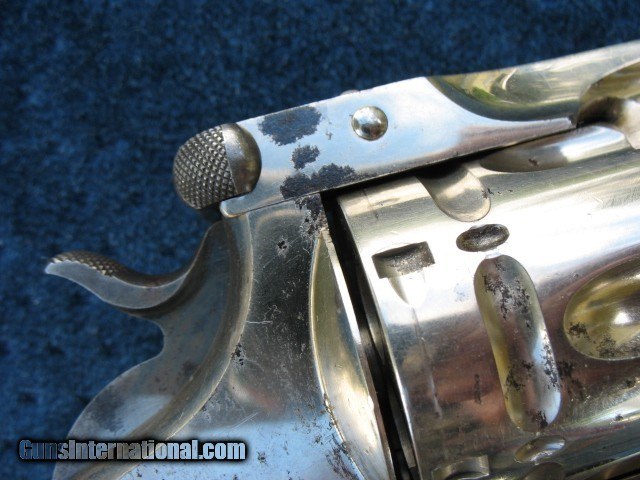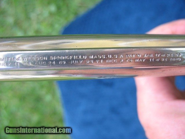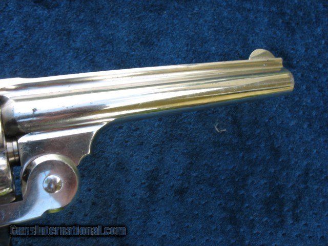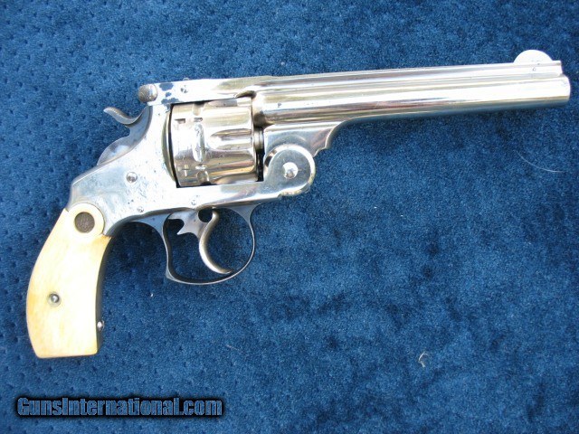 Description: SOLD..Excellent plus condition and near mint collector quality antique Smith & Wesson double action revolver. This is a beauty for sure.. S/N 16506 and all matching throughout on the butt, cylinder, barrel and barrel latch.. These were made from 1881 to 1913 and S/N range is 1 through 54668.. This one falls within the antique range.. Also noted all frames were manufactured before 1898 so all of these are considered antique no matter what the S/N is.. Has the standard 6” barrel and is chambered in the very accurate .44 Russian caliber. The finish on this gun is outstanding as you can see.. It is all original including the factory S&W medallion ivory grips.. I would have to rate the over all finish at 98%.. It shows just enough minor wear to show it has absolutely not been re finished.. Just the way you love to find them and the reason I bought it. There is one small spot on the left side of the barrel about mid way down that the nickel is slightly thin as you can see in the photo.. A small spot of flaked nickel turned dark on the right rear of the barrel at the latch area as you can also see.. A few tiny specks on the cylinder as you can see also and some very light wear on the right frame area behind the cylinder. One tiny speck on the left side on the forcing cone shows a little roughness.. The balance is bright and shiny factory nickel finish with a few very minor handling marks.. Very hard to get good photos of these high condition nickel plated guns but I tried to get different angles so you scan see the real condition this gun has.. If you need any more photos please let me know as I want the buyer to see what he is paying for.. The mechanics are excellent as it should be.. Locks up tight as a new gun in single action and double action. No front to rear cylinder movement and no side to side wobble.. This gun is as tight as the day it left the factory, period. .. Rock solid barrel to frame fit at the latch and the barrel hinge.. Half cock and full cock notches are perfect and positive. Extractor works perfectly.. Excellent markings throughout.. The screw heads and take down pins are untouched.. The grips are beautiful as you can see.. The left side shows minor hair line cracks around the medallion as you can see.. Some minor and typical line crazing on the bottoms.. They fit this gun like a glove and have a wonderful patina.. Just an outstanding pair of original ivory grips.. Probably put on by the dealer.. The bore is near mint, bright and shiny with just a few pin head sized spots.. The cylinder chambers are mint with no spots at all. The front of the cylinder still retains all the factory nickel finish.. This gun has been fired I am sure but very little and shows very little carry wear also.. The barrel latch shows some nice bright blue.. The top of the barrel latch pillars or posts are left in bare steel as is correct from the factory.. The trigger has some case colors showing on the sides and the hammer has case colors on the sides also.. The trigger guard has 98% bright factory blue.. About as nice a large frame Smith & Wesson you will find on the open market today.. Very hard to improve on as you can see unless you find one that is flat out mint unfired in the original box and I guarantee you won't buy it for this price !!!! This one is absolutely worth putting in a box if you have one or can find one.. Very hard to find large frame antique western revolvers in this condition.. I like the large frame single actions myself or I would be keeping this one.. Someone please buy this thing before I change my mind..!!!! Call 765-728-8049 for more photos or any questions.. $30 insured shipping.. Don't miss this one !!!! and check back often.. SOLD Antique: Yes |