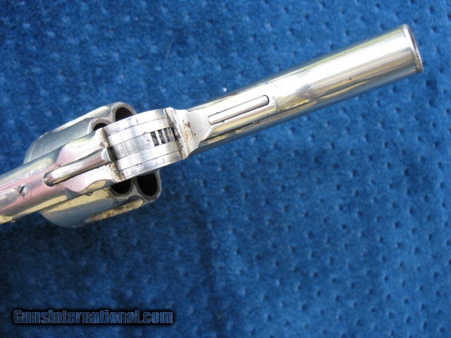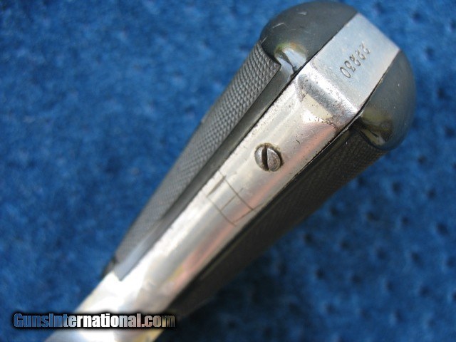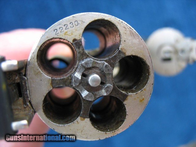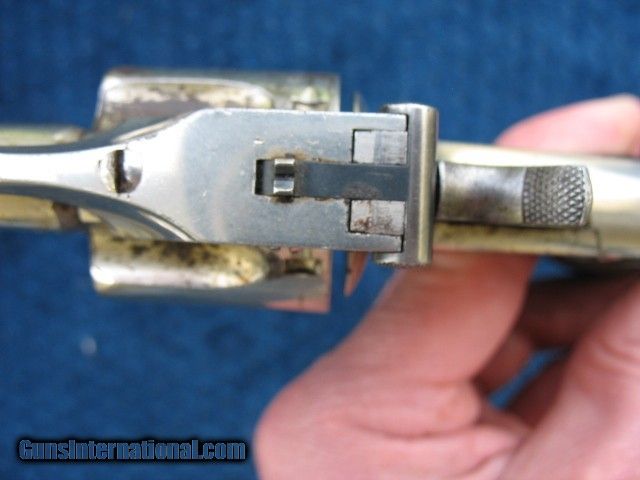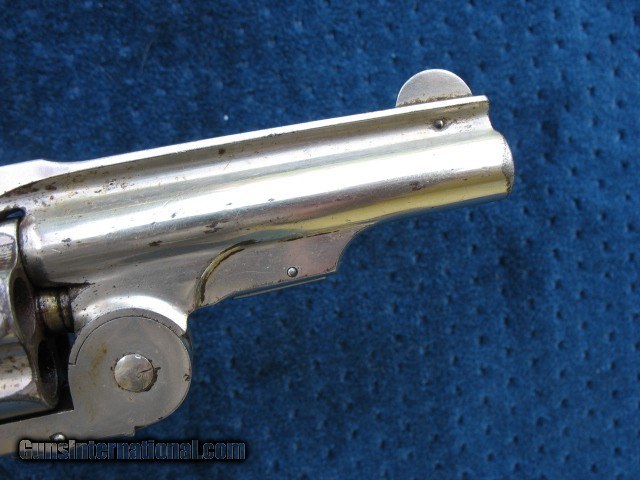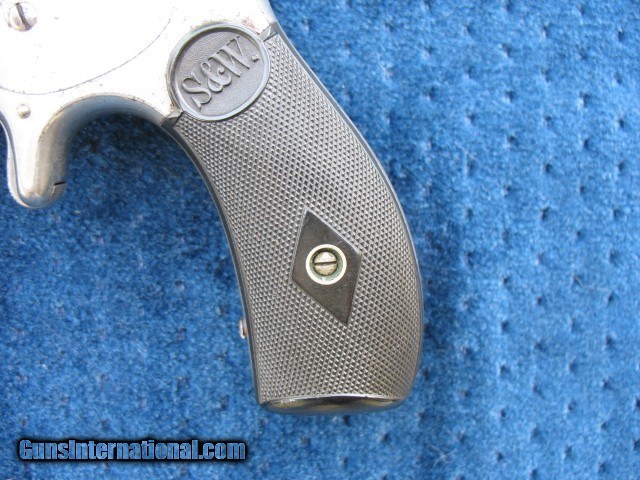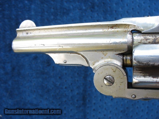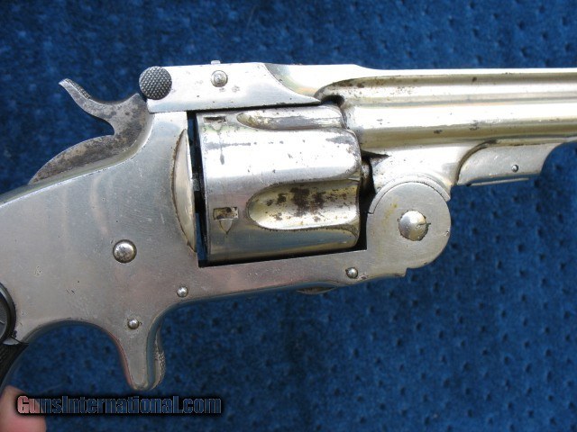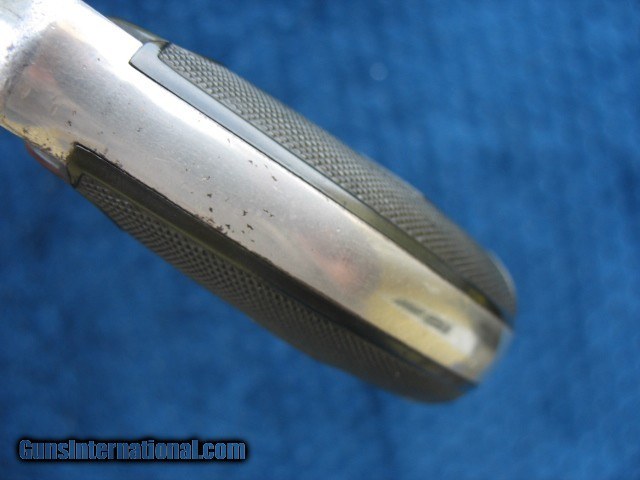 Description: SOLD....Antique Smith & Wesson 1st model Baby Russian. Here is an excellent Baby Russian. S/N 22230 and all matching of course. This model was only made 1876 to 1877 with the S/N range from 1 to 25548 so this one was made in 1877 near end of production... Numbers in side the grip is hard to make out but the numbers I can see match and are original to the gun and match the condition of the gun perfectly. It is in the .38 S&W black powder caliber. Has the standard 3 1/4” barrel. This little gun has most of it's original nickel finish. The barrel has 98% just missing a little at the muzzle. The frame has 99% including the front and rear grip straps. The cylinder has about 80% just missing some nickel down in the flutes as you can see. NO pitting anywhere on the gun. There are some light scratches on the front grip strap as you can see in the photo.. I have no idea what they mean ???? This gun has never been cleaned on or messed with in any way. The barrel latch has 80% blue just thinning a little on the rear section. No blue remains on the trigger. Case colors on the hammer have faded out. The mechanics are excellent and this gun is crisp and tight as a new gun. Both hammer notches are perfect and positive. Extractor works perfectly. Rock solid barre to frame fit at the latch and the hinge with no movement... The grips are excellent as well showing all the fine checkering and NO cracks or chips. A perfect snap on factory fit.. The markings are excellent. This is an odd one as the barrel address is rolled on backwards and reads from cylinder to the muzzle as you can see in the photos. This is only the second Baby Russian I have ever had in over 30 years with the backwards address !!!! Untouched front sight never filed on or messed with. The screw heads for the most part are crisp and not all burred up from tinkering. Some do show some turning but nothing bad at all.. All are very serviceable. The bore is very good with strong rifling and mild roughness from black powder. The cylinder chambers will clean to excellent. All in all, this is an excellent little pocket Smith & Wesson that shows little use... These little revolvers were very popular pocket guns in the day and much more rare then the later second models. One of the best Baby Russians I have has in quite some time. I have had several near mint second models but not the Baby Russians and while this gun is not near mint, it has quite a bit of untouched finish for the money. Don't miss this one if you are on the hunt for this model and a rare variation with the very seldom seen backwards barrel address !!!!! I don't get these 1st models in as much as I did years ago and with this amount of finish to boot.. $15 insured priority mail shipping. Call 765-728-8049 with any questions or more photos. Thank you for looking and God Bless The U.S.A. SOLD Antique: Yes |