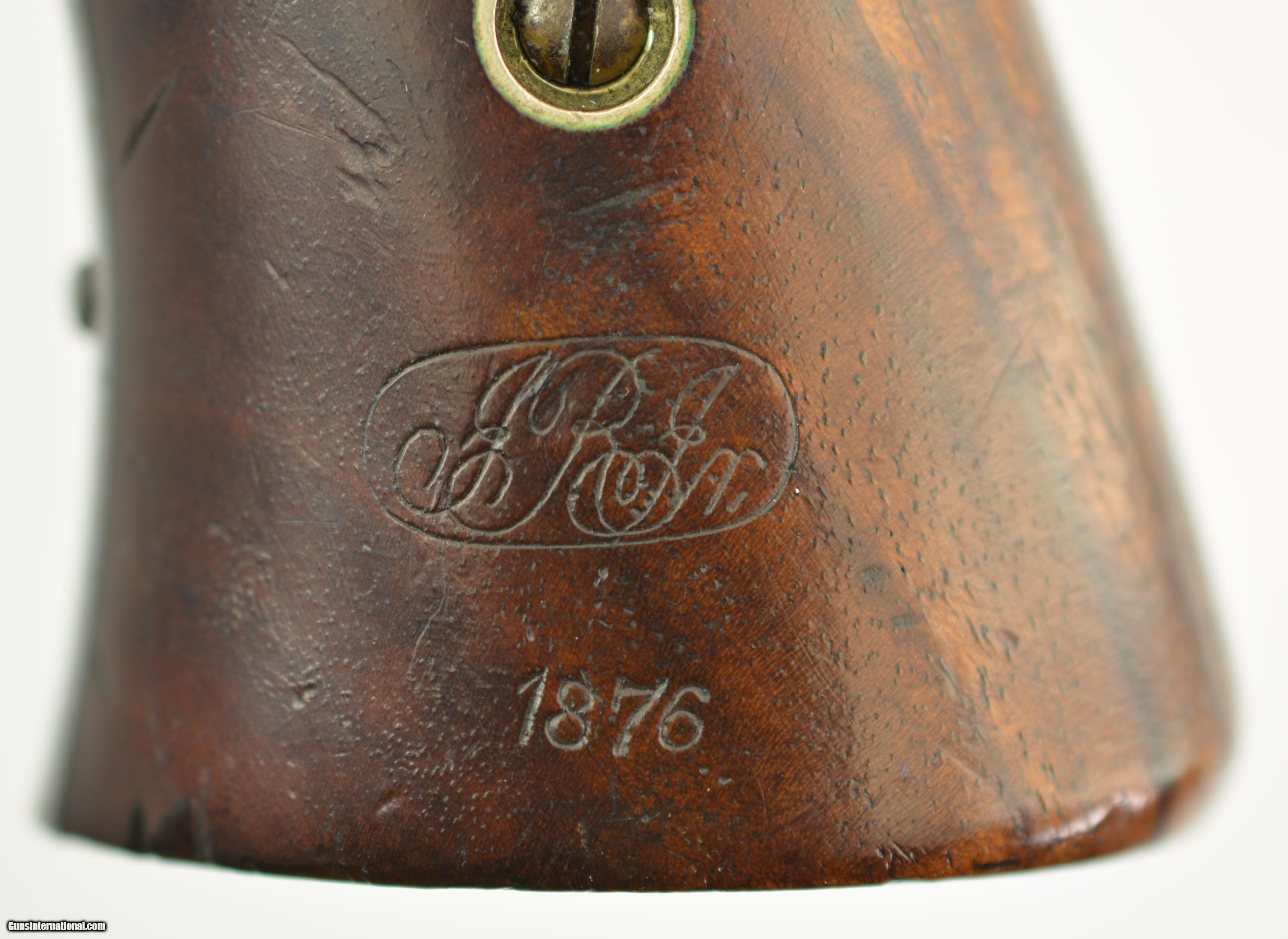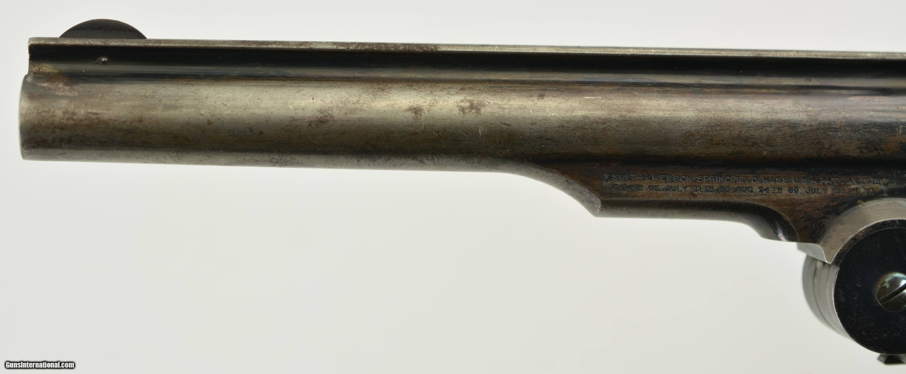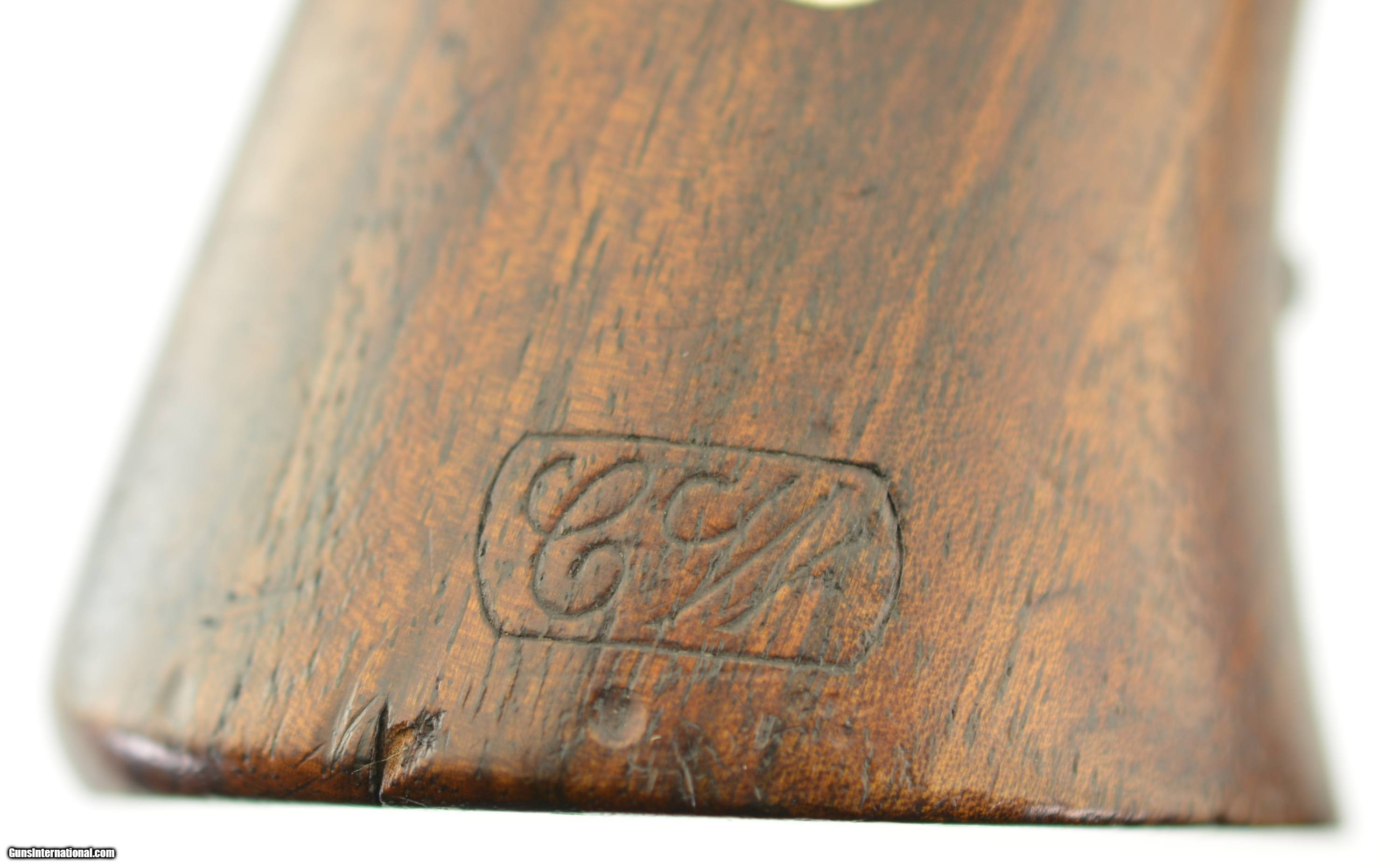 Description: Serial #4980 all matching, .45 S&W, 7 inch barrel with an excellent, bright bore. This is a very handsome revolver that retains 70-75% of the original bright blue finish, with the majority of the loss occurring along the sides of the barrel and around the rear of the cylinder. Some small spots of freckling are mingling with the pewter gray metal, and the hammer and trigger guard have retained a commensurate amount of the original color case-hardening. The original walnut grips, numbered to the gun on the interior, are in fine shape with crisp inspector cartouches, and the “US" stamp on the butt is likewise crisp and clear. The lock-up is rock-solid, and the action functions flawlessly. This is a splendid example of a truly desirable S&W, and rates fine-near excellent overall. Antique SOLD Antique: Yes Manufacturer: S&W Model: Schofield Serial Number: 4980 Caliber Info: .45 S&W Gauge Info: .45 S&W |