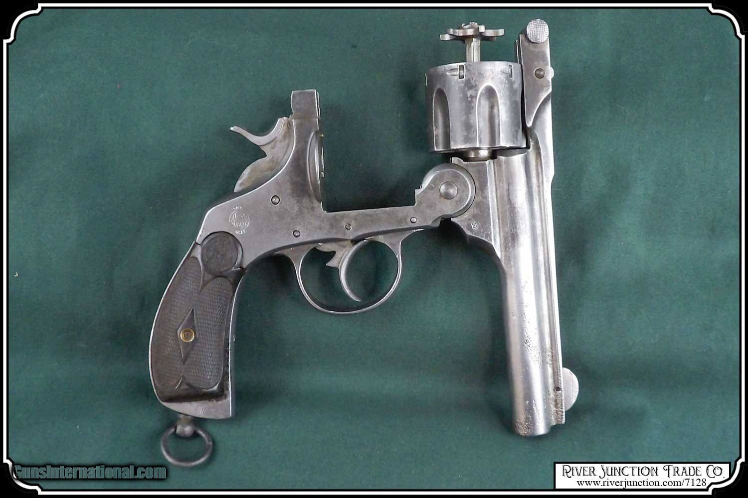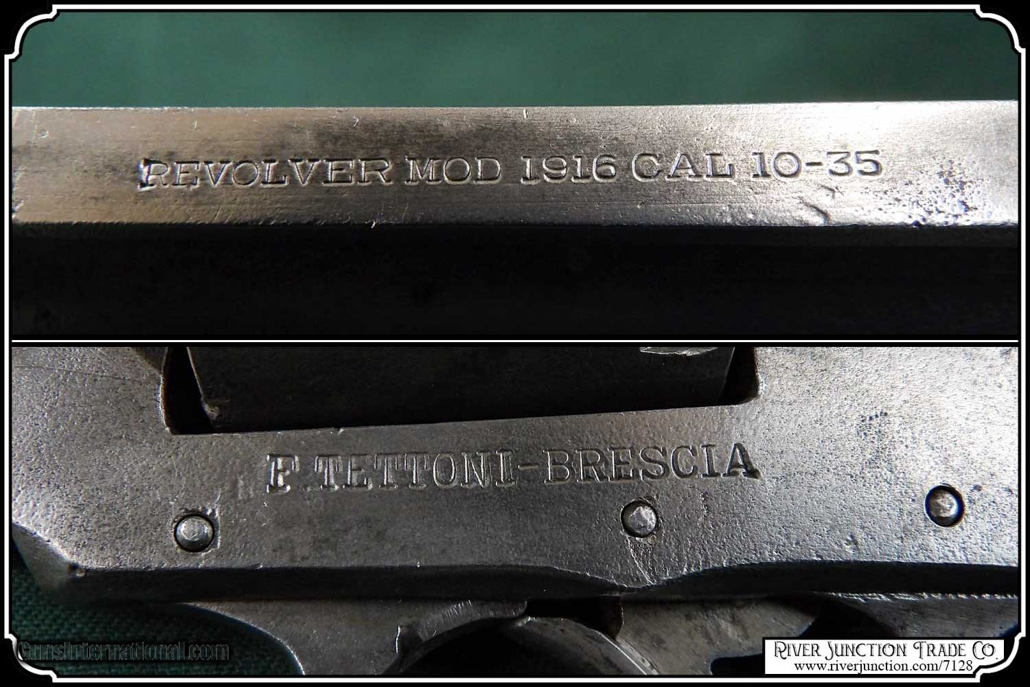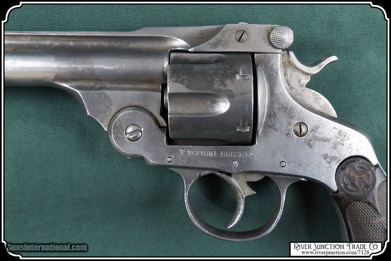 Description: This is a massive and stout Italian revolver, made by F Tettoni in Brescia. Top of the barrel rib is marked Revolver Mod 1916 Cal 10-35. In my reference book Cartridges of the World, it described this cartridge as follows. "This cartridge was developed for the Italian Model 1874 service revolver. The cartridge is similar to the .44 S&W Russian." This has outward appearance of being a copy of the Smith and Wesson First Model DA. Operates perfectly in double and single action. Breaks out to eject spent cartridges. Ejector works perfectly. No original finish remaining. Skull cracker butt, has a lanyard ring. I am not sure if this was actually an Italian service revolver. The bore has deep rifling. Sold as an Antique no guarantees, warranties, or liabilities for any actual usage. If any firearms are to be used for shooting purposes, a qualified gunsmith should inspect them first. Price: $795.00 Buy Now Contact Seller |
