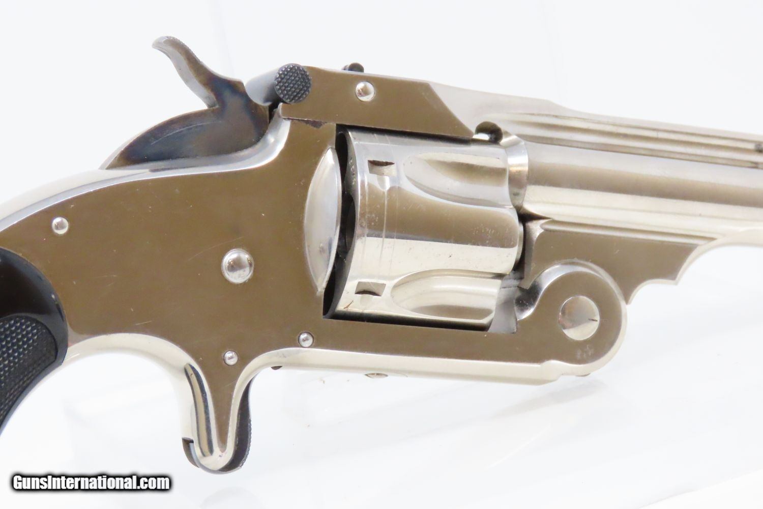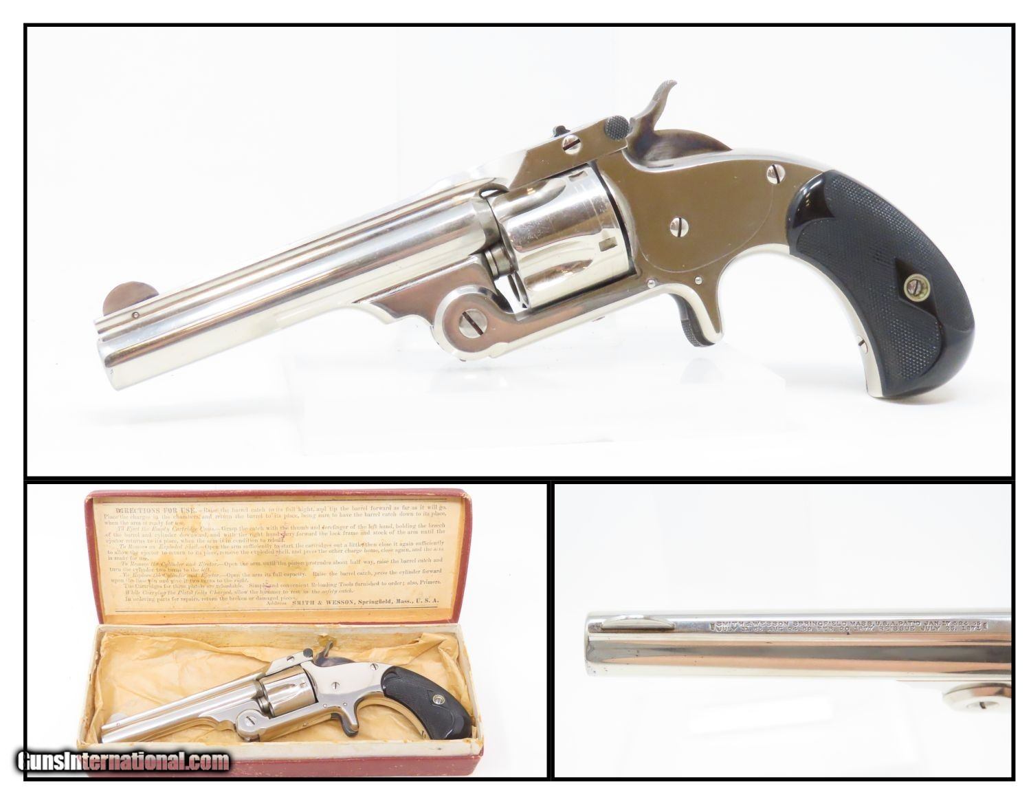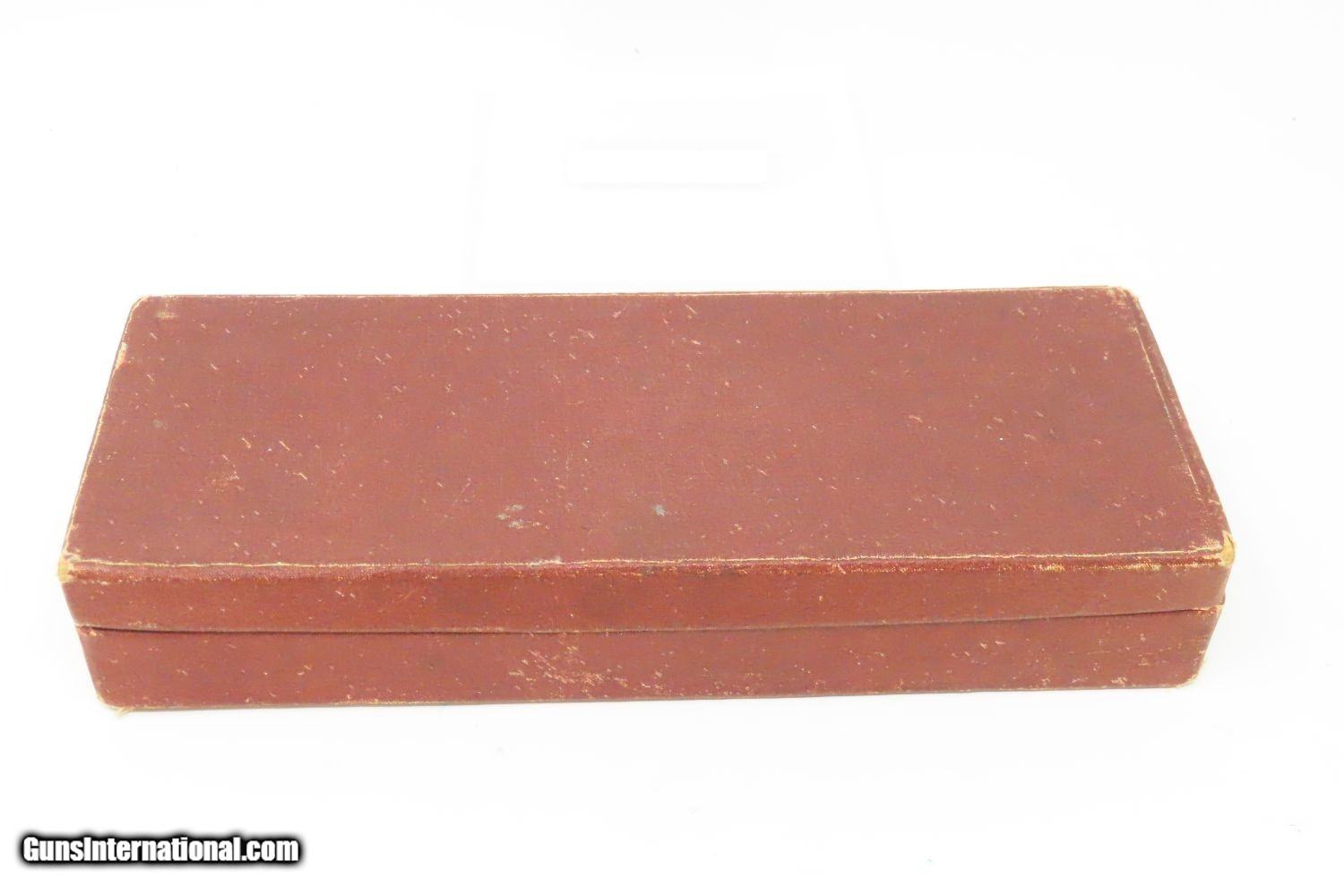 Description: FACTORY BOXED Antique SMITH & WESSON .32 Single Action “WILD WEST” Revolver AUTOMATIC EJECTOR “Spur Trigger” Revolver Here we present an antique Smith & Wesson .32 Single Action Revolver, also referred to as the “1-1/2 Frame Centerfire Revolver”, manufactured circa 1879 with a production run of 1878 through 1892 in Springfield, Massachusetts. Smith & Wesson manufactured approximately 97,599 of these revolvers during its 14-year production run. This model represented the first .32 S&W centerfire caliber top-break revolver that automatically ejected spent cartridges upon opening. Similar in appearance to the Model 1-1/2 2nd Issue, this model came with a 5-shot fluted cylinder and bird's-head grip of either wood or checkered hard rubber. It was offered with barrel lengths of 3, 3.5", 6", 8" and 10". The 8" and 10" barrel are rare and were not offered until 1887. This model pivots downward on opening and features a rebounding hammer that made the weapon much safer to fully load. This revolver utilized the idea of the “bored through cylinder”, which was patented by Rollin White and subsequently exclusively licensed by Smith & Wesson. This concept has forever changed revolving firearms design, and is the same idea used in revolvers today. S&W, via Rollin White himself, aggressively sued any patent infringers and were able to hold their monopoly on the American market for cartridge revolvers from about 1857 to 1870, whereupon their patent expired. The results were a very profitable business, a broke Rollin White, and a grudging U.S. Chief of Ordnance Alexander Dyer, who was still angry in 1870 about not being able to use the technology during the Civil War. The U.S. government ended up giving Colt their contracts since they valued the larger .44 caliber in the Colt 1860 Armies over the .32 caliber full sized No. 2 Armies. The overall condition is excellent. Original nickel finish and case colors has been preserved. The action is as strong as ever! Bright clean bore. Firm grips with little to no visible wear. Numbers match. Includes the original box. Here is a must have example that will be a great addition to the collection. Own the original! This is a legitimate antique and not a reproduction. Barrel is 3-1/2 inches. Caliber: .32 S&W Overall condition as seen in photos. Very Fast. Very Safe. FREE SHIPPING WORLDWIDE. Delivered directly to your door by express mail! Guaranteed AUTHENTIC & Includes CERTIFICATE OF AUTHENTICITY. ancestryguns $1285 #210088 SOLD Antique: Yes |