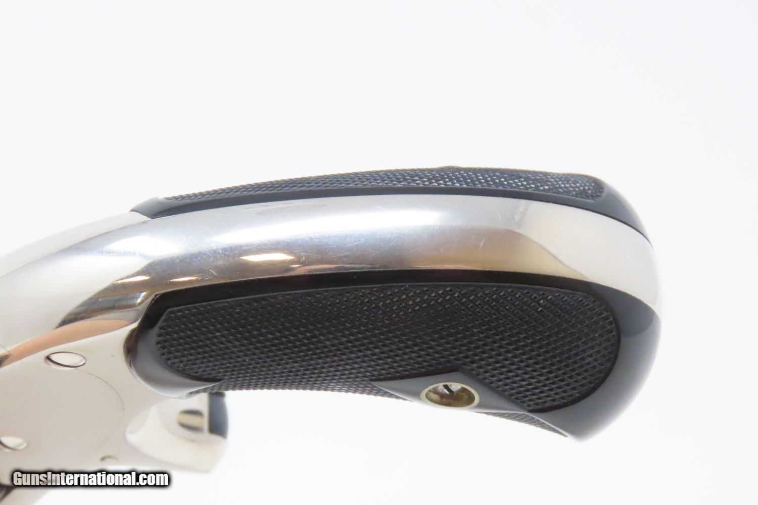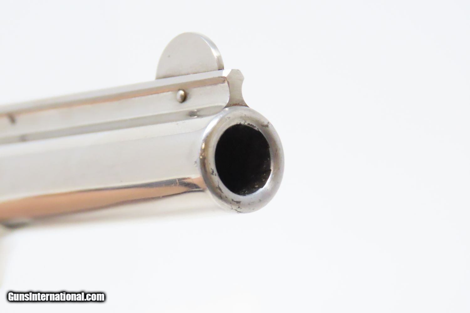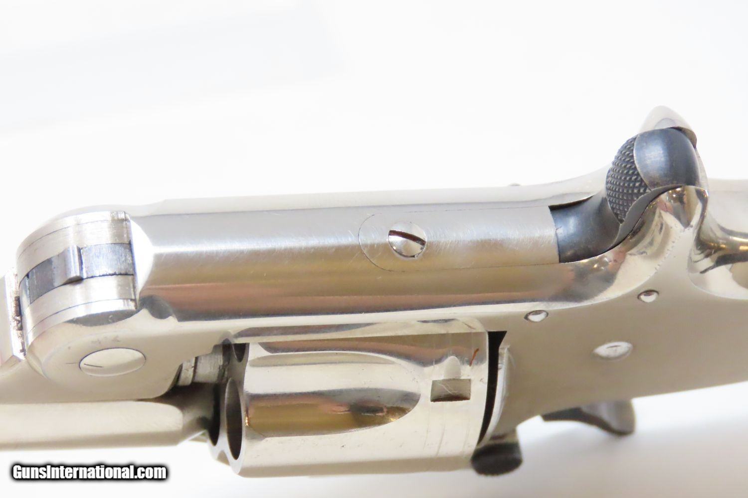 Description: FACTORY BOXED Antique SMITH & WESSON .32 Single Action “WILD WEST” Revolver AUTOMATIC EJECTOR “Spur Trigger” Revolver Here we present an antique Smith & Wesson .32 Single Action Revolver, also referred to as the “1-1/2 Frame Centerfire Revolver”, manufactured circa 1879 with a production run of 1878 through 1892 in Springfield, Massachusetts. Smith & Wesson manufactured approximately 97,599 of these revolvers during its 14-year production run. This model represented the first .32 S&W centerfire caliber top-break revolver that automatically ejected spent cartridges upon opening. Similar in appearance to the Model 1-1/2 2nd Issue, this model came with a 5-shot fluted cylinder and bird's-head grip of either wood or checkered hard rubber. It was offered with barrel lengths of 3, 3.5", 6", 8" and 10". The 8" and 10" barrel are rare and were not offered until 1887. This model pivots downward on opening and features a rebounding hammer that made the weapon much safer to fully load. This revolver utilized the idea of the “bored through cylinder”, which was patented by Rollin White and subsequently exclusively licensed by Smith & Wesson. This concept has forever changed revolving firearms design, and is the same idea used in revolvers today. S&W, via Rollin White himself, aggressively sued any patent infringers and were able to hold their monopoly on the American market for cartridge revolvers from about 1857 to 1870, whereupon their patent expired. The results were a very profitable business, a broke Rollin White, and a grudging U.S. Chief of Ordnance Alexander Dyer, who was still angry in 1870 about not being able to use the technology during the Civil War. The U.S. government ended up giving Colt their contracts since they valued the larger .44 caliber in the Colt 1860 Armies over the .32 caliber full sized No. 2 Armies. The overall condition is excellent. Original nickel finish and case colors has been preserved. The action is as strong as ever! Bright clean bore. Firm grips with little to no visible wear. Numbers match. Includes the original box. Here is a must have example that will be a great addition to the collection. Own the original! This is a legitimate antique and not a reproduction. Barrel is 3-1/2 inches. Caliber: .32 S&W Overall condition as seen in photos. Very Fast. Very Safe. FREE SHIPPING WORLDWIDE. Delivered directly to your door by express mail! Guaranteed AUTHENTIC & Includes CERTIFICATE OF AUTHENTICITY. ancestryguns $1285 #210088 SOLD Antique: Yes |