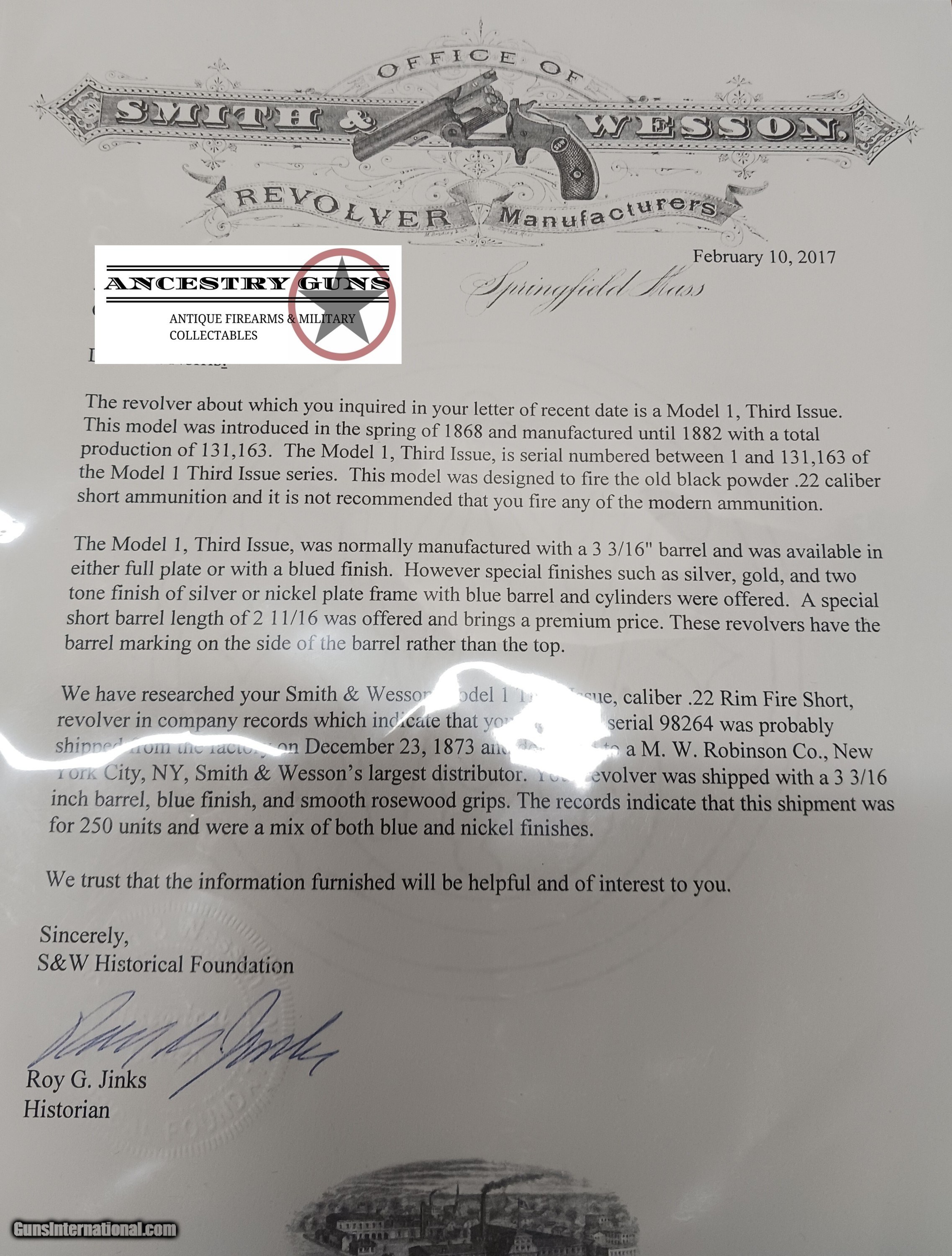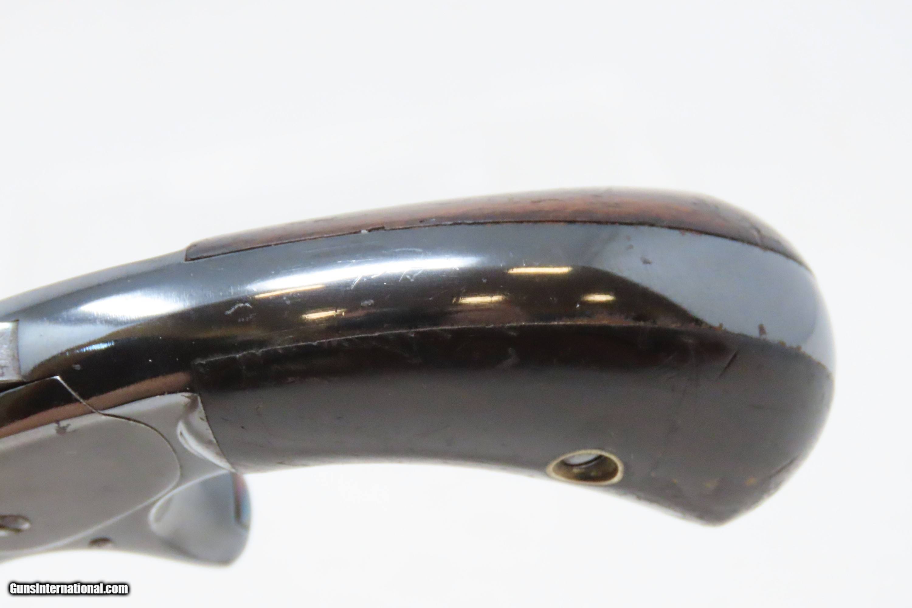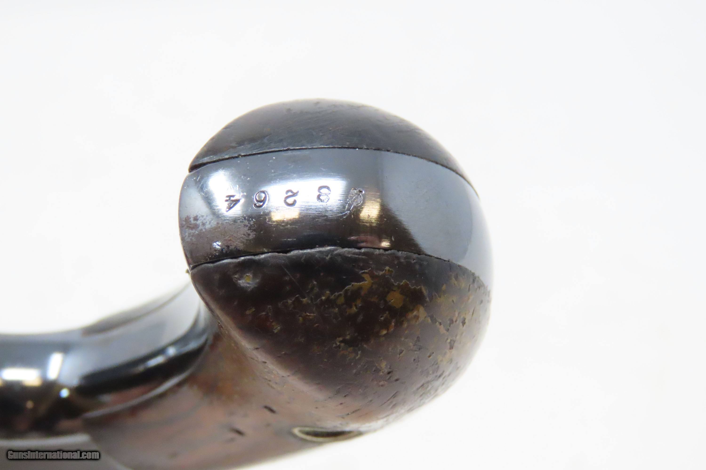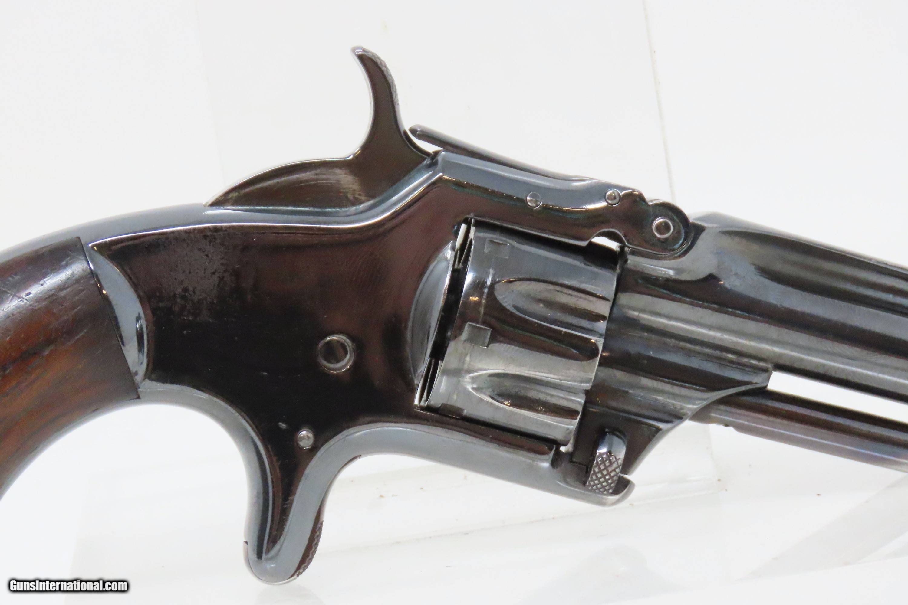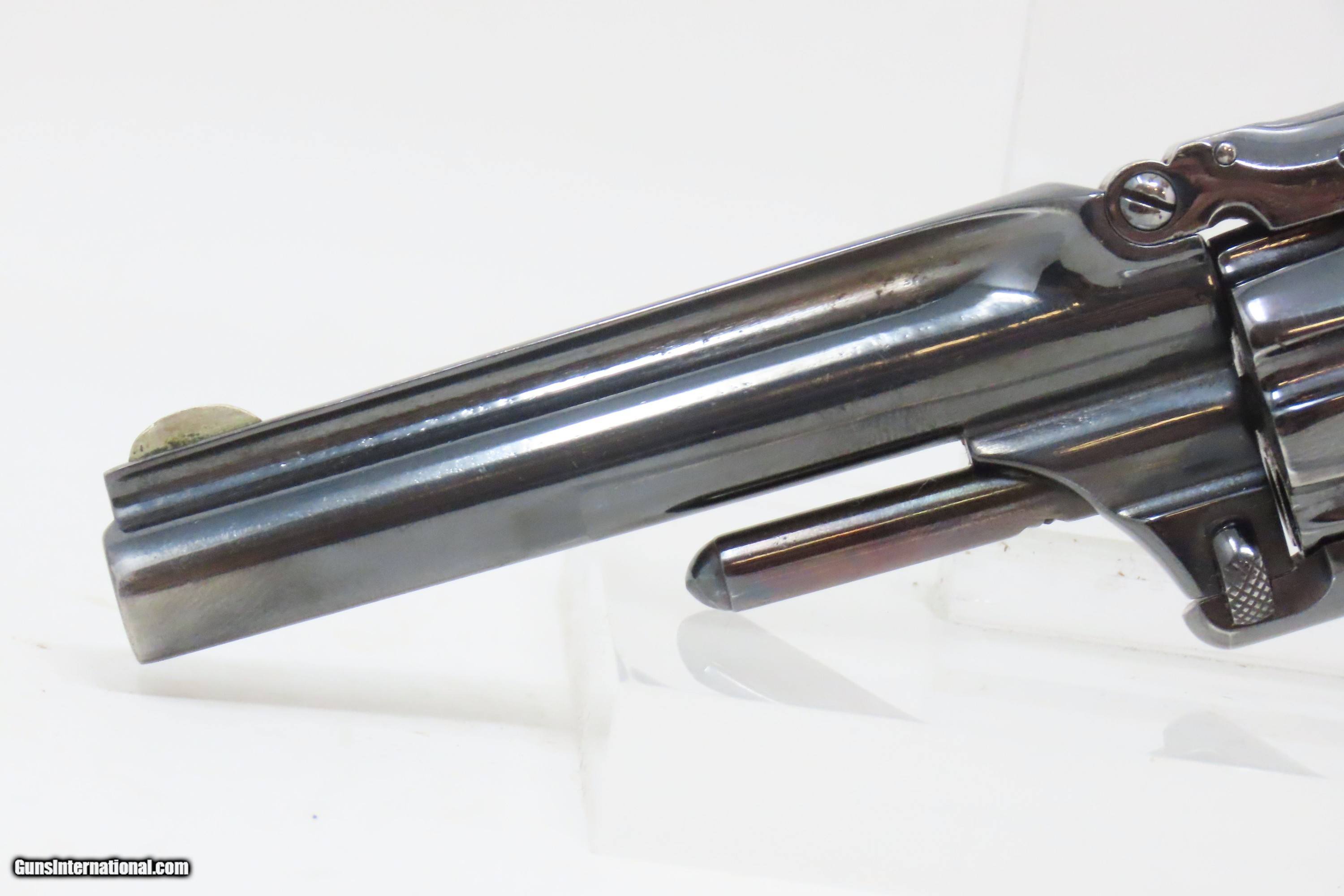 Description: FACTORY LETTERED Very Nice OLD WEST Antique SMITH & WESSON No. 1 Revolver 19th Century POCKET CARRY for the Armed Citizen Here we present an antique Factory Lettered Smith & Wesson Number 1, Third Issue Revolver, made in 1873 with a production run between 1868-81. The No. 1 was Smith & Wesson’s first metallic cartridge firearm. It utilized the idea of the “bored through cylinder”, which was patented by Rollin White and subsequently exclusively licensed by Smith & Wesson. This concept has forever changed revolving firearms design, and is the same idea used in revolvers today. S&W, via Rollin White himself, aggressively sued any patent infringers and were able to hold their monopoly on the American market for cartridge revolvers from about 1857 to 1870, whereupon their patent expired. The results were a very profitable business, a broke Rollin White, and a grudging U.S. Chief of Ordnance Alexander Dyer, who was still angry in 1870 about not being able to use the technology during the Civil War. The U.S. government ended up giving Colt their contracts since they valued the larger .44 caliber in the Colt 1860 Armies over the .32 caliber full sized No. 2 Armies. The Third Issue was S&W’s final improved version of the revolver. The rounded birds head grips, fluted cylinder and round barrel made this an even sleeker variant of the revolver that started it all. This small revolver is a 7-shot .22 rimfire. It was specifically designed to be a pocket gun, being very small and light. For those not wanting or needing a full-sized gun or for those who wanted a backup this revolver was the ideal firearm for the turbulent 19th century. The included factory letter confirms the current barrel length, caliber, grips, and finish when the revolver was shipped to M.W. Robinson of New York, NY, on December 23, 1873 as part of a 250 gun shipment. M.W. Robinson was Smith & Wessons largest distributor. The overall condition is good. The action is strong, but the cylinder does not index properly. Semi-bright bore, nice rifling. Both grips are solid with average handling wear. Markings are legible. This example has been refinished. Own the original! This is a legitimate antique and not a reproduction. Barrel is 3-3/16 inches. Caliber: .22 Rimfire Overall condition as seen in photos. Very Fast. Very Safe. FREE SHIPPING WORLDWIDE. Delivered directly to your door by express mail! Guaranteed AUTHENTIC & Includes CERTIFICATE OF AUTHENTICITY. ancestryguns $1200 #233298 SOLD Antique: Yes |
