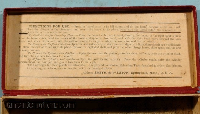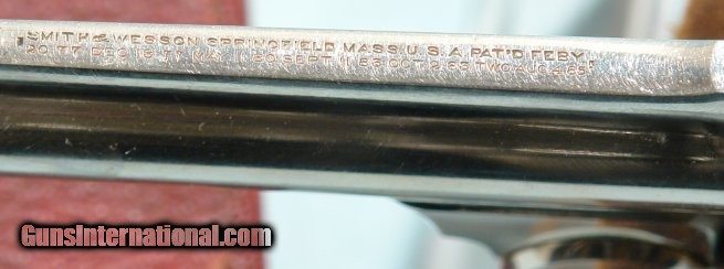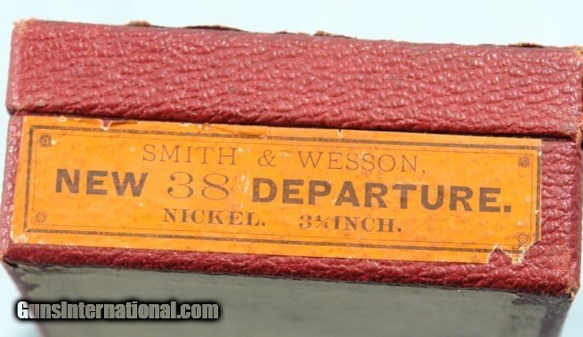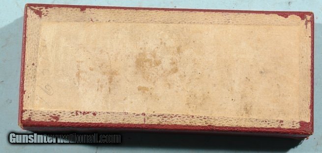 Description: NEAR MINT IN ORIG. BOX ANTIQUE 2ND MODEL SMITH & WESSON NEW DEPARTURE SAFETY HAMMERLESS "LEMON-SQUEEZER" NICKEL .38S&W REVOLVER. Serial number "165XX" and matching to original red pasteboard box with excellent end label. Revolver has a 98% of it's original factory nickel. Unturned screws. Perfect original grips. 3 1/4" barrel with exceptional bore, rifling and chambers. Blue triggerguard and case colored trigger. Barrel rib has two line address ending in patent date of 1885(first production). Knurled thumb barrel release correct. Perfect working order. Exceptional box with perfect corners, no losses and correct penciled in matching serial number on bottom. Antique. SOLD Antique: Yes Handgun Caliber: .38 S&W (.38 Colt New Police, .38 Super Police) |