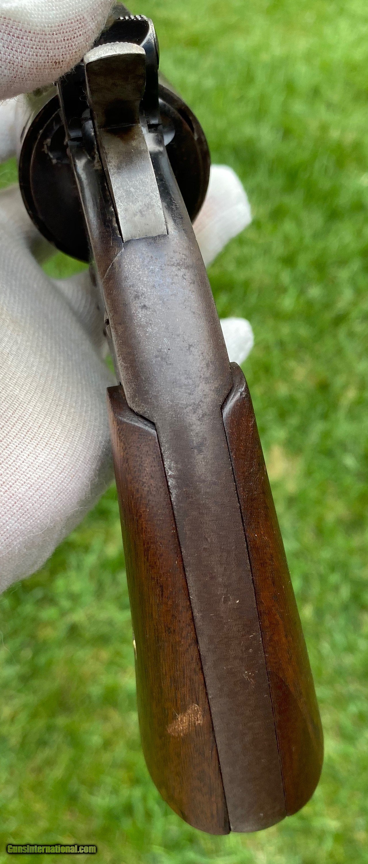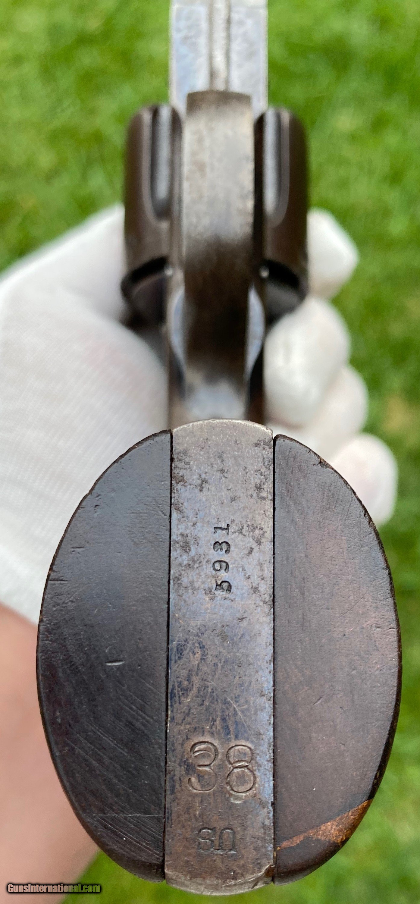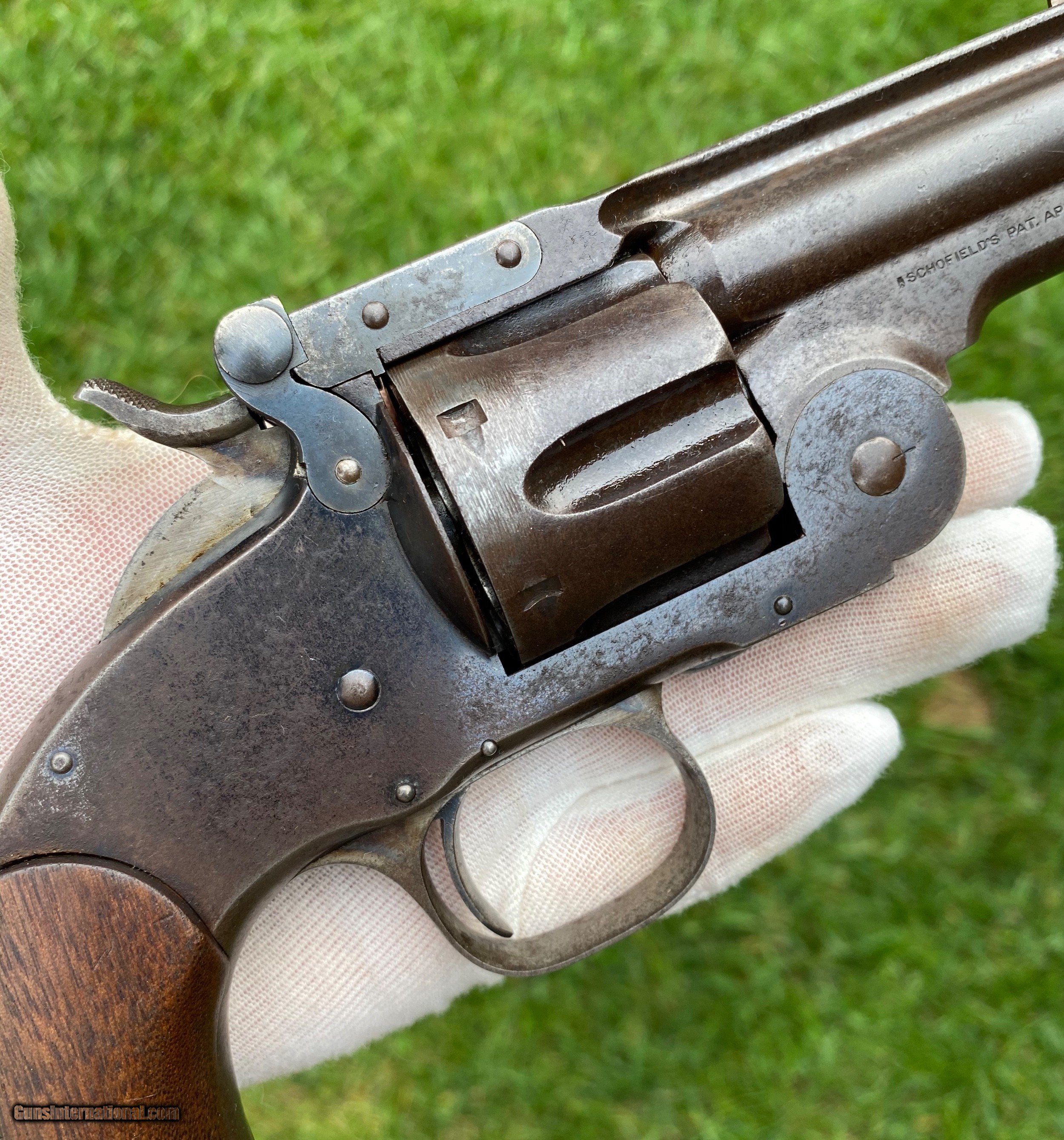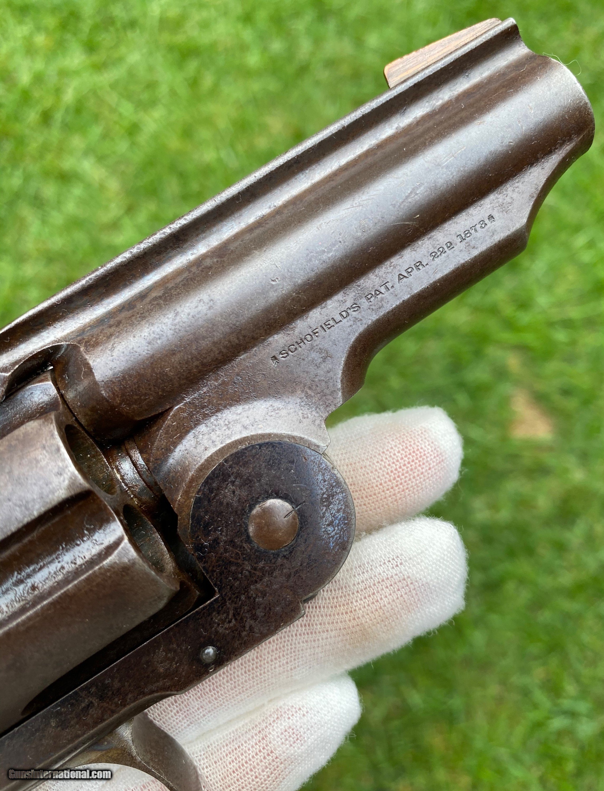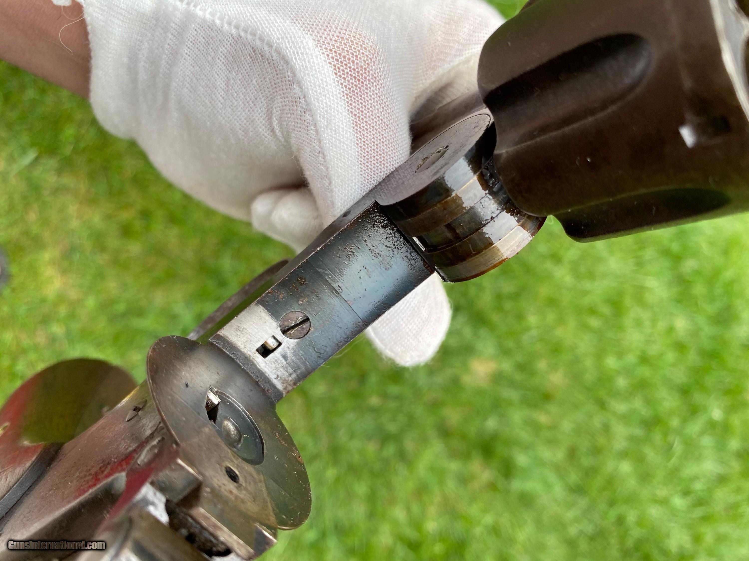 Description: This is a really cool gun, This is a Period modified Smith & Wesson Schofield converted to Belly Gun. The front sight is made of copper, the barrel measures 3 1/2". The grips I believe are replacements however they were made very well and dont detract in anyway from the originality appearence the revolver has. The frame shows a fair amount of original blue finish drifiting a bit. The barrel has nice strong markings still discernable.The serial number 5931 can be found on the cylinder and the butt. The butt is also stamped with a "US" and a "38". The hammer has faint traces of the color case hardened finish. Mechanically excellent. Overall a really interesting gun! This is the most reasonably priced Schofield on the market that I know of! Asking $2,100.00 SOLD Antique: Yes |