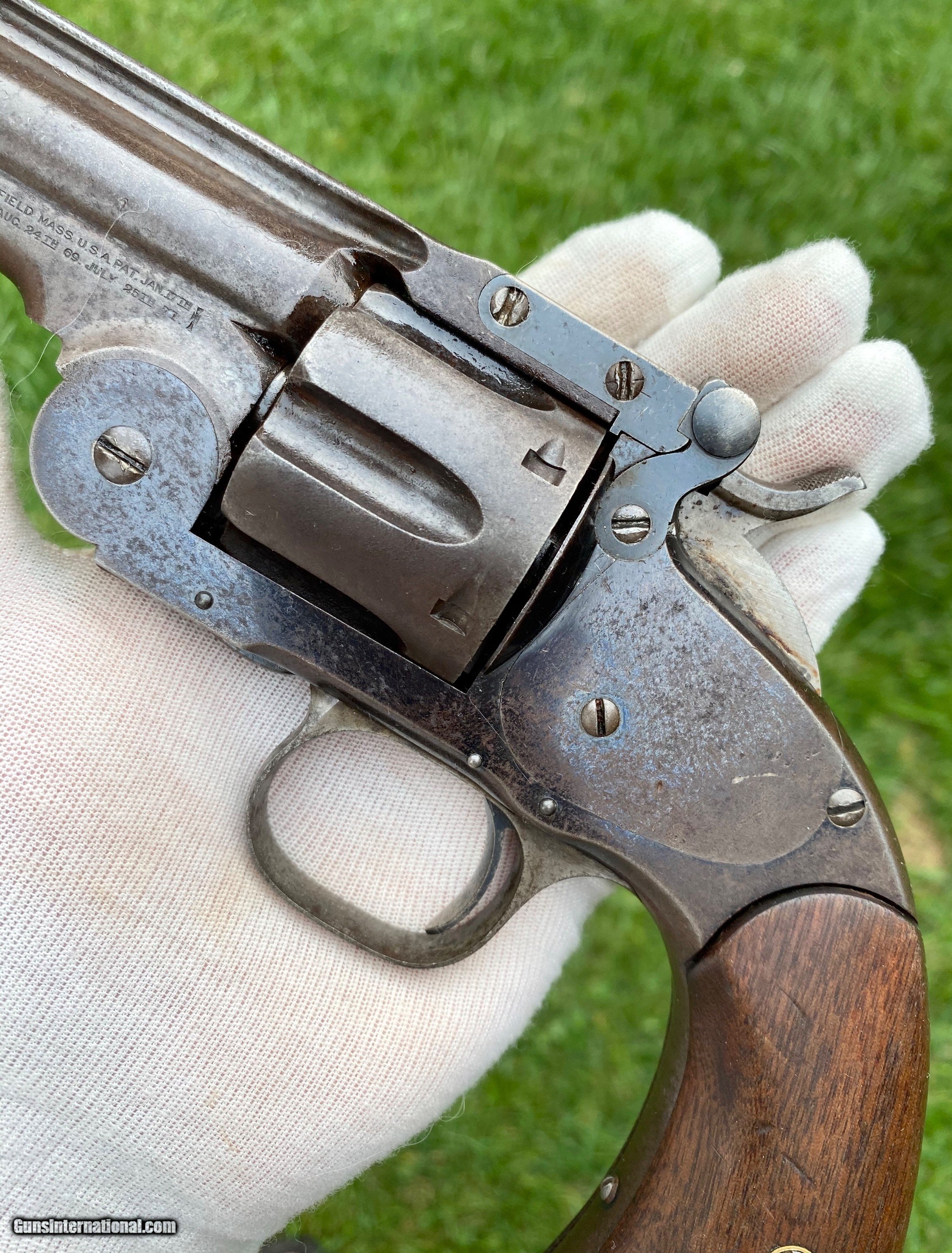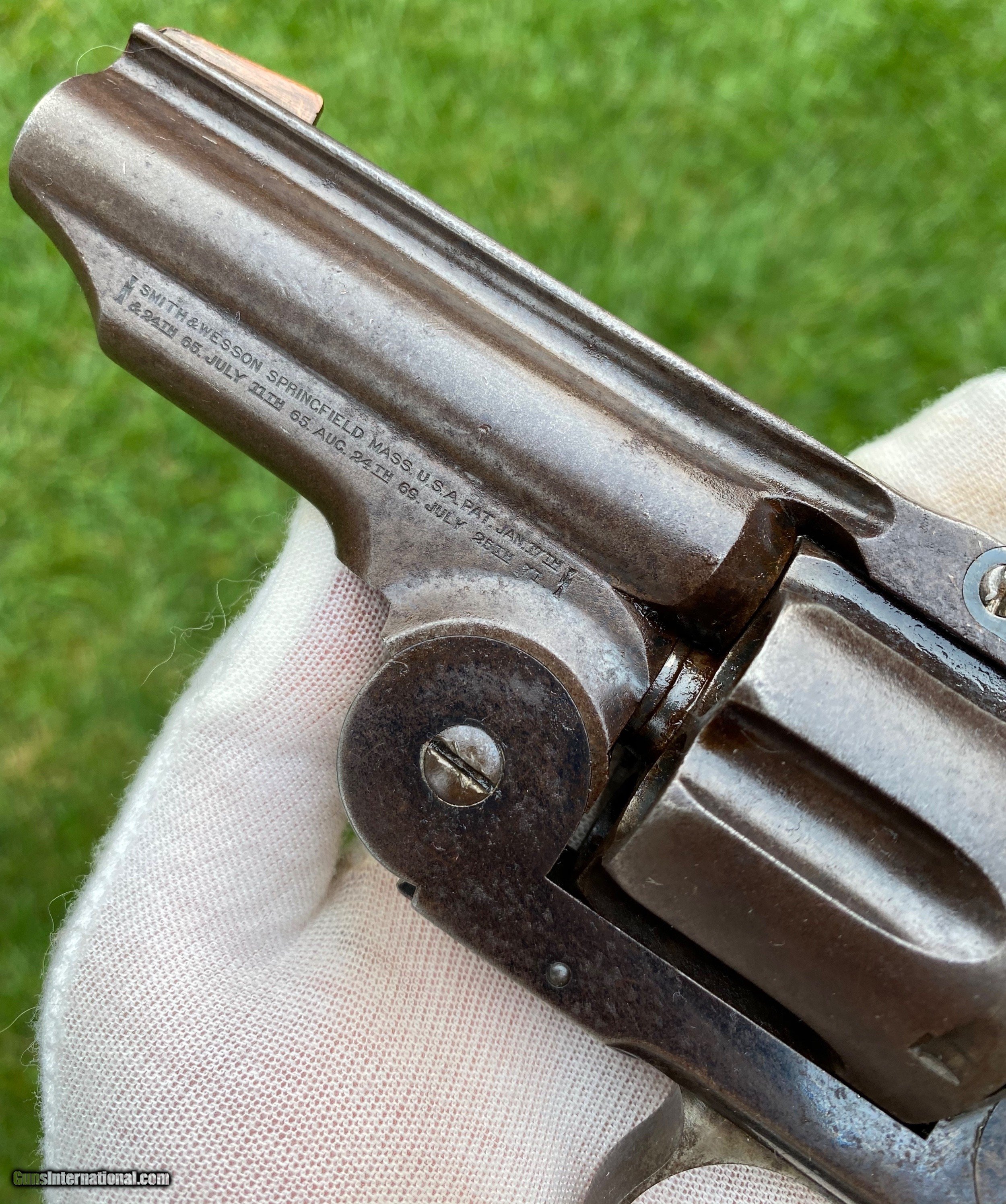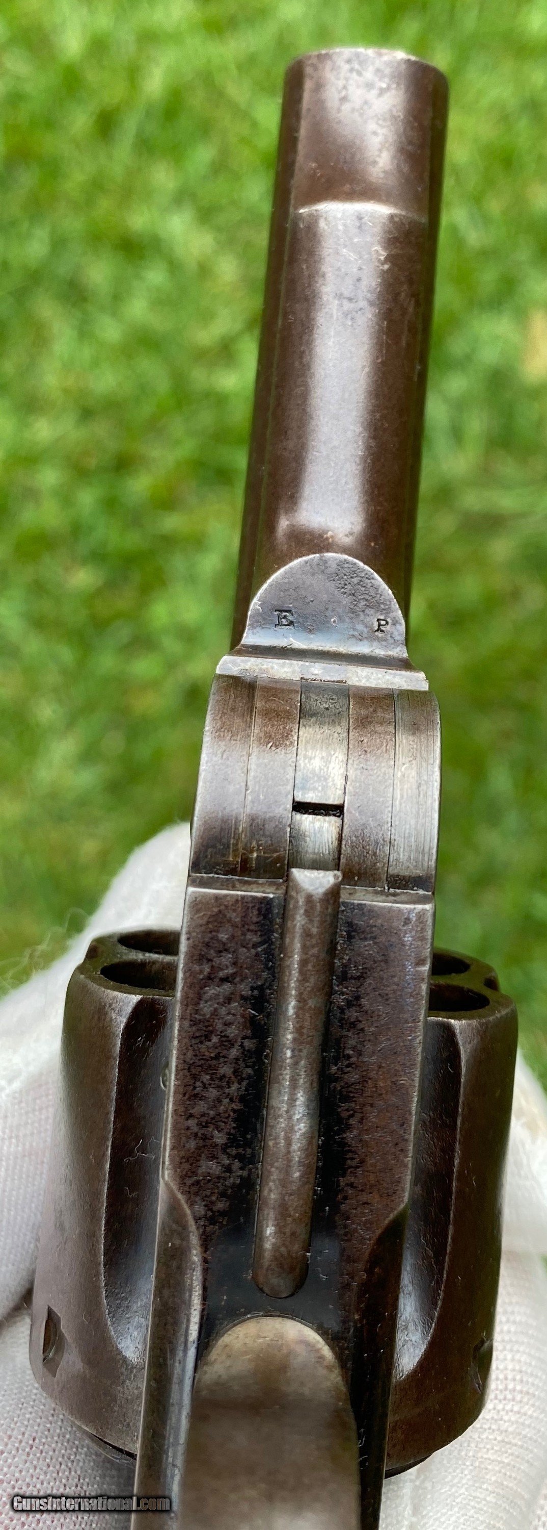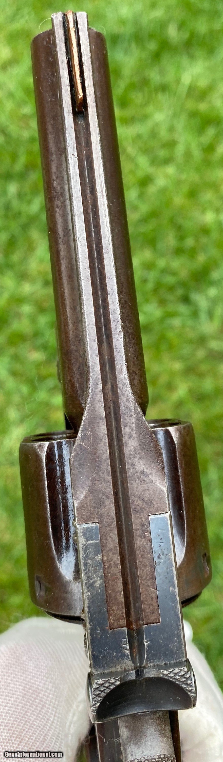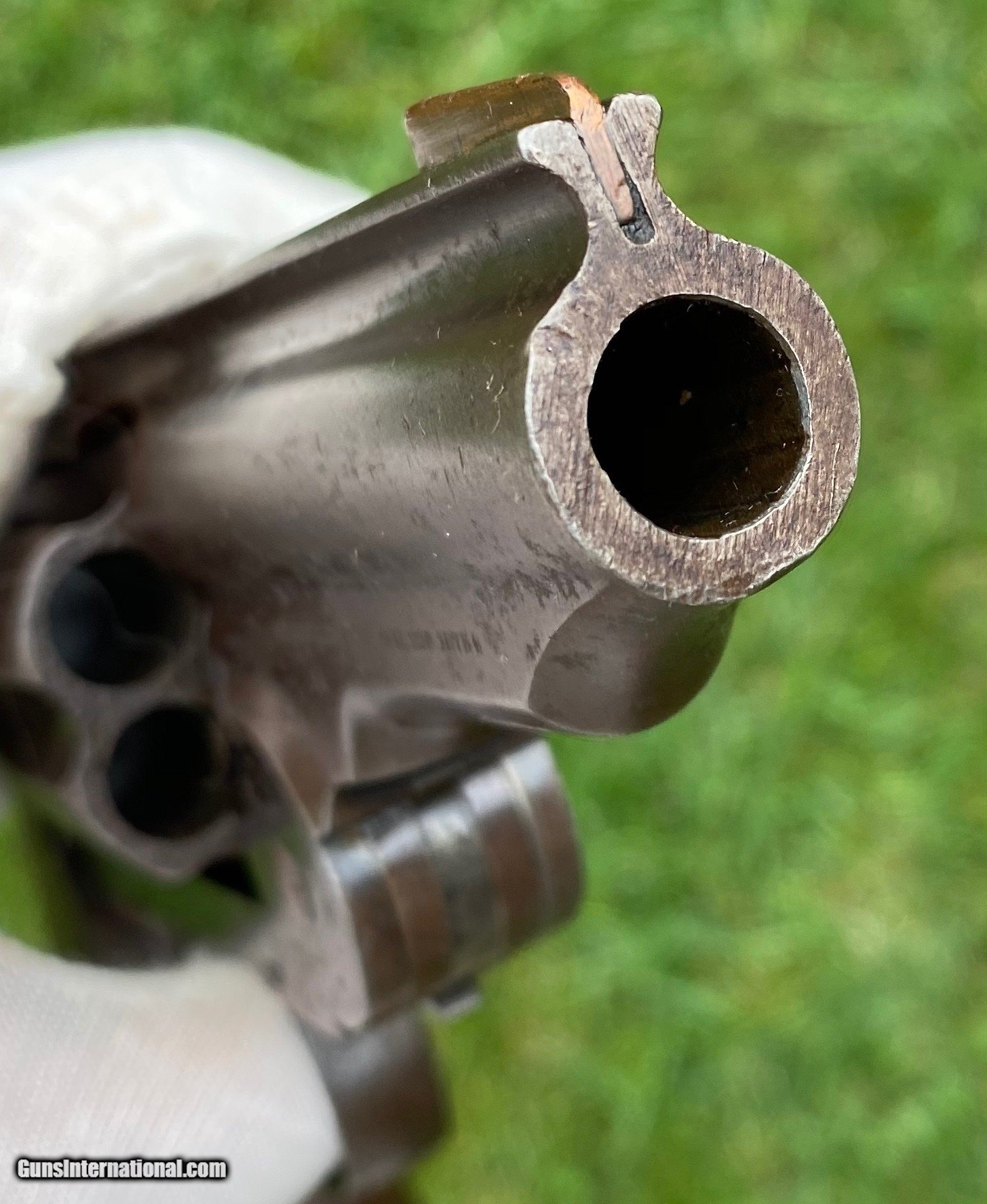 Description: This is a really cool gun, This is a Period modified Smith & Wesson Schofield converted to Belly Gun. The front sight is made of copper, the barrel measures 3 1/2". The grips I believe are replacements however they were made very well and dont detract in anyway from the originality appearence the revolver has. The frame shows a fair amount of original blue finish drifiting a bit. The barrel has nice strong markings still discernable.The serial number 5931 can be found on the cylinder and the butt. The butt is also stamped with a "US" and a "38". The hammer has faint traces of the color case hardened finish. Mechanically excellent. Overall a really interesting gun! This is the most reasonably priced Schofield on the market that I know of! Asking $2,100.00 SOLD Antique: Yes |