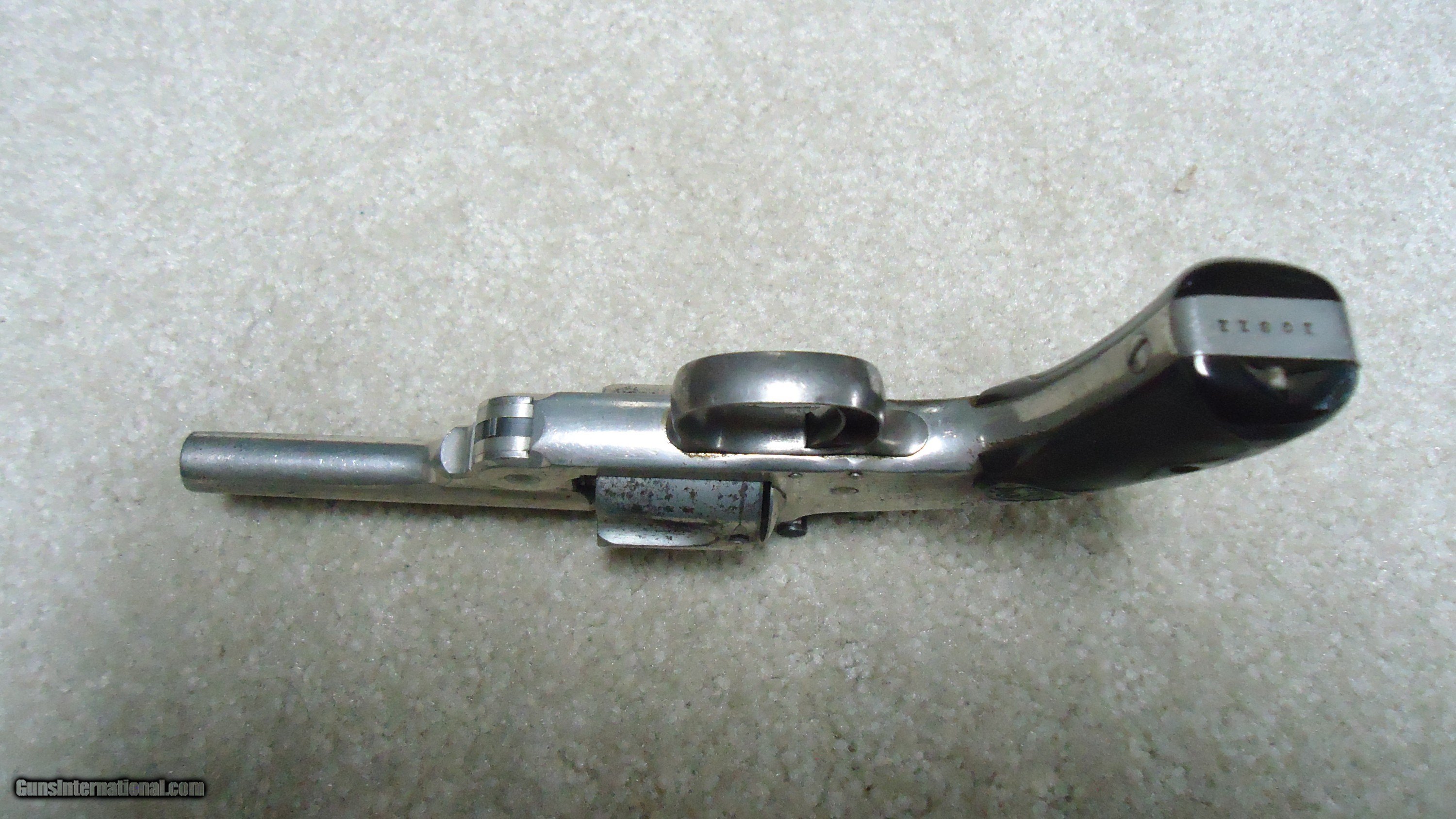 Description: RARELY ENCOUNTERED S&W MODEL 1891 .38 S&W CALIBER SINGLE ACTION REVOLVER, #10XXX, MADE 1890s. One of the most attractive of the top break line the Model '91 looks like a scaled down New Model No. 3. It was the only single action pocket revolver with a trigger guard instead of a spur trigger guard. Supposedly almost 27,000 of these were made, but as all the sources reveal, this model is seldom seen. Either the number produced is wrong (probably) or most of this model was exported (p0ssible) as most Americans by this time wanted their pocket revolvers t.o be double action- like the safety hammerless models in .32 and .38 S&W. Regardless, this is one of the most difficult models to find. This example with standard 3 1/4" barrel and nickel plated finish has all matching numbers on the frame, cylinder, cylinder latch and barrel. It has the correct black hard rubber grips with S&W monogram. Grips are fine with one chip on the bottom edge at the butt on the left side that is mainly visible when observed from the bottom. Fine nickel shows some flaking on the cylinder and some scattered light freckling on the barrel sides and frame sides. Still retains some light case color on the hammer sides and back. Exc. mech, tight overall, fine bright bore with scattered surface corrosion that ought to brush out. Excellent markings including the "MODEL OF 91" on the barrel top along with S&W address and patent dates etc. Comes with unmarked brown leather holster that is very aged but sound and obviously made for this revolver. Nice example and super difficult to find! SOLD Antique: Yes Handgun Caliber: .38 S&W (.38 Colt New Police, .38 Super Police) Manufacturer: SMITH & WESSON Model: 1891 REVOLVER Serial Number: 10XXX Barrel Length: 3 1/4 Condition: FINE Bore Condition: FINE |