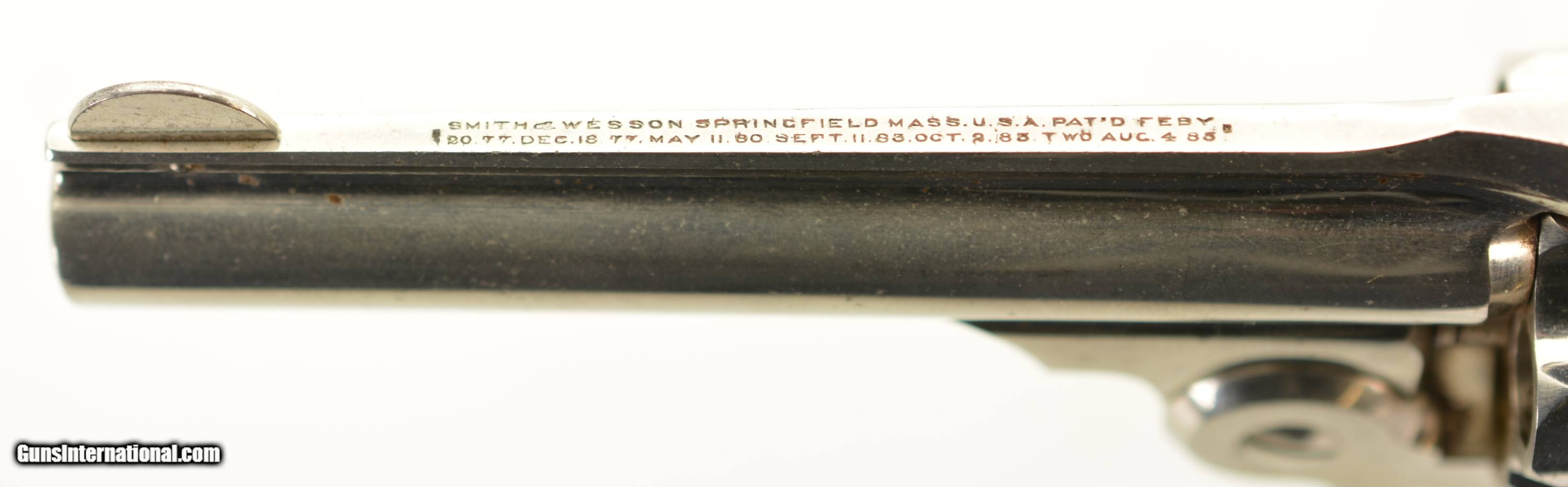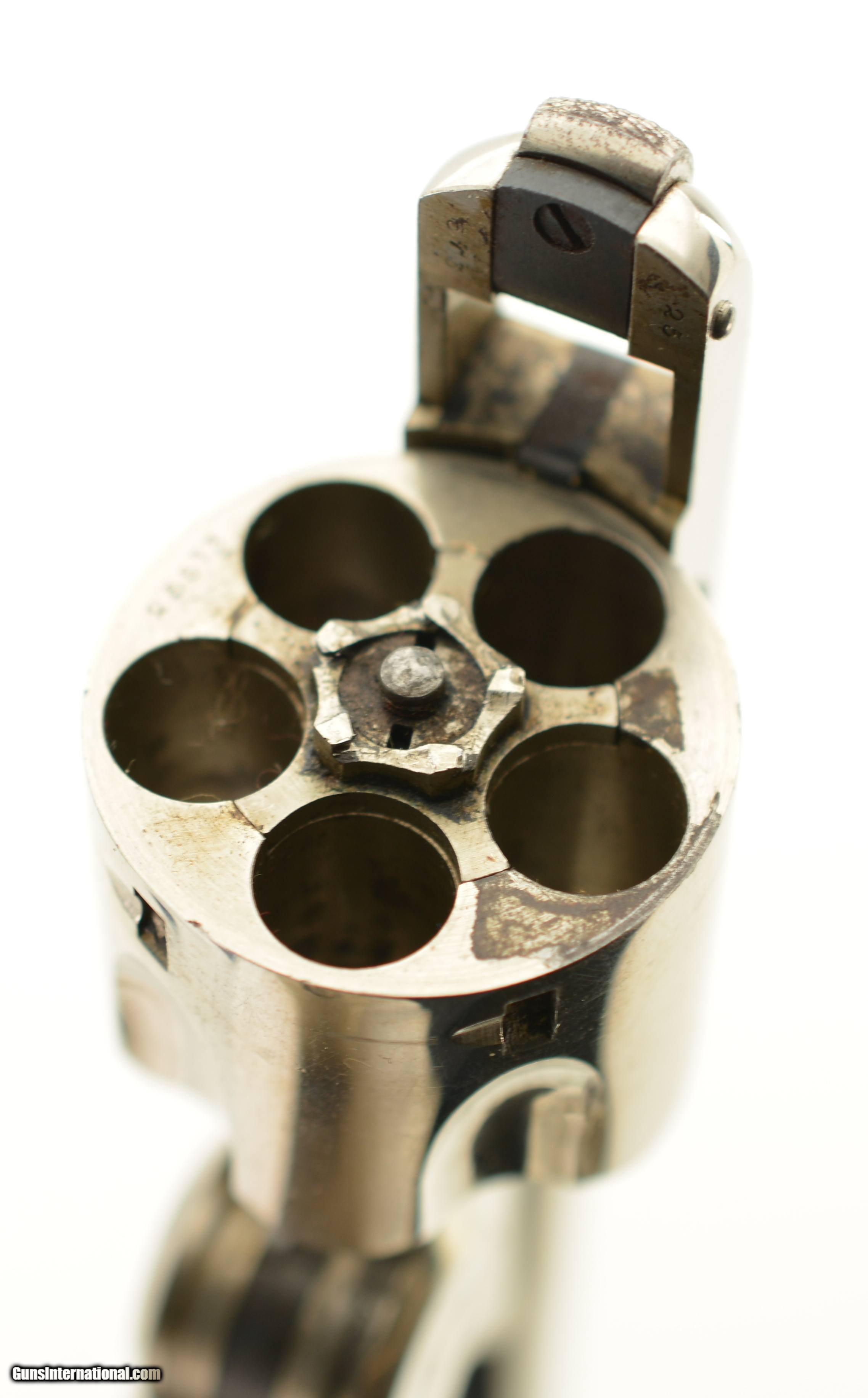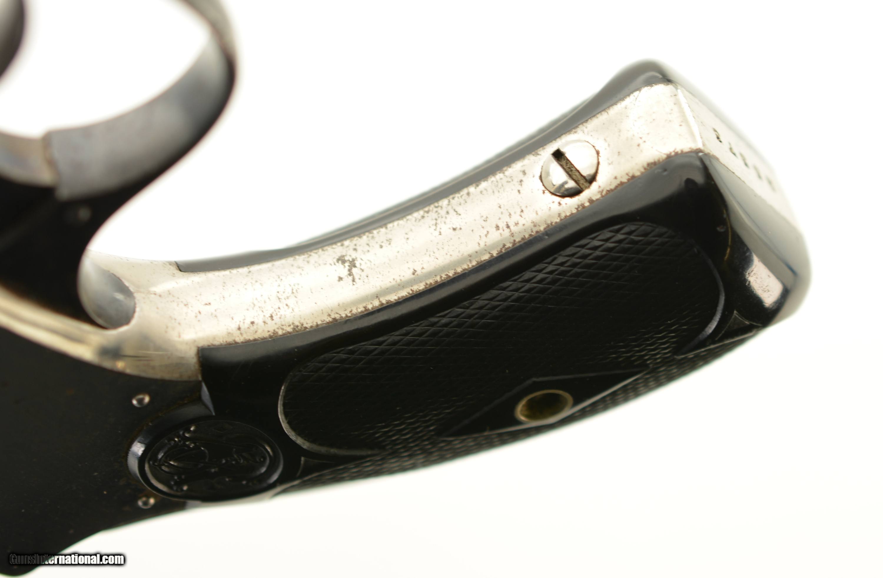 Description: Serial #25573, .32 S&W, 3 1/2" barrel with a very good, bright bore that has a few spots of dark pitting along its length. This is a great looking revolver that has matching numbers on the frame, cylinder, and barrel with the metal retaining 92-95% of the original nickel finish, that has a mild turn-ring and some small surface scratches and specks of brown freckling scattered about. The trigger has excellent original color case-hardening and the trigger guard and latch have most of their original blue remaining. The S&W hard rubber grips are numbered to the gun on the interior, and are in excellent shape with just some mild flattening to the points on both sides. The lock-up is tight with no lateral play in the hinge, and the mechanism functions flawlessly. This is a splendid little .32 "Lemon-Squeezer" and is in excellent overall condition. Antique SOLD Manufacturer: S&W Model: Safety Hammerless Serial Number: 25573 Caliber Info: .32 S&W Gauge Info: .32 S&W |