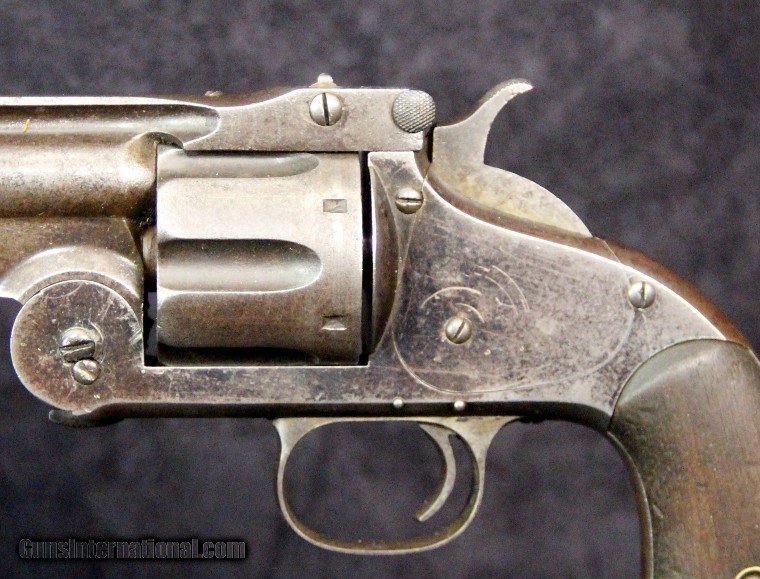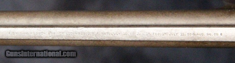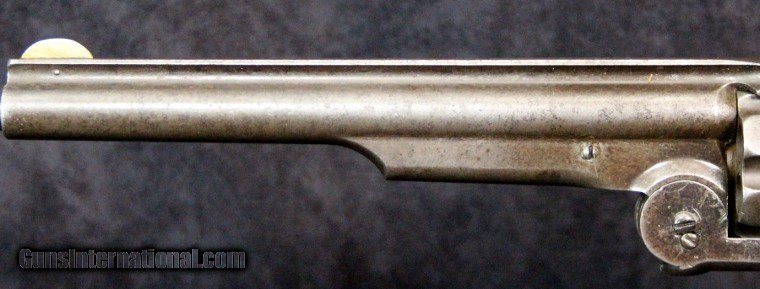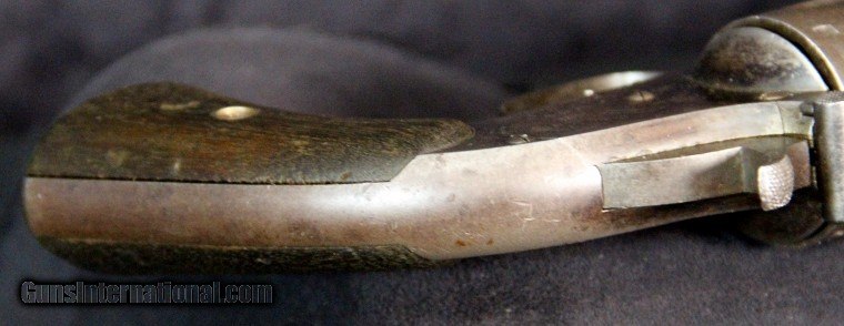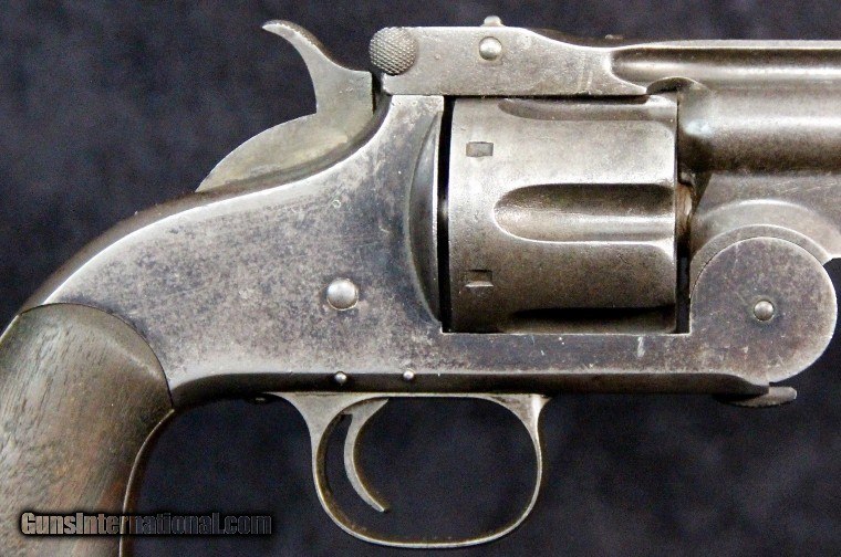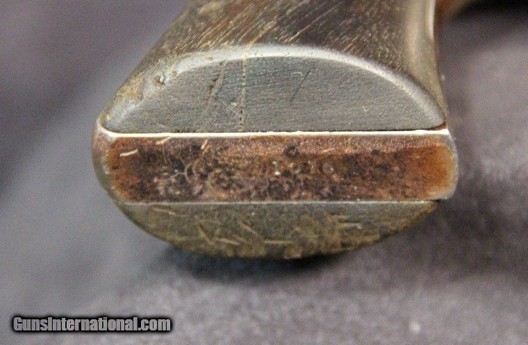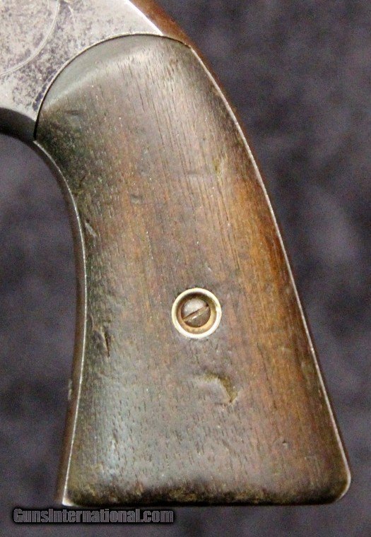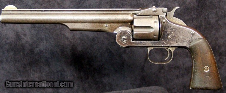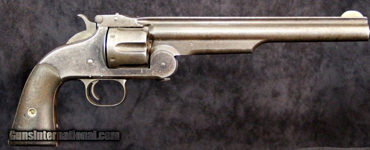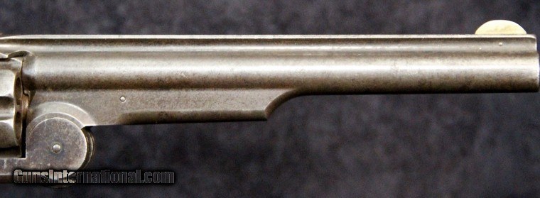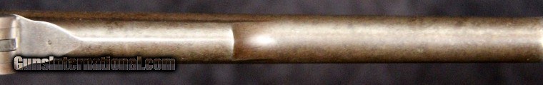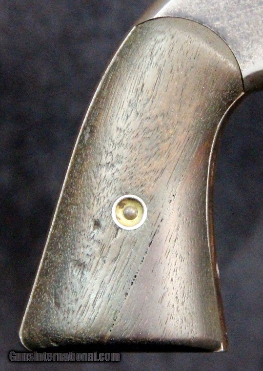 Description: .44 s&w, #1076, 8 inch barrel, blue finish, 2 piece walnut grips, matching, ejector ratchet has been replaced, early enough to have the "oil hole", with period catalog (Triumph) holster, 1872. Condition: very good bore, barrel is mostly gun metal with touches of blue in protected areas, 30% blue on frame, very good grips, right grip repaired, excellent mechanically, very good marks, holster is in very good condition. SOLD Antique: Yes |