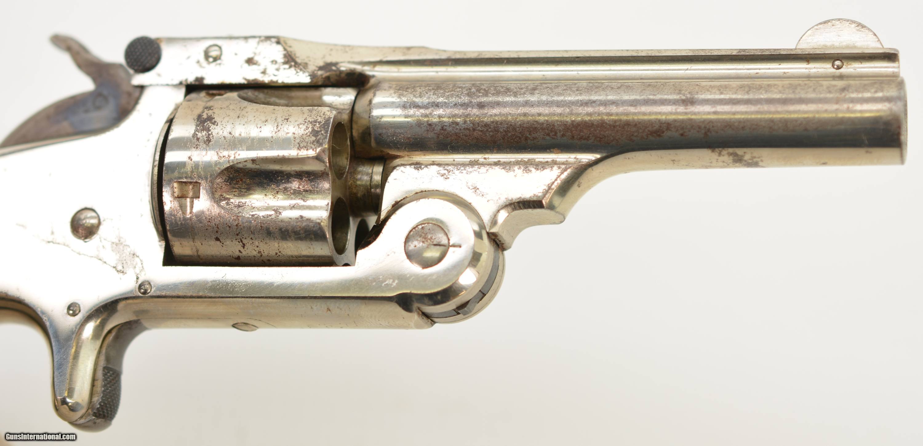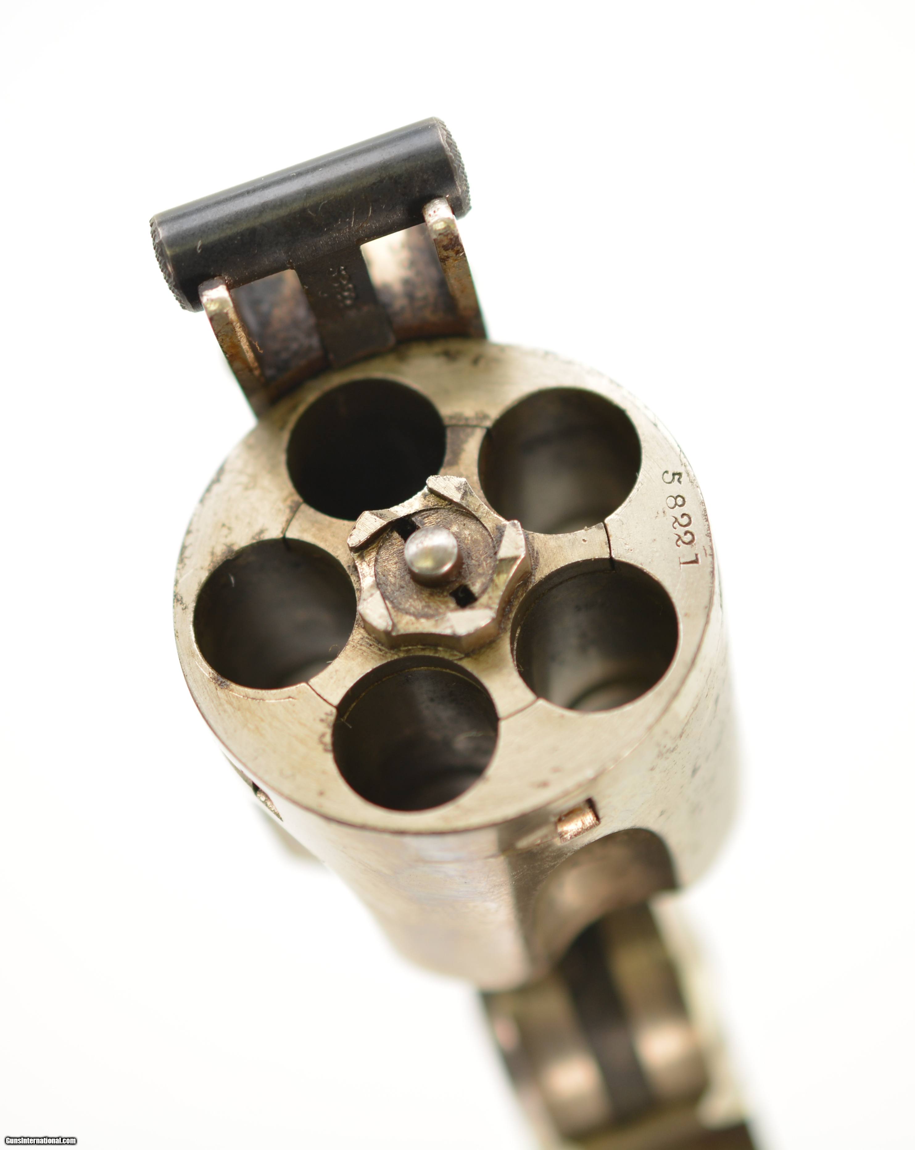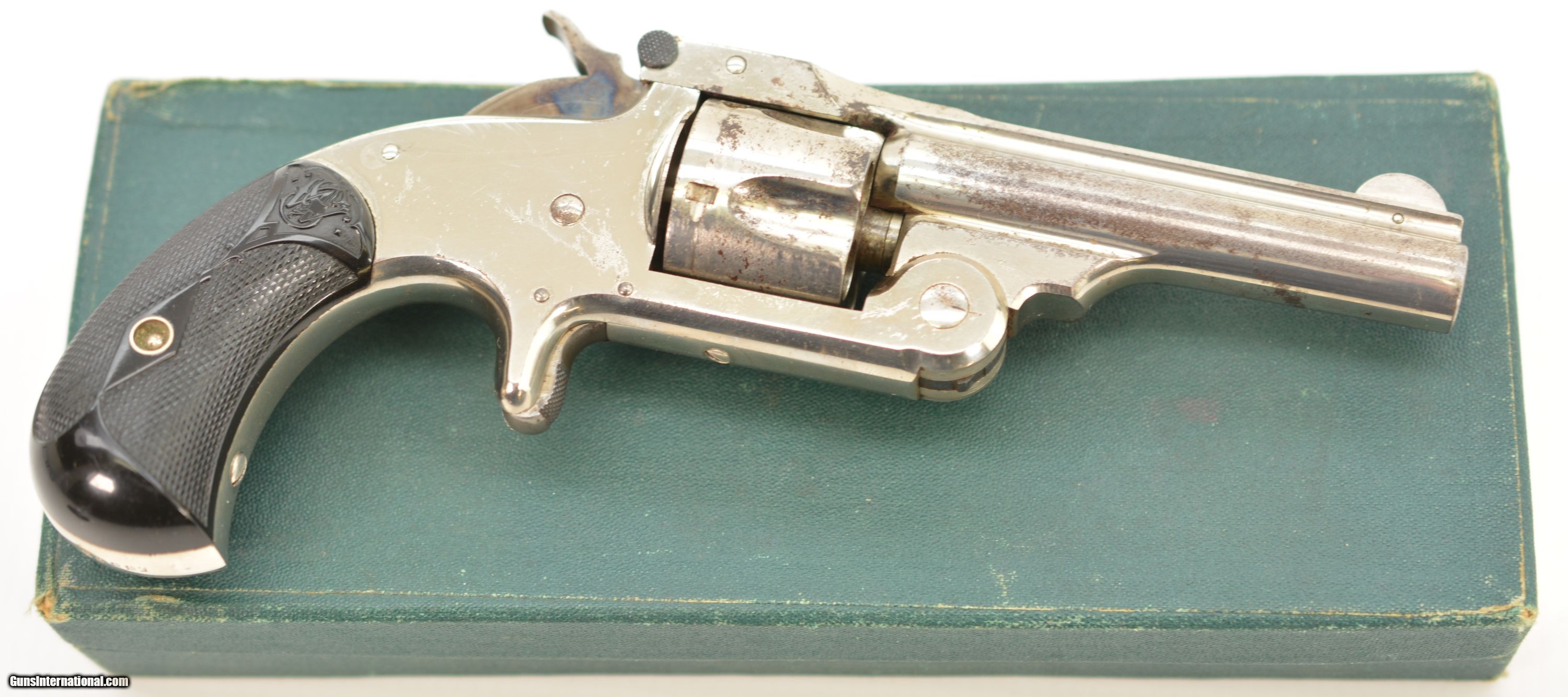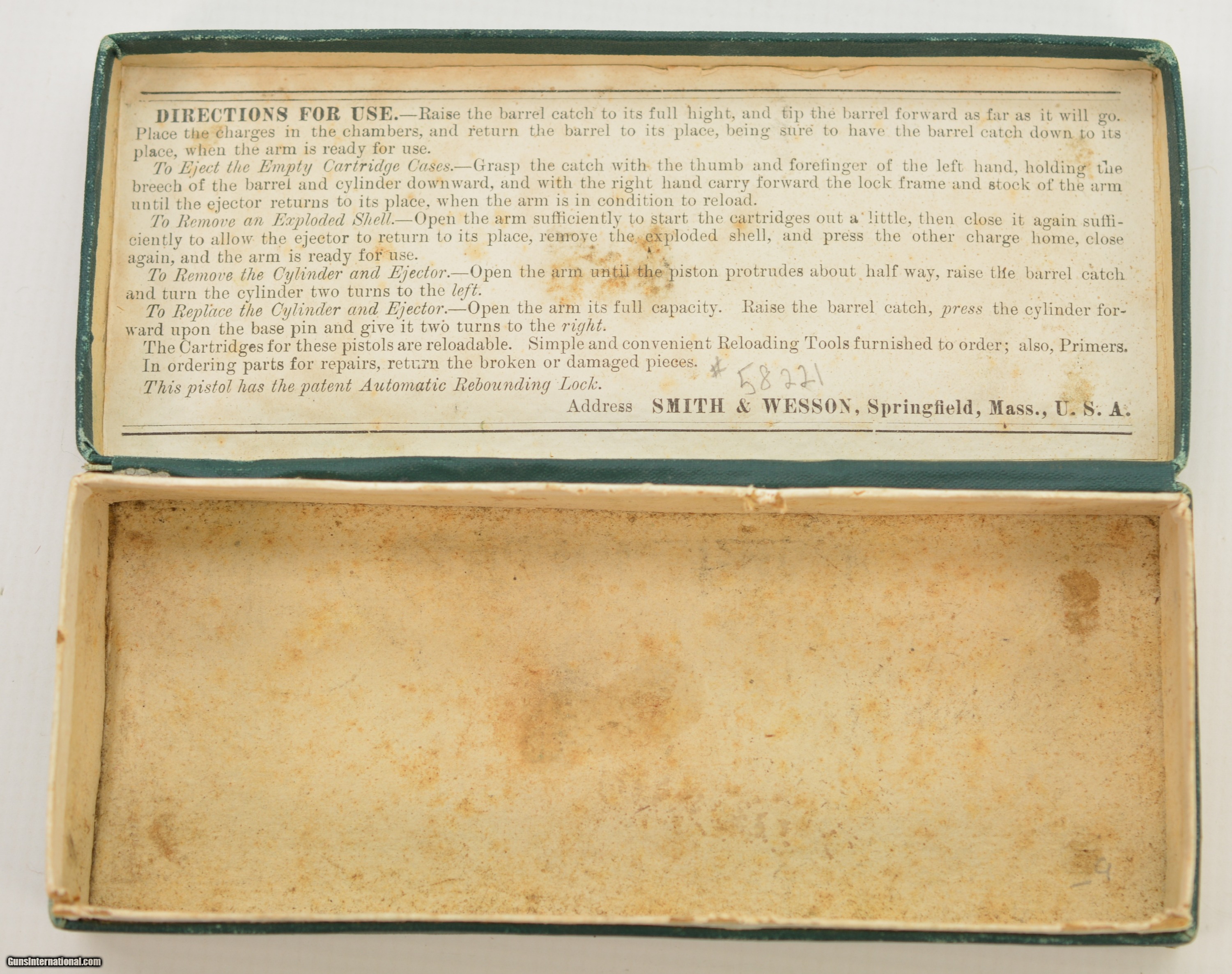 Description: Serial #58221, .32 S&W, 3" barrel with a fine, bright bore that has some mild freckling within the grooves and at the breech. This is a nice little revolver that has matching numbers on the frame, cylinder, barrel, and latch. The metal retains 80-85% of the original nickel finish with scattered spots of plum-brown flaking, most noticeably along the sides of the barrel, and the hammer has bright color case-hardening remaining. The checkered, hard rubber grips are in fine shape with some mild wear and very minor flattening of the points. The lock-up is tight, and the action functions flawlessly. The revolver is housed in a correct green cardboard box with intact paper end label. The box is in excellent shape, with only very minor edge and corner wear, and is numbered to a different gun on the bottom, although the number is not fully legible. This is a nice spur-trigger Smith & Wesson, and rates very good-fine condition overall. Antique SOLD Antique: Yes Manufacturer: S&W Model: No. 1 1/2 Serial Number: 58221 Caliber Info: .32 S&W Gauge Info: .32 S&W |