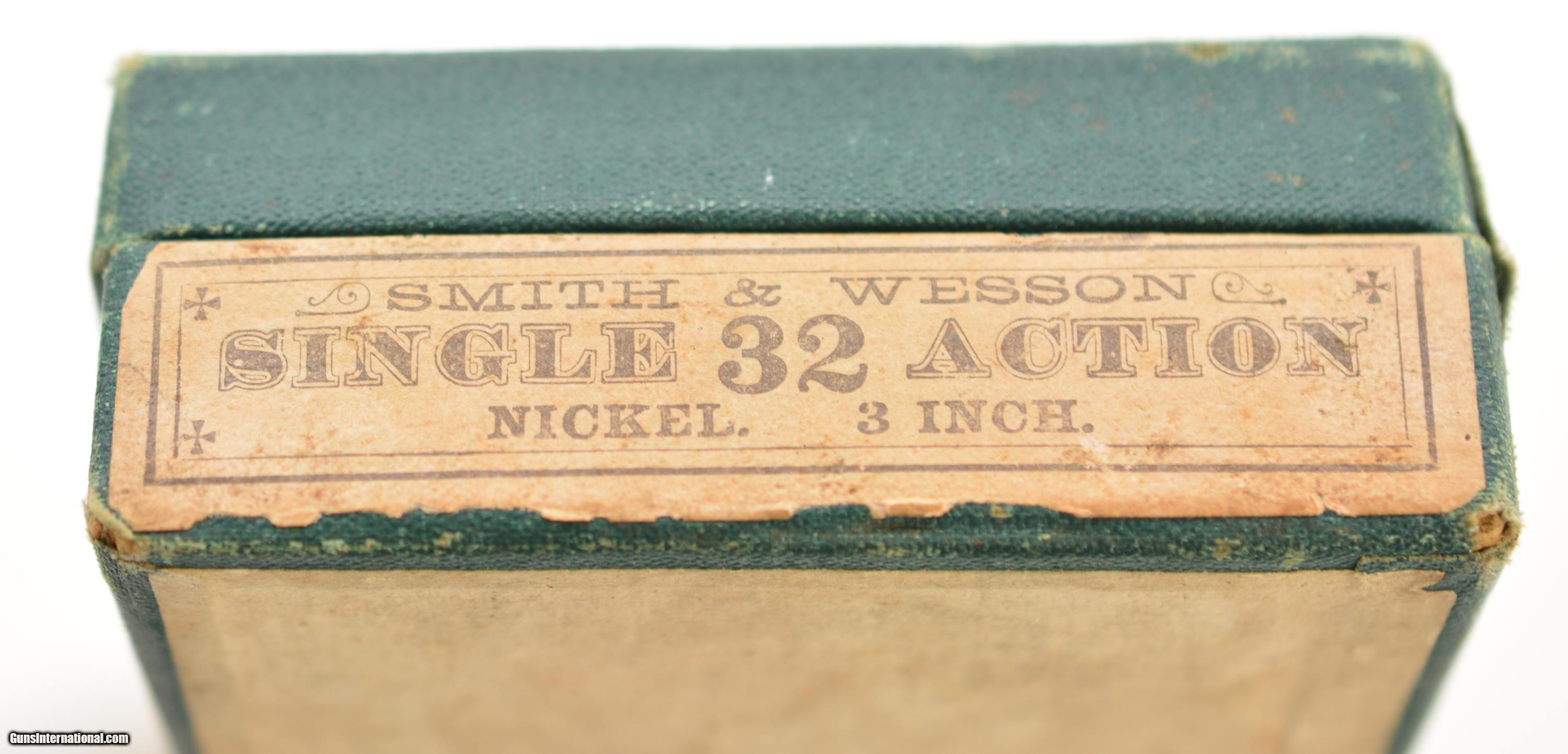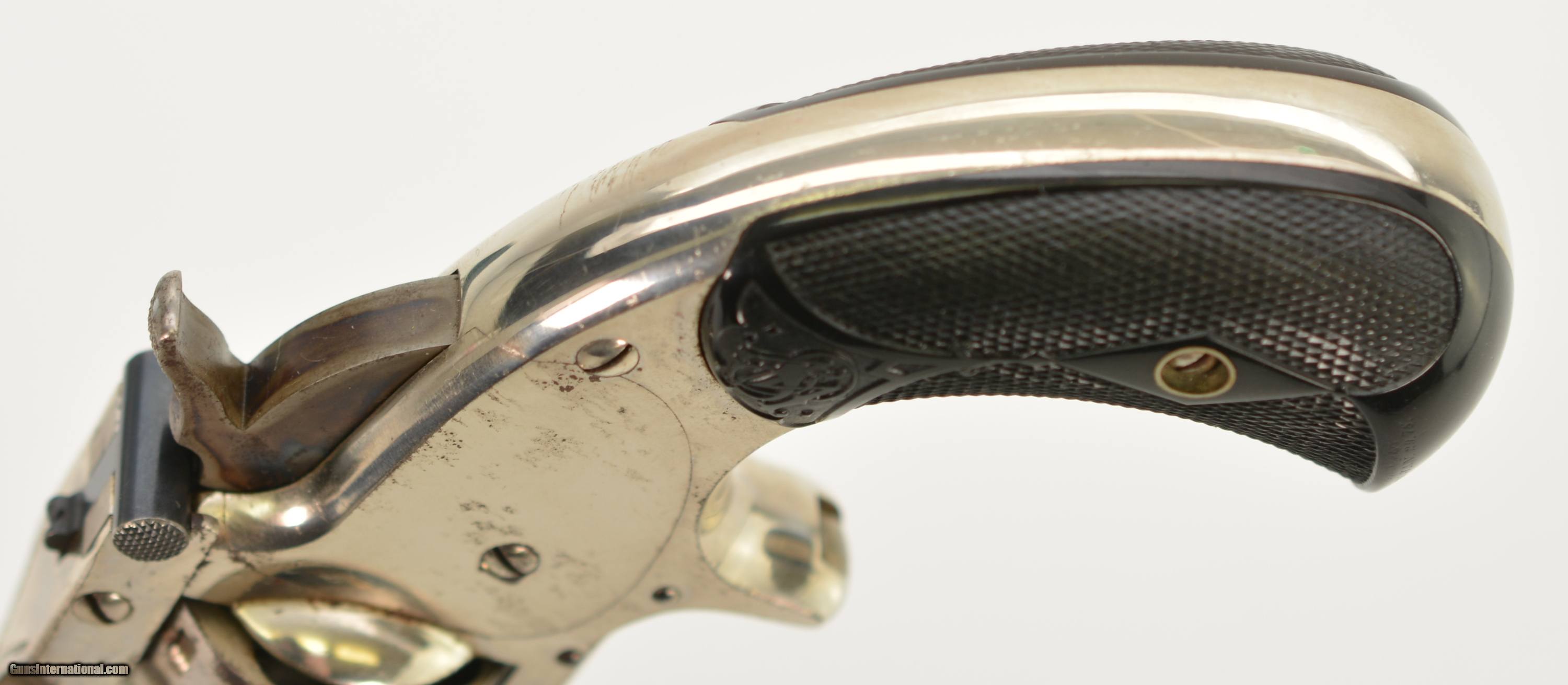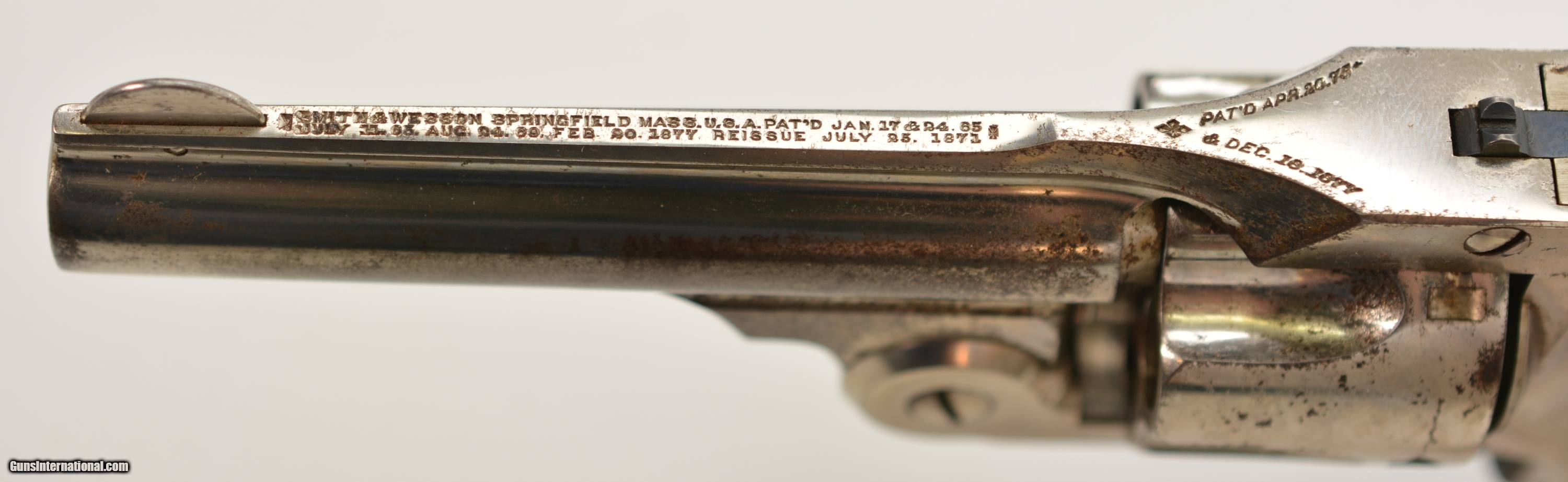 Description: Serial #58221, .32 S&W, 3" barrel with a fine, bright bore that has some mild freckling within the grooves and at the breech. This is a nice little revolver that has matching numbers on the frame, cylinder, barrel, and latch. The metal retains 80-85% of the original nickel finish with scattered spots of plum-brown flaking, most noticeably along the sides of the barrel, and the hammer has bright color case-hardening remaining. The checkered, hard rubber grips are in fine shape with some mild wear and very minor flattening of the points. The lock-up is tight, and the action functions flawlessly. The revolver is housed in a correct green cardboard box with intact paper end label. The box is in excellent shape, with only very minor edge and corner wear, and is numbered to a different gun on the bottom, although the number is not fully legible. This is a nice spur-trigger Smith & Wesson, and rates very good-fine condition overall. Antique SOLD Antique: Yes Manufacturer: S&W Model: No. 1 1/2 Serial Number: 58221 Caliber Info: .32 S&W Gauge Info: .32 S&W |
