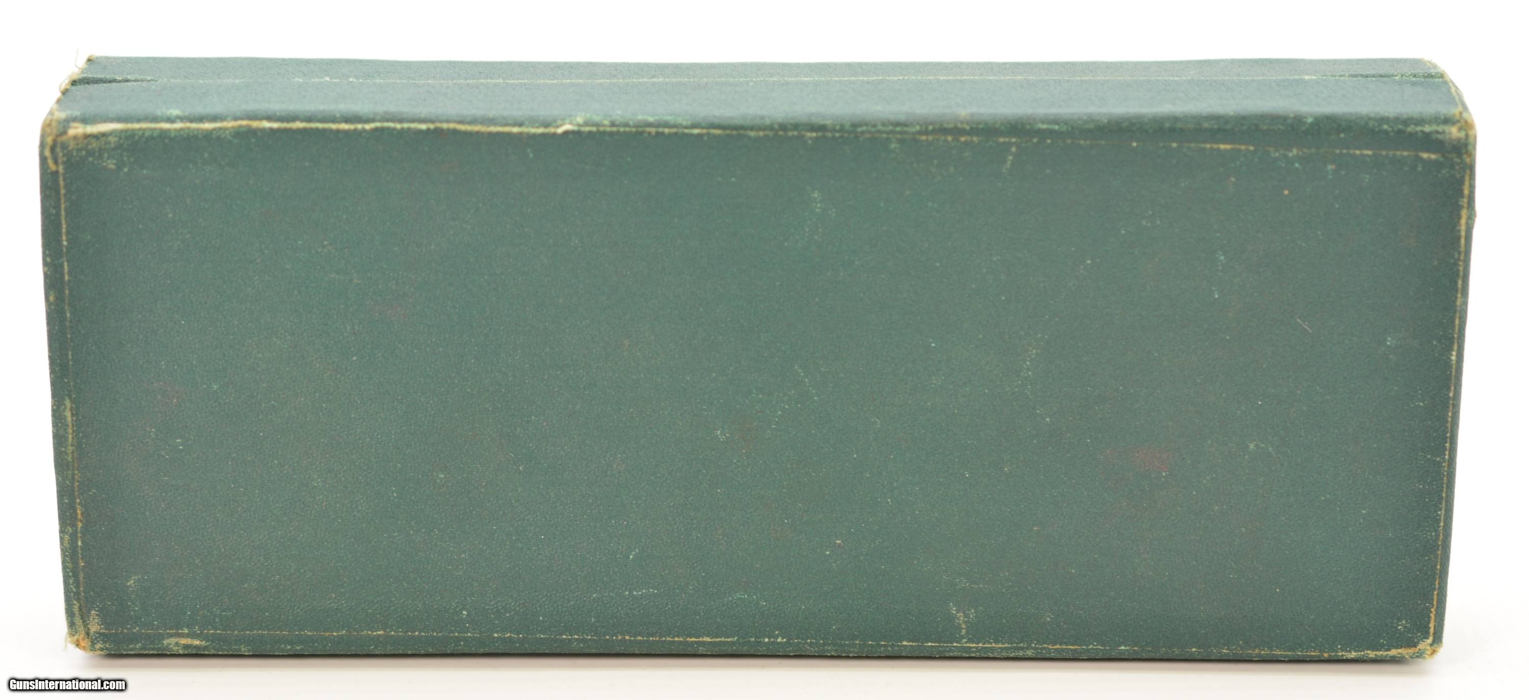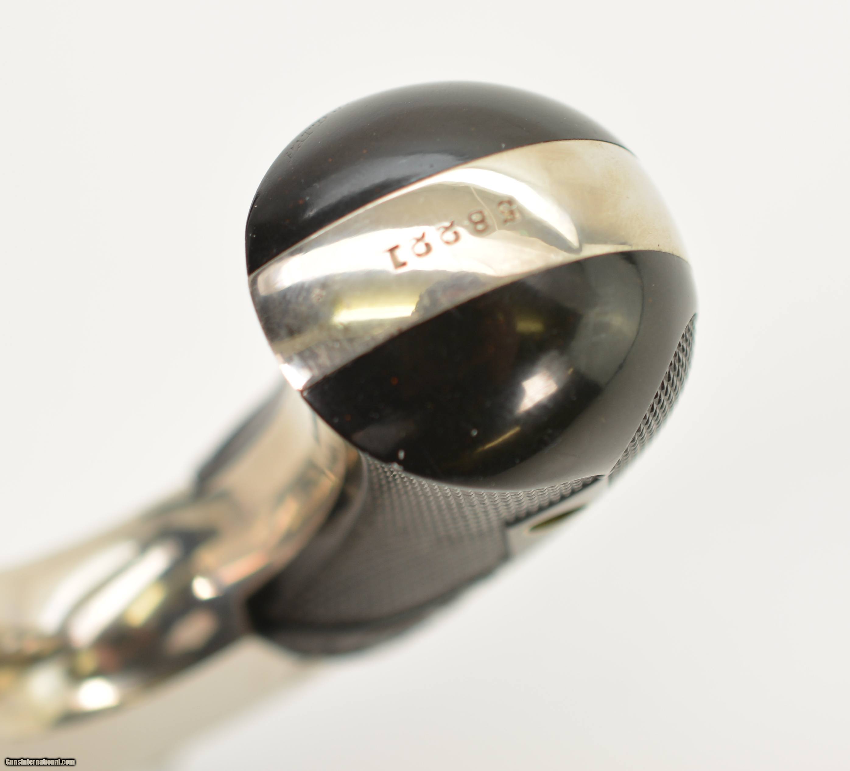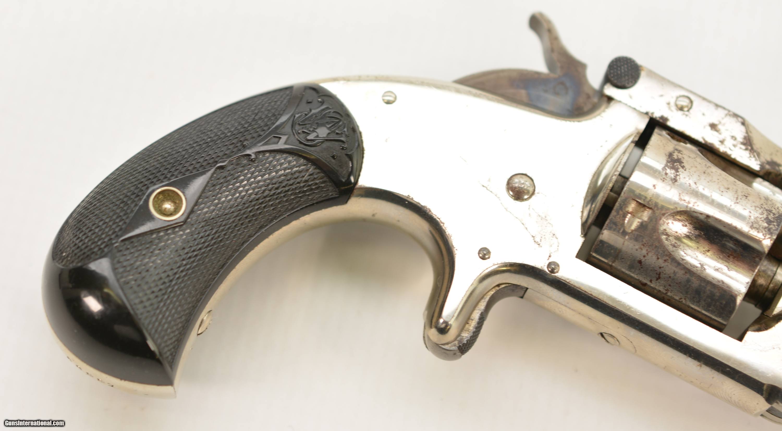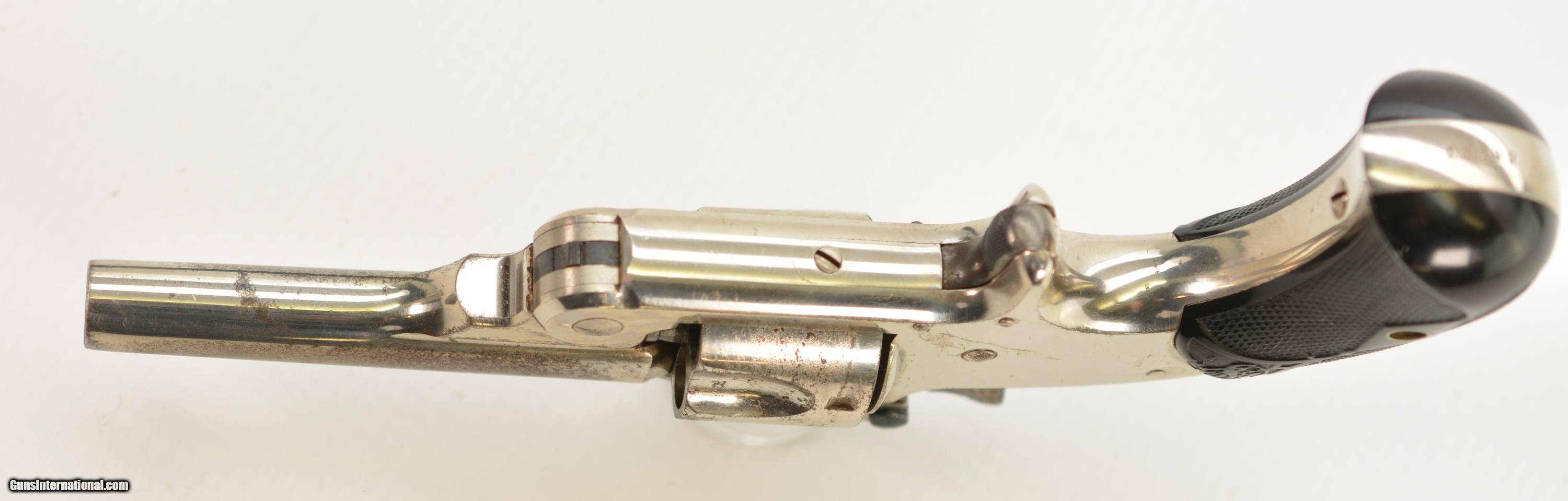 Description: Serial #58221, .32 S&W, 3" barrel with a fine, bright bore that has some mild freckling within the grooves and at the breech. This is a nice little revolver that has matching numbers on the frame, cylinder, barrel, and latch. The metal retains 80-85% of the original nickel finish with scattered spots of plum-brown flaking, most noticeably along the sides of the barrel, and the hammer has bright color case-hardening remaining. The checkered, hard rubber grips are in fine shape with some mild wear and very minor flattening of the points. The lock-up is tight, and the action functions flawlessly. The revolver is housed in a correct green cardboard box with intact paper end label. The box is in excellent shape, with only very minor edge and corner wear, and is numbered to a different gun on the bottom, although the number is not fully legible. This is a nice spur-trigger Smith & Wesson, and rates very good-fine condition overall. Antique SOLD Antique: Yes Manufacturer: S&W Model: No. 1 1/2 Serial Number: 58221 Caliber Info: .32 S&W Gauge Info: .32 S&W |