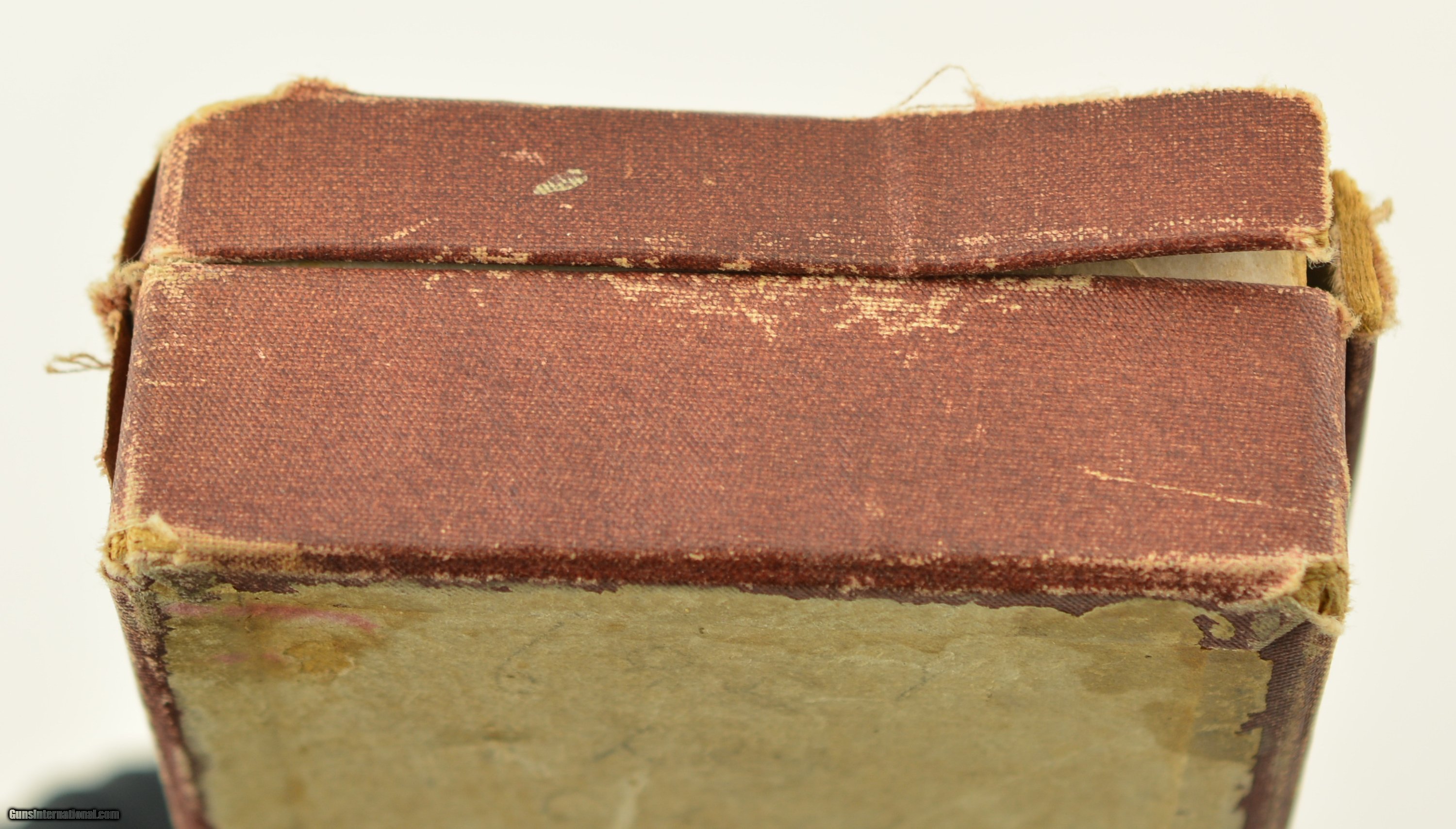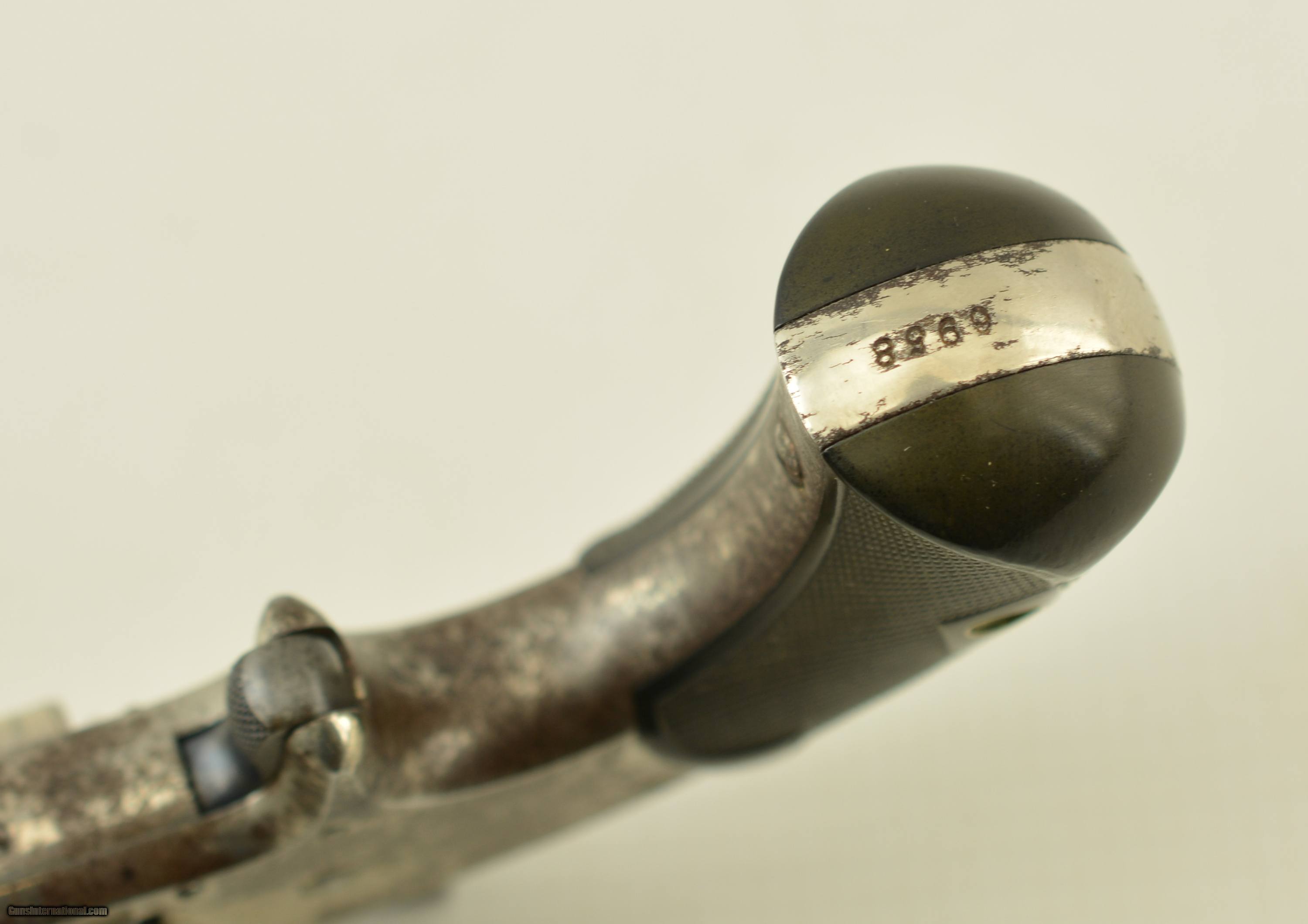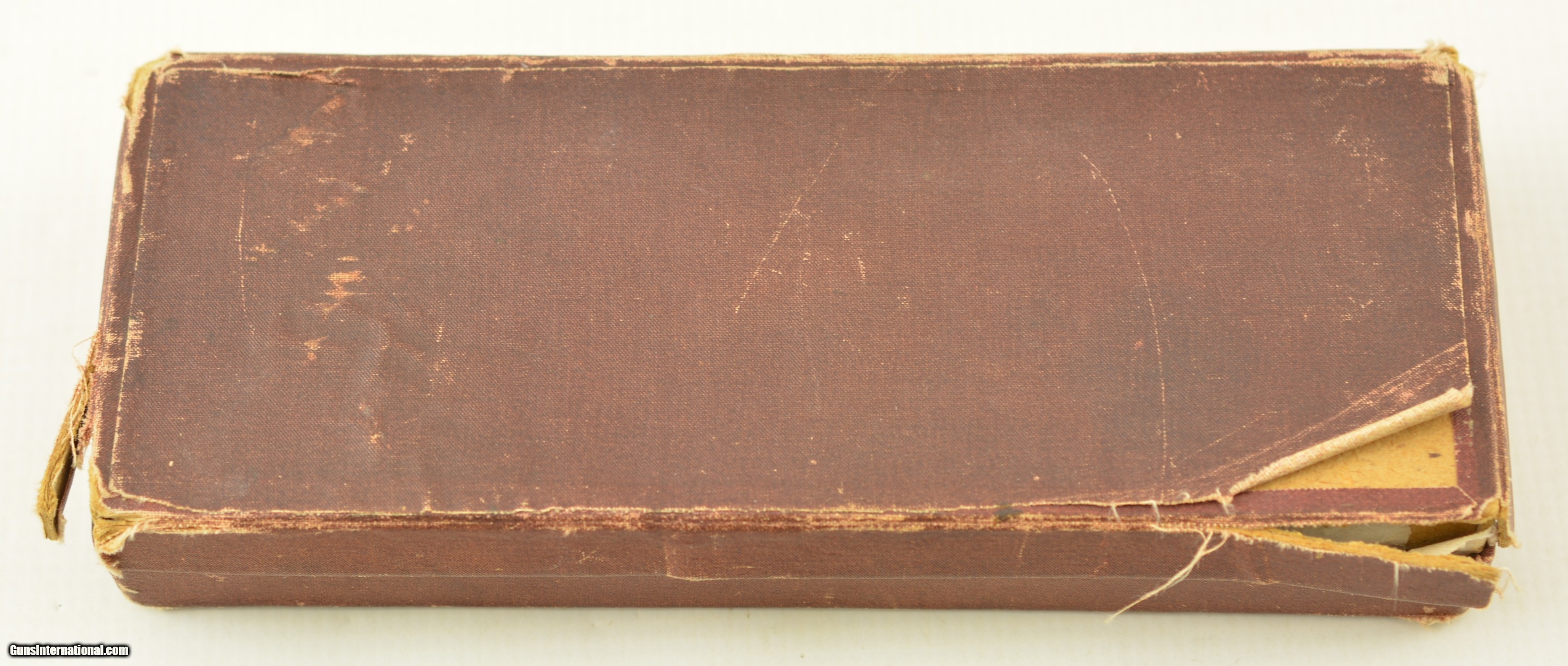 Description: Serial #6958, .32 S&W, 3 1/2" barrel with a fine, bright bore that has some mild freckling within the grooves. This is a nice little revolver that has matching numbers on the frame, cylinder, barrel, and latch. The metal retains 60-70% of the original nickel finish with even, plum-brown freckling throughout; heaviest on the barrel and gripstraps. The latch retains its original blue, and the hammer has muted, but still visible color case-hardening. The checkered, hard rubber grips are in fine shape with some mild wear (mostly confined to the butt on the right panel) and very minor flattening of the points. The lock-up is tight, and the action functions flawlessly. The revolver is housed in its original one-piece red box that has extensive damage to the lid, and faint, but still legible matching number on the bottom. Additionally, the revolver comes with a 2014 dated S&W Factory Letter that gives a shipping date of June 29, 1878 to M.W. Robinson Co. in New York City. This is a nice spur-trigger Smith & Wesson, and rates very good condition overall. Antique SOLD Antique: Yes Manufacturer: S&W Model: 1 1/2 Serial Number: 6958 Caliber Info: .32 S&W Gauge Info: .32 S&W |