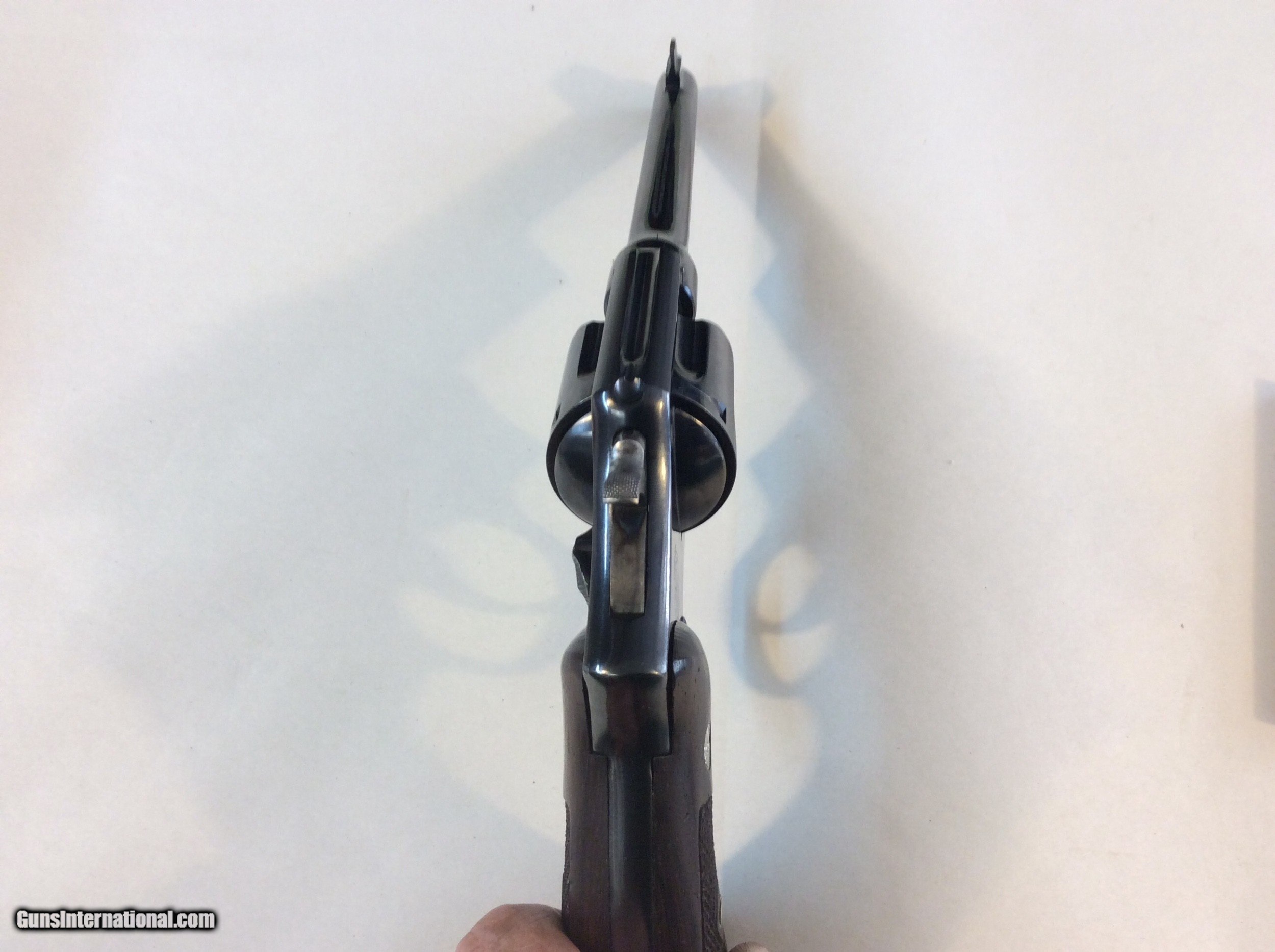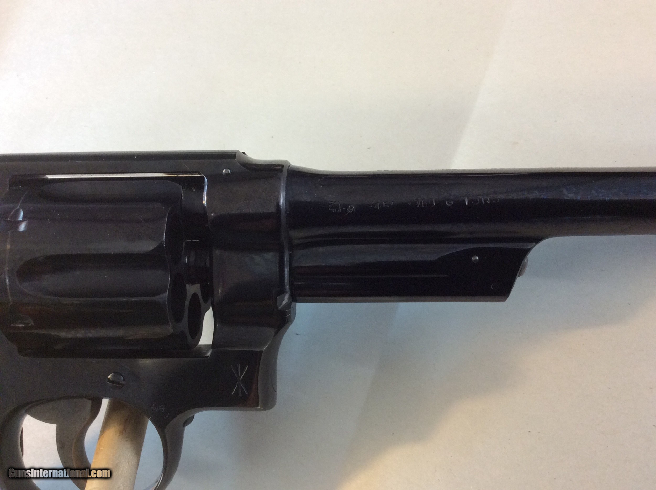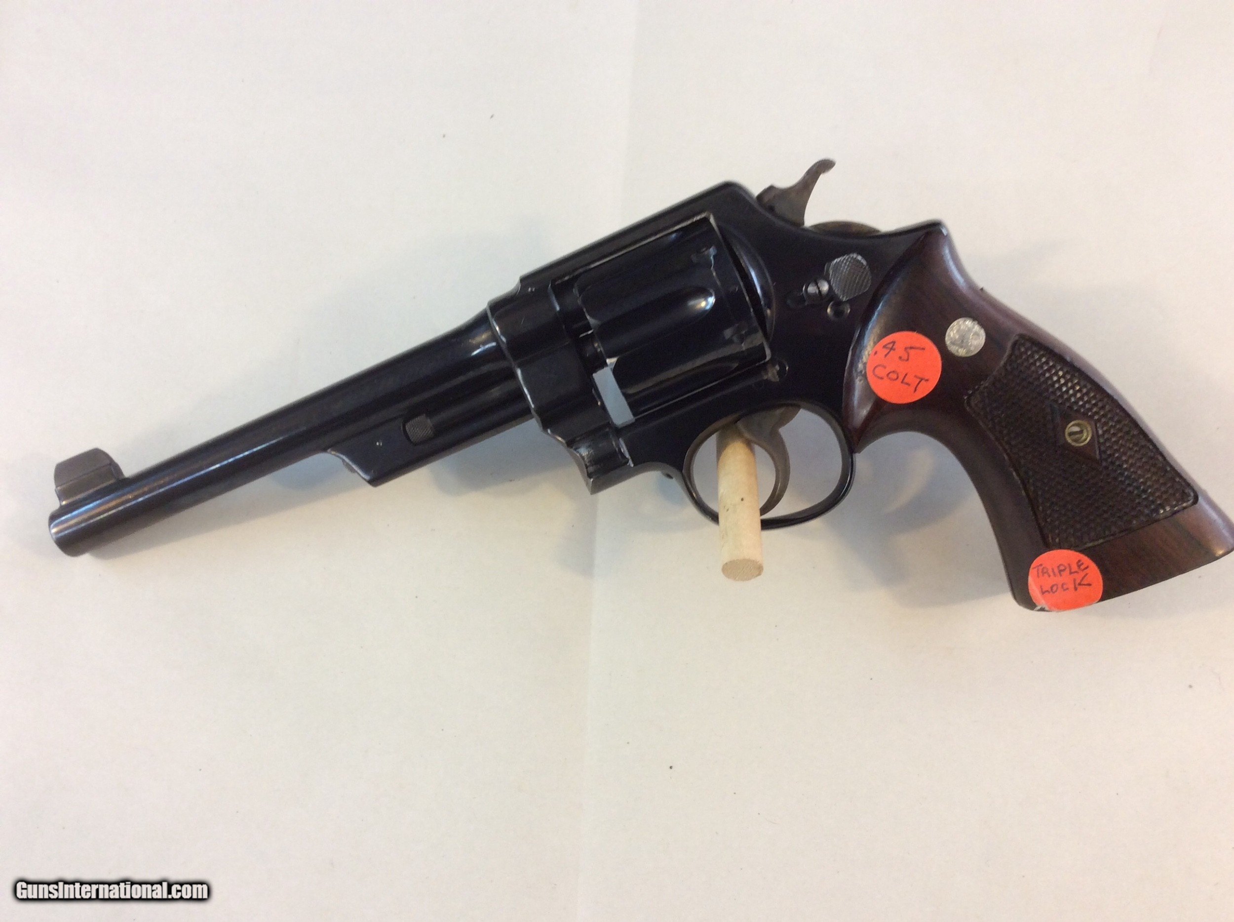 Description: For your viewing is a early first or second S & W triple lock in 45 LC, 6 1/2” barrel. As the serial number is only four digits 25XX blue book states there were duplicate serial numbers between first and second models. The grips do have the monogram but seem to be maybe replaced. The interesting markings on the revolver is British markings on right side of the barrel, maybe a lend lease revolver from WW 1. Definettly, it has been reblued. It has a very good barrel, lots of case color on the hammer and trigger. A shooter for sure, but also a piece of history. If you know about the British markings, i sure would like to know more about them. call or email for more info etc. o n this revolver. Thanks for looking SOLD |