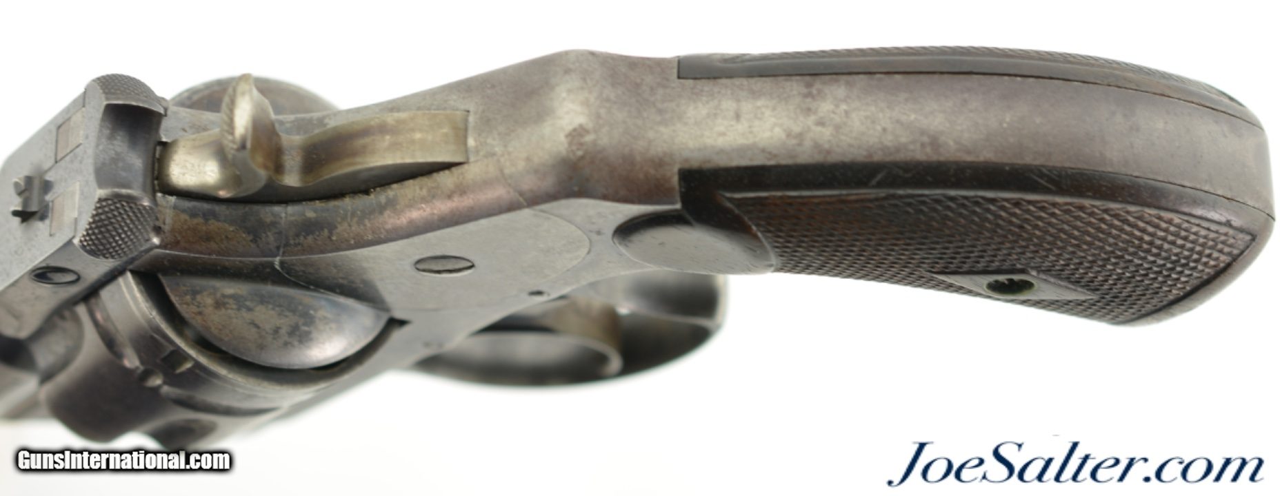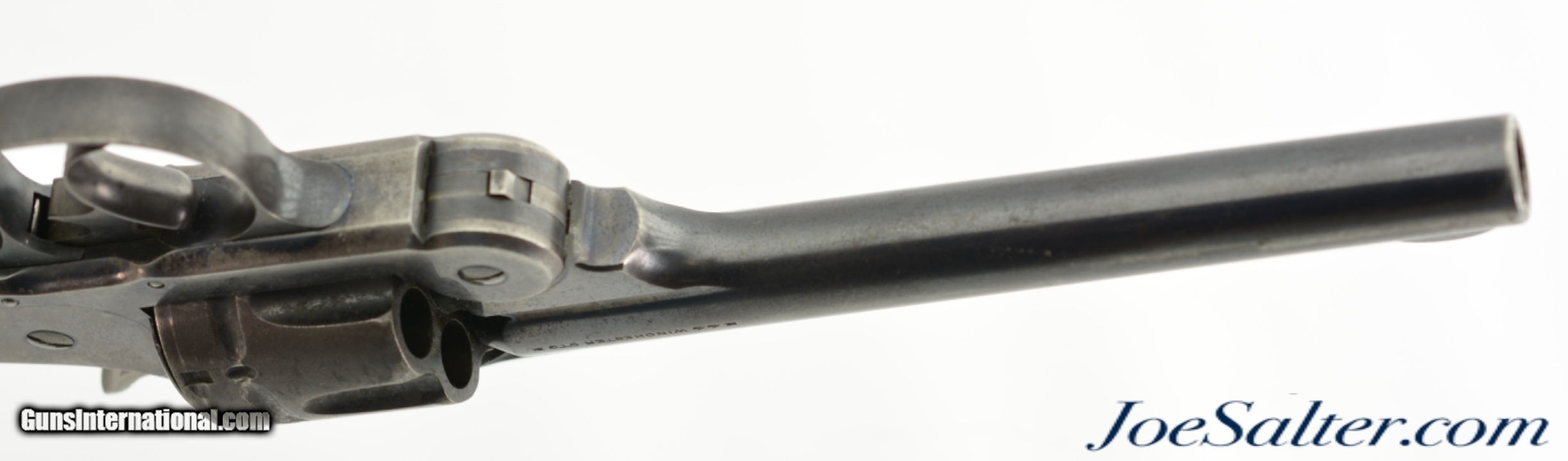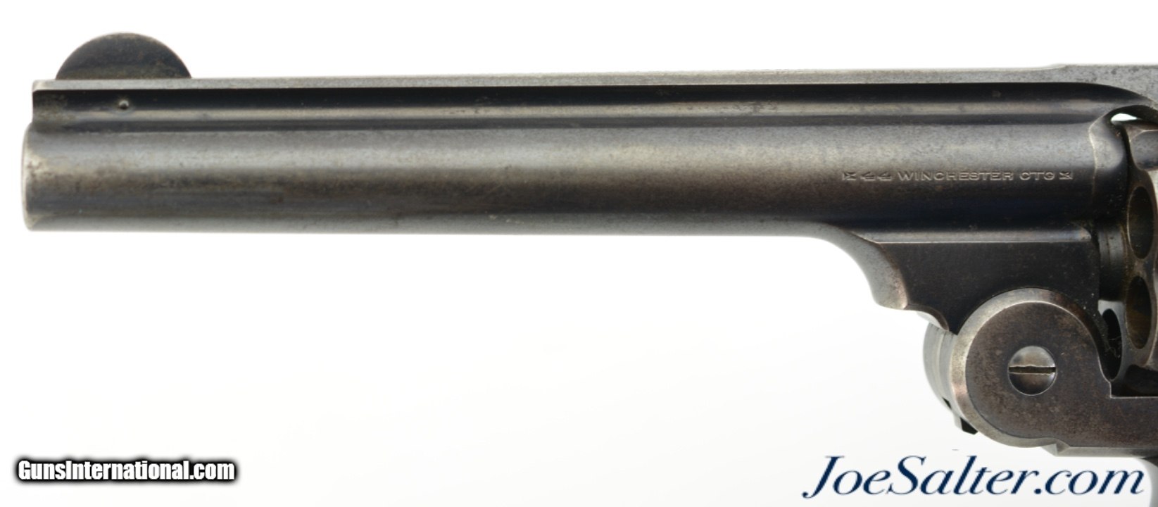 Description: Serial #13355, .44-40 (.44 WCF), 6 1/2" barrel with a fine, bright bore that has traces of freckling within the grooves. This is a handsome revolver that retains 70-75% of the original blue finish on the metal with silvering and fading at the muzzle, as well as along the sides of the barrel. The rear of the frame has some further ruddy-brown freckling towards the grip/frame juncture, with further gray fading along the gripstraps, which have developed a dull plum-brown patina. Areas of original blue remain within the cylinder flutes, with the balance of the metal having a pale gray-brown patina, while the hammer and trigger have some original color case-hardened finish remaining and pale, freckled gray on the balance. The frame, cylinder, barrel, and latch all have matching numbers. The checkered walnut grips are correct, but numbered to a different gun on the interior. The grips are in very good condition with some minor handling marks and some flattening of the points, mainly on the right side panel. The lock-up is still tight and the revolver functions perfectly in both single and double-action. The revolver is accompanied by a 2016 dated Smith & Wesson factory letter that lists a shipping date of July 16, 1904, to the J.M. Hadesty & Son Co. (no address given). This is a handsome DA Smith and is in fine original condition. Antique; SOLD Antique: Yes |