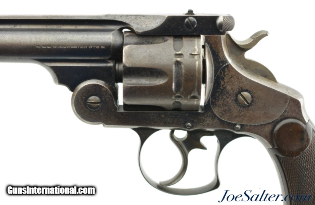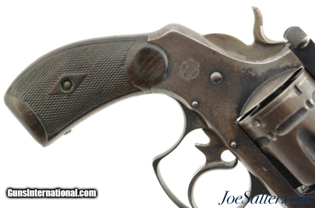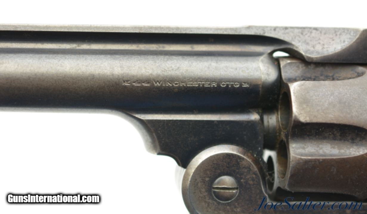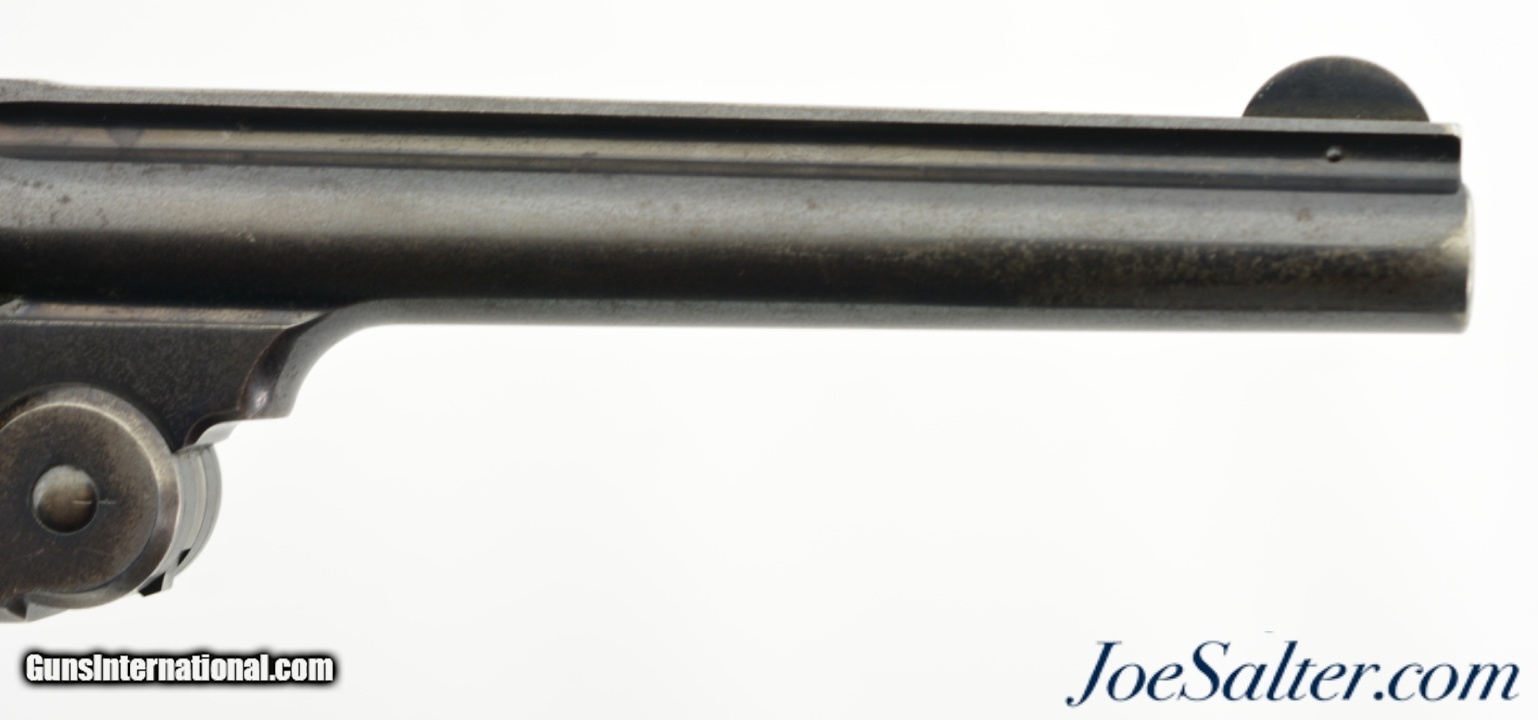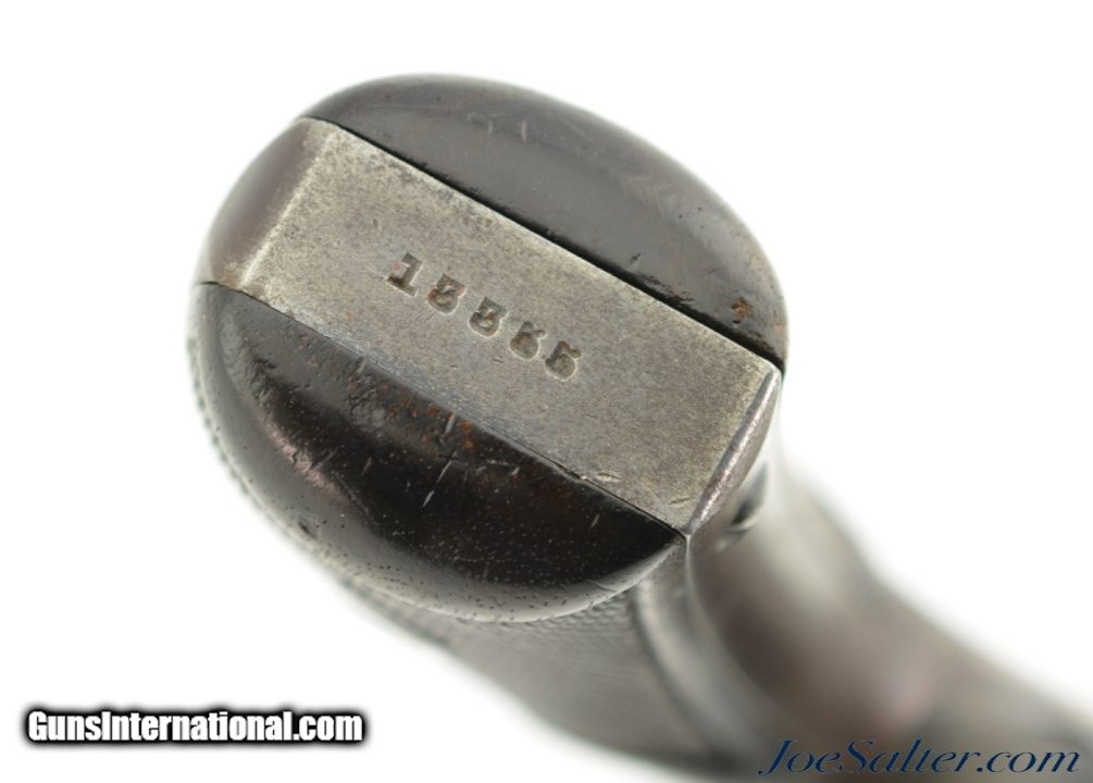 Description: Serial #13355, .44-40 (.44 WCF), 6 1/2" barrel with a fine, bright bore that has traces of freckling within the grooves. This is a handsome revolver that retains 70-75% of the original blue finish on the metal with silvering and fading at the muzzle, as well as along the sides of the barrel. The rear of the frame has some further ruddy-brown freckling towards the grip/frame juncture, with further gray fading along the gripstraps, which have developed a dull plum-brown patina. Areas of original blue remain within the cylinder flutes, with the balance of the metal having a pale gray-brown patina, while the hammer and trigger have some original color case-hardened finish remaining and pale, freckled gray on the balance. The frame, cylinder, barrel, and latch all have matching numbers. The checkered walnut grips are correct, but numbered to a different gun on the interior. The grips are in very good condition with some minor handling marks and some flattening of the points, mainly on the right side panel. The lock-up is still tight and the revolver functions perfectly in both single and double-action. The revolver is accompanied by a 2016 dated Smith & Wesson factory letter that lists a shipping date of July 16, 1904, to the J.M. Hadesty & Son Co. (no address given). This is a handsome DA Smith and is in fine original condition. Antique; SOLD Antique: Yes |