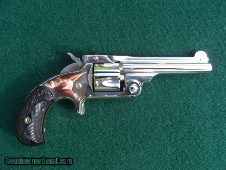 Description: S&W Model 1 1/2 single action revolver made between 1878 & 1892, 3 1/2 inch barrel, 32 S&W caliber, 5 shot fluted cylinder, checkered hard rubber grips. In NEW condition looks like it has never been fired. SOLD Curio/Relic: Yes Antique: Yes |