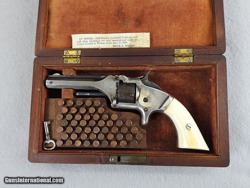 This is very nice S&W Model No.1 Second Issue with a nice factory case with wood cartridge board and factory warranty. It comes with old ivory grips, probably shipped with the gun. The mechanical function is very good crisp and tight and the barrel is tight to the frame. The bore is very good with strong rifling. The serial number is 119814 and was made about 1866 or 1867.The cartridge board contains 52 original 22 rimfire black powder cartridges. There is a key in the box but it does not lock. Must ship UPS. “CAN NOT SELL TO CANADA” I would consider trades for pre 1899 ANTIQUE PISTOLS and rifles on any of my items.. WHAT DO YOU HAVE TO TRADE? Ask about our 30-90 day lay-away program.We accept Bank Check, Money order, Personal checks or wire transfer.
