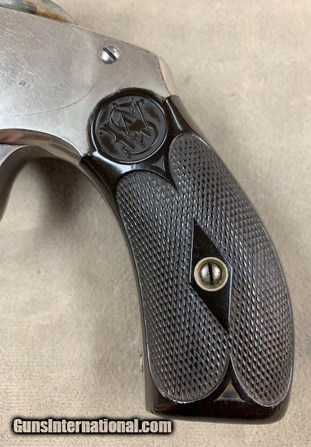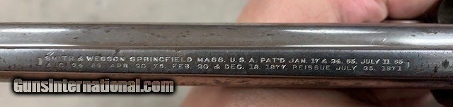 Description: REDUCED - An exceptional original S&W New Model No 3 with target sights, 6.5 inch barrel, factory nickel finish, perfect gutta percha grips, etc. Revolver has an excellent bright bore and perfect chambers, all matching numbers, etc. Just about 95% original nickel finish on the frame and cylinder and about 60% on the barrel assembly (sides of barrel flaked to a nice patina). Hammer and trigger guard showing strong original case color that is fading somewhat. Screws not buggered at all. Mechanically the revolver is in perfect working order and the action is tight as can be, with perfect timing. Serial range is 2242x. SOLD Curio/Relic: Yes Antique: Yes |