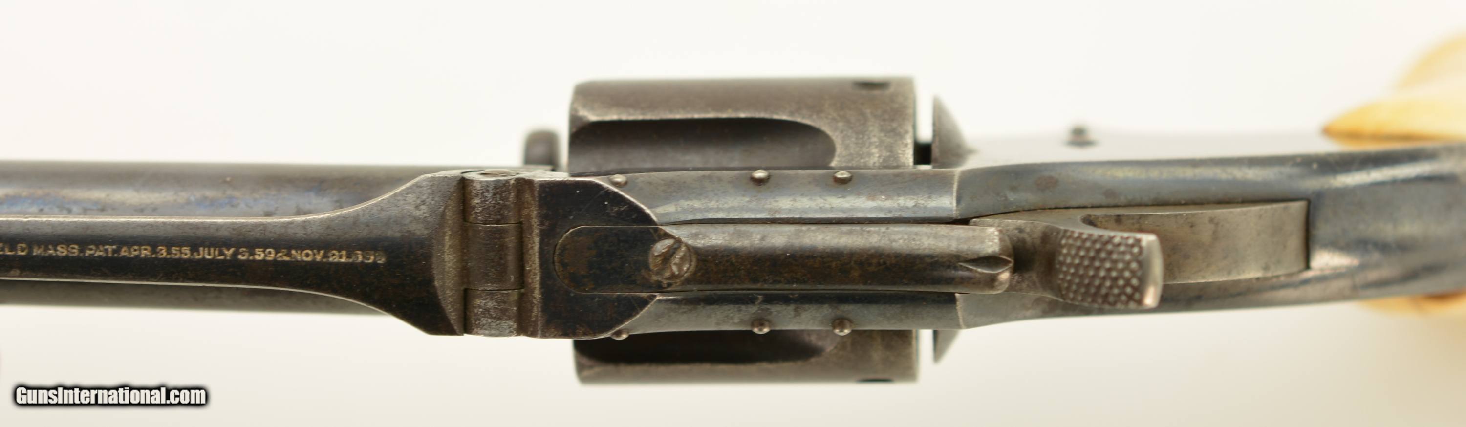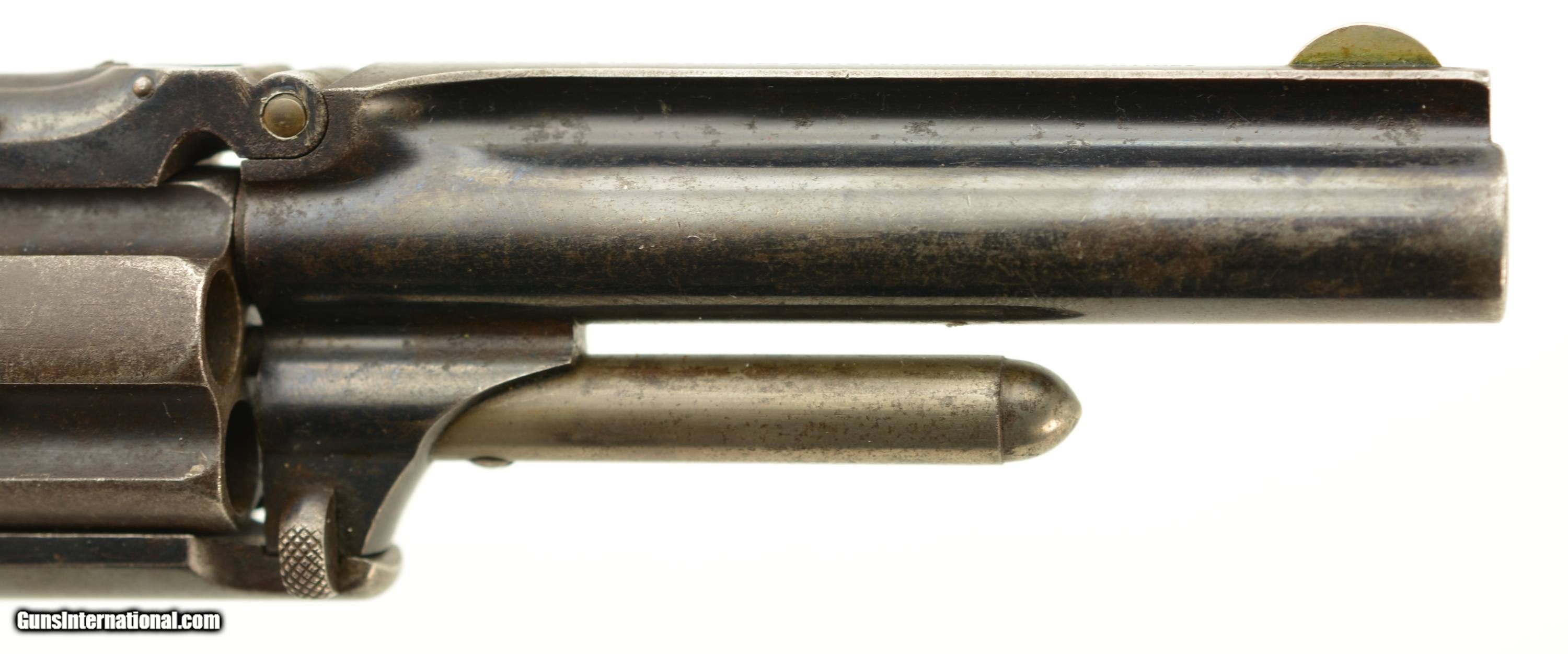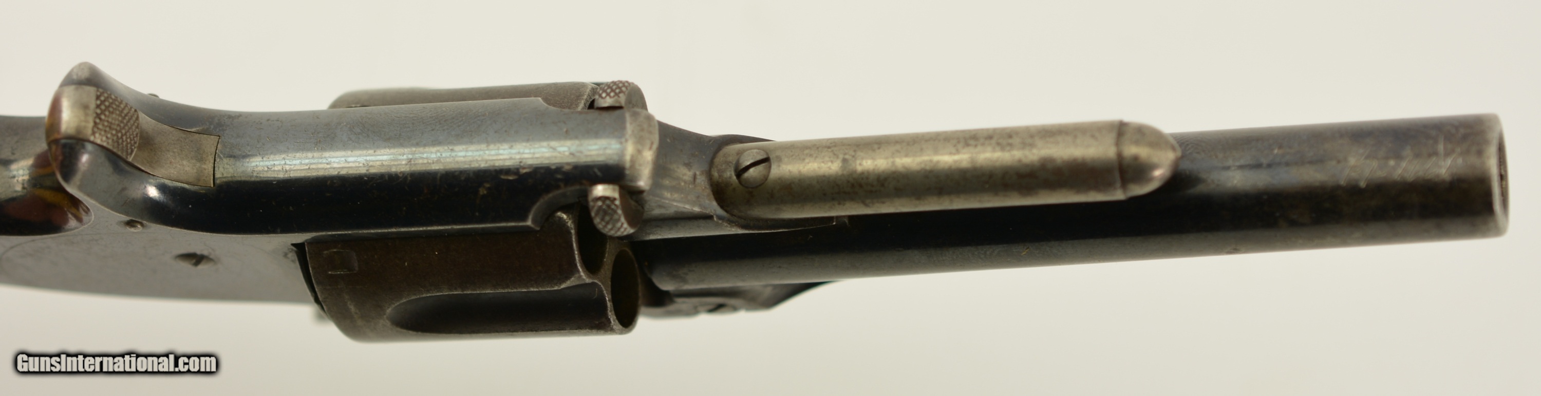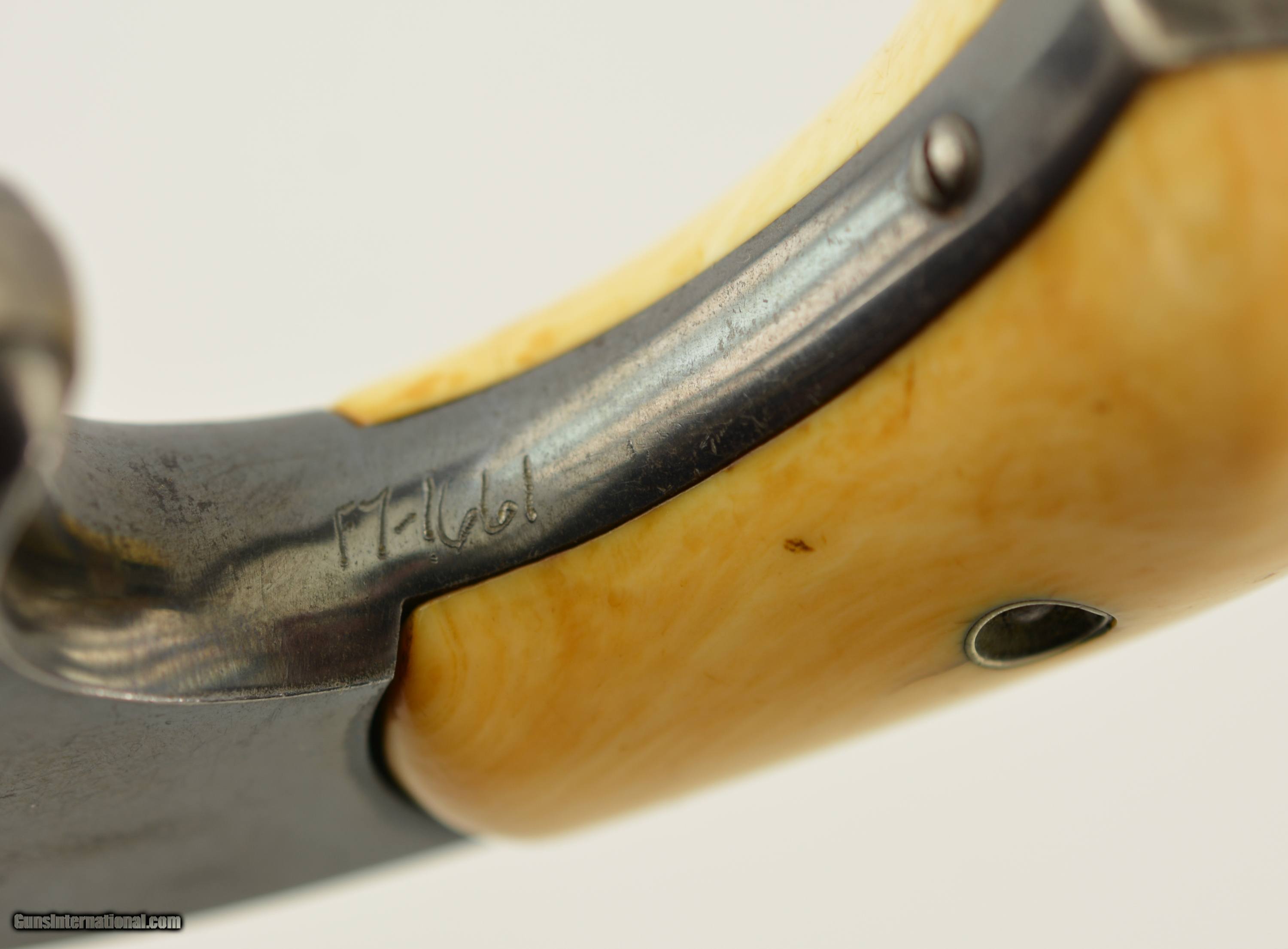 Description: Serial #104486, .32 RF, 3 1/2" barrel with a fair-good bore having light pitting and freckling within the grooves. The metal surfaces of this revolver retain about 75-80% original bright blue with fading along the cylinder, and the sides of the barrel flaked to a mottled gray patina. The trigger, hammer and ejector retain some muted color case-hardening, with the sides of the hammer still retaining some vibrant colors. Some of the screw heads show light slot wear and the barrel address and patent dates remain crisp and clear. The revolver wears a set of handsome, period ivory grips that rate very good plus, although the base of the left panel has a small chip and a number of hairline age cracks. Both panels have an attractive, mellow patina. The barrel lock-up is good, with some lateral play, and the action is mechanically functional. This is a very good 1 1/2 S&W overall. Antique SOLD Antique: Yes Manufacturer: S&W Model: 1 1/2 Serial Number: 104486 Caliber Info: .32 Gauge Info: .32 |
