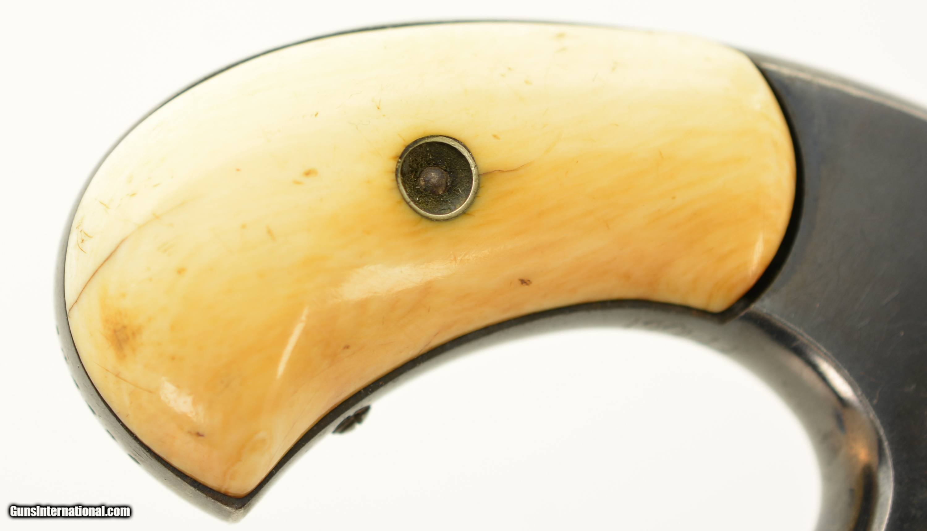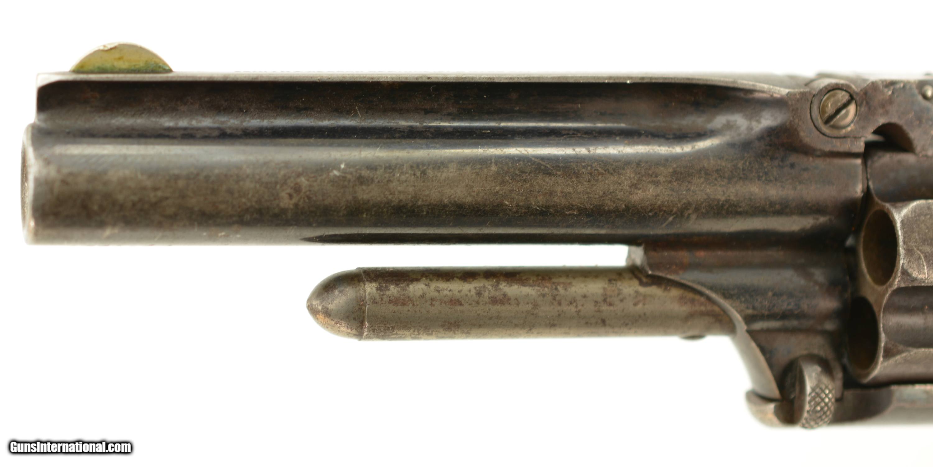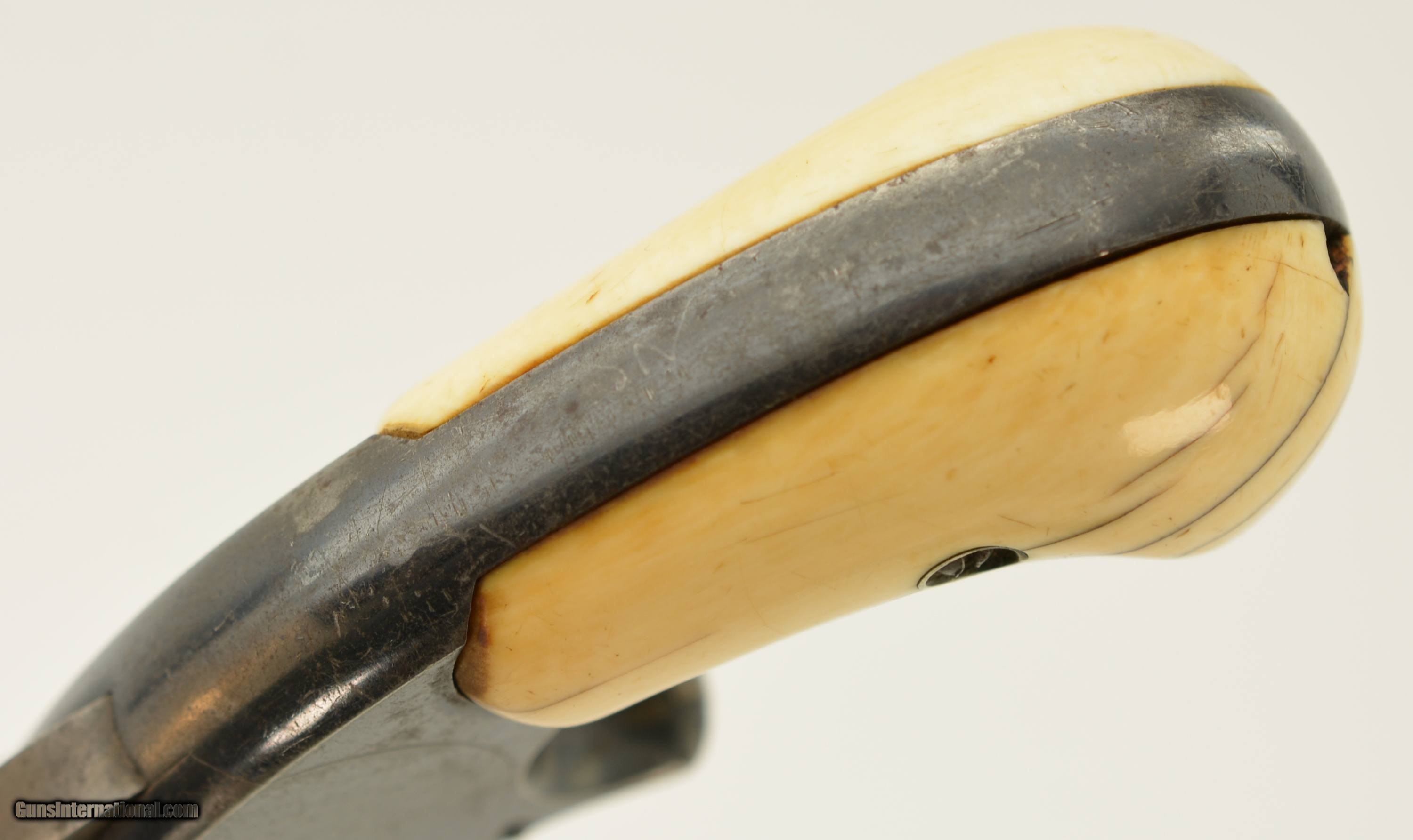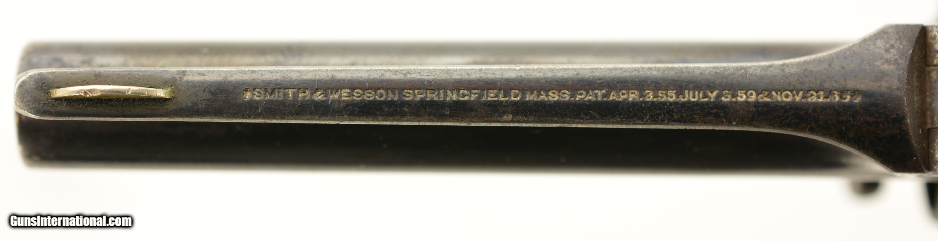 Description: Serial #104486, .32 RF, 3 1/2" barrel with a fair-good bore having light pitting and freckling within the grooves. The metal surfaces of this revolver retain about 75-80% original bright blue with fading along the cylinder, and the sides of the barrel flaked to a mottled gray patina. The trigger, hammer and ejector retain some muted color case-hardening, with the sides of the hammer still retaining some vibrant colors. Some of the screw heads show light slot wear and the barrel address and patent dates remain crisp and clear. The revolver wears a set of handsome, period ivory grips that rate very good plus, although the base of the left panel has a small chip and a number of hairline age cracks. Both panels have an attractive, mellow patina. The barrel lock-up is good, with some lateral play, and the action is mechanically functional. This is a very good 1 1/2 S&W overall. Antique SOLD Antique: Yes Manufacturer: S&W Model: 1 1/2 Serial Number: 104486 Caliber Info: .32 Gauge Info: .32 |