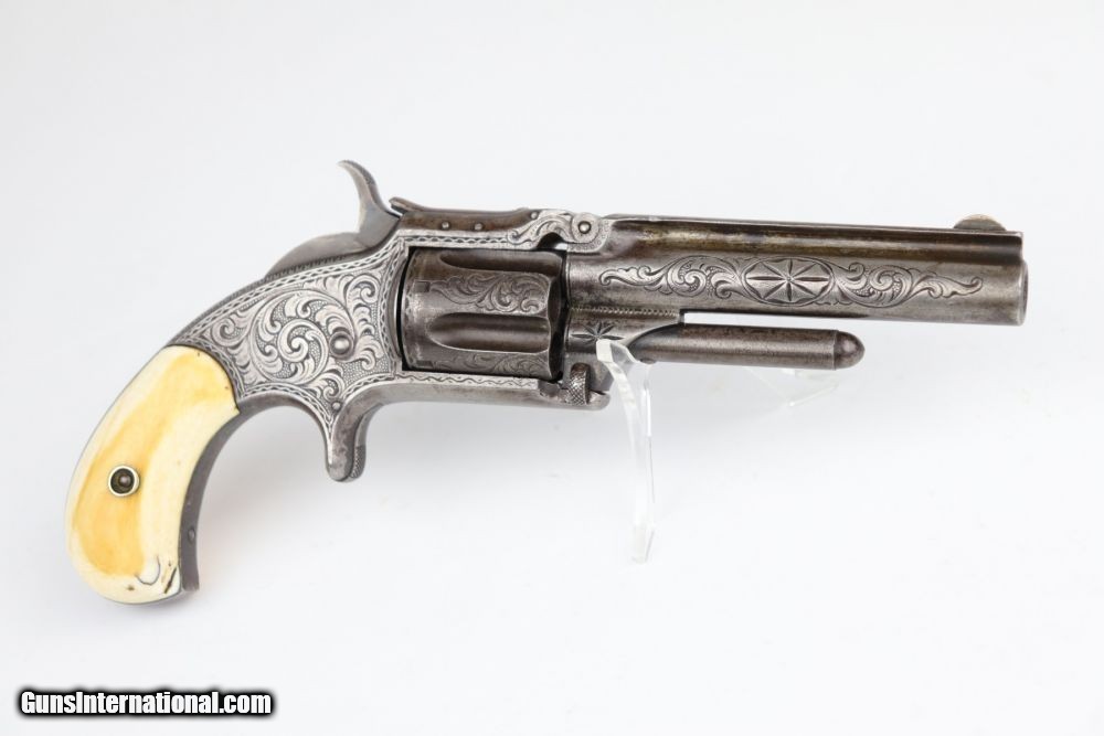 Description: This is a S&W No. 1 1/2 Second Issue Revolver. It is an antique and was manufactured between 1868-1875. It features a beautiful floral and "burst" engraving pattern. This pattern is period correct. It also has original ivory grips in excellent condition. There is some tarnish on the barrel which is an indication that it likely was silver-plated originally. The original finish is almost completely worn. The gun still functions. There are spotty areas of patina on the metal throughout. The bore has decent rifling with minor pitting throughout. SOLD Antique: Yes Manufacturer: S&W Model: No 1 1/2 Caliber Info: .32 RF Condition: Good Bore Condition: 5/10 Manufacture Date: 1868-75 |