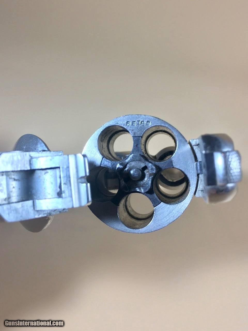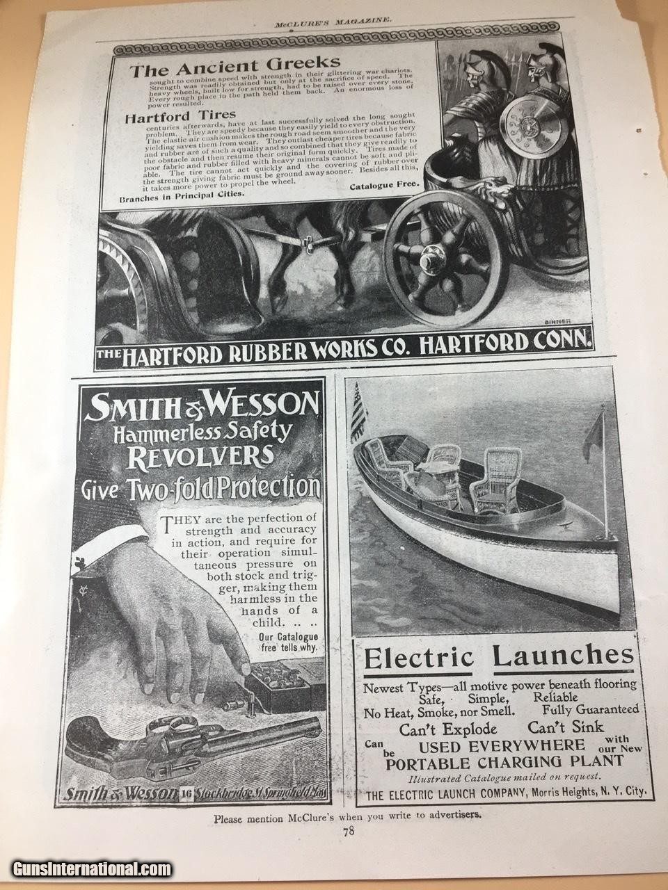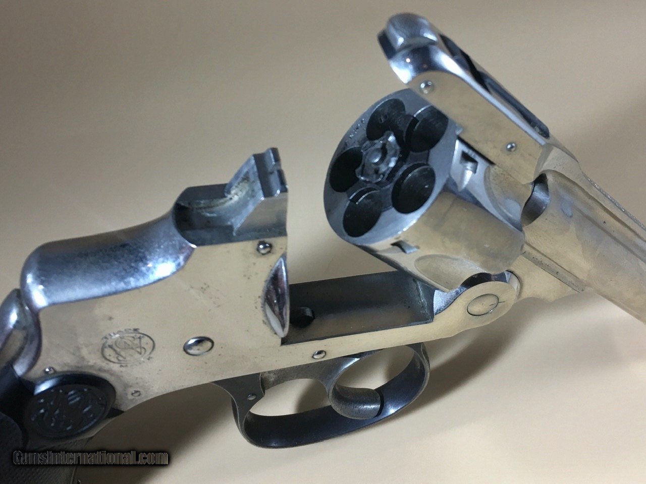 Description: Here's one for folks who like old stuff. This is an all-original Smith and Wesson Safety Hammerless top-break 5 shot revolver chambered in 32 S&W. It has a 3" (not the 3-1/2") barrel and the Nickel finish which I would rate at about 80% Hard rubber grips are perfect. No nicks. No chips. And they fit the gun perfectly - no gaps or looseness. Serial numbers for this model ran from 1 (in 1888) to 91417 (in 1902) is and this one is number 85189 so we are estimating this to be around 1900-1901. It is definitely C&R eligible but I can't say for certain it is pre-1899 so I wouldn't classify it as an Antique. All numbers match. This is not a "parts gun". It is all original. No refinishing or tinkering around with it. This firearm is in excellent condition mechanically. It locks up very tight and has a heavy but smooth trigger. No play in the cylinder whatsoever. I would not doubt that it would fire it safely if you choose to do that but for liability sake I should say that you should have your gunsmith inspect it first. If you're thinking about displaying this old gun like I did, you're in luck. This comes with a green Peters box for the 32 S&W ammunition (which has some spent brass in it) and some old advertising for this model. **********Blue Star Hobbies is a group of friends in Central Illinois working together to ocassionally offer up items from our personal collections. From time to time we may list a rifle or shotgun but our focus is mostly S&W, Colt, & Ruger handguns built between 1946-1980. Our guns are better than our photography. We try to highlight flaws with red circles and everything else is usually glare or blanket fuzz. If you have a question about a photo please ask. We follow all Federal and State laws and GI policies. Please add $25 for standard shipping. Our FFL will ship to your FFL on Mondays, Tuesdays and Wednesdays to minimize in-transit risks. ********** SOLD Curio/Relic: Yes Handgun Caliber: .32 S&W Manufacturer: Smith and Wesson Model: Safety Hammerless (1st Model) Serial Number: 85189 Condition: Good-Very Good Metal Condition: Good Bore Condition: Very good Finish: Nickel Manufacture Date: est. 1900-1901 |