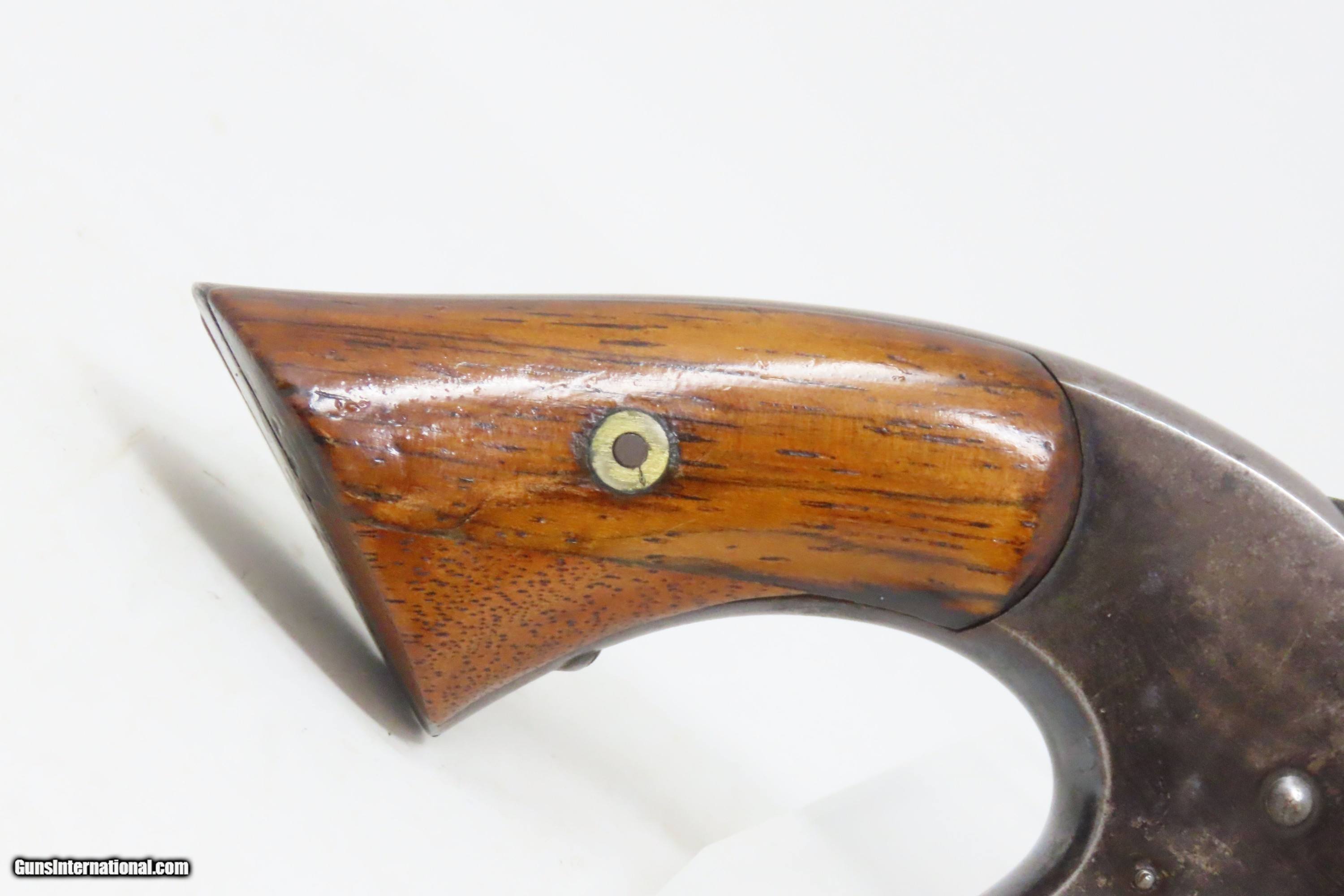 Description: Scarce Antique SMITH & WESSON No. 1 ½ .32 RF Revolver WILD WEST FRONTIER One of only 26,300 1st Issue Spur Trigger Revolvers Here we present an antique Smith & Wesson First Issue Model Number 1-1/2 .32 Caliber Rimfire Revolver, made circa 1865-68 in Springfield, Massachusetts. The No. 1 was Smith & Wesson’s first metallic cartridge firearm. It utilized the idea of the “bored through cylinder”, which was patented by Rollin White and subsequently exclusively licensed by Smith & Wesson. This concept has forever changed revolving firearms design, and is the same idea used in revolvers today. S&W, via Rollin White himself, aggressively sued any patent infringers and were able to hold their monopoly on the American market for cartridge revolvers from about 1857 to 1870, whereupon their patent expired. The results were a very profitable business, a broke Rollin White, and a grudging U.S. Chief of Ordnance Alexander Dyer, who was still angry in 1870 about not being able to use the technology during the Civil War. The U.S. government ended up giving Colt their contracts since they valued the larger .44 caliber in the Colt 1860 Armies over the .32 caliber full sized No. 2 Armies. The S&W Model No. 1-1/2 Revolver is simply a scaled-up version of the No. 1, down to the aesthetics. The .32 caliber continued to evolve just as the .22 caliber version, both in features and aesthetics. It was also a commercial success and was well-received by the buying public seeing 26,300 of the First Issue produced and over 100,000 of the updated Second Issue. The overall condition is near fine. Original blue finish. The action is excellent. Solid barrel hinge. The bore is in good condition with strong rifling. The right grip has a graft type repair, the grips are otherwise solid. Own the original! This is a legitimate antique and not a reproduction. Barrel is 3-1/2 inches. Caliber: .32 Rimfire Overall condition as seen in photos. Very Fast. Very Safe. FREE SHIPPING WORLDWIDE. Delivered directly to your door by express mail! Guaranteed AUTHENTIC & Includes CERTIFICATE OF AUTHENTICITY. ancestryguns $1500 #240323 SOLD Antique: Yes |