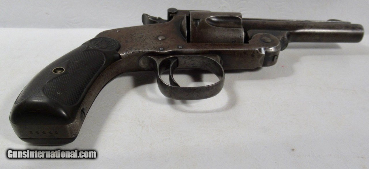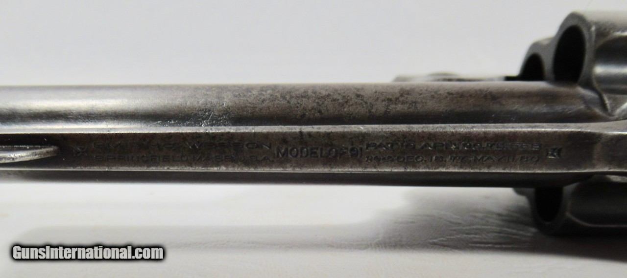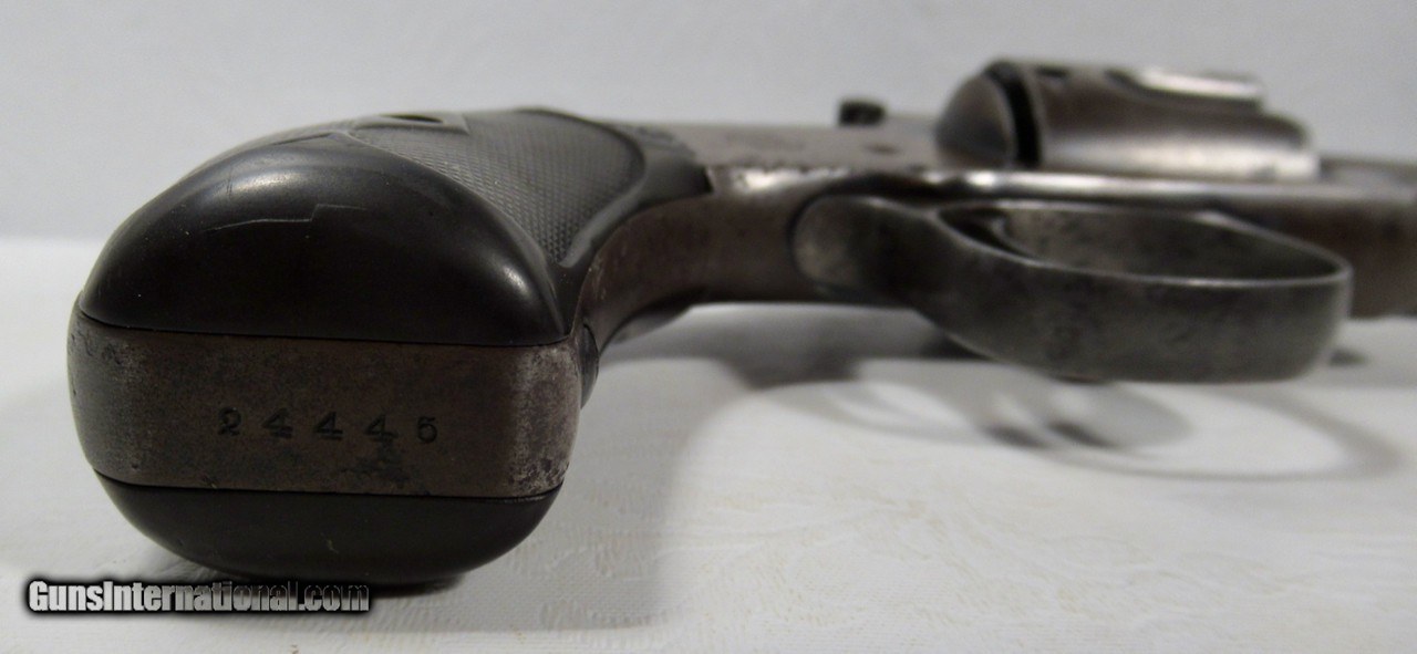 Description: Smith & Wesson Model 1891 Single Action Revolver; Serial No. 24445; 38 S&W Caliber with 3 ½” Barrel. Also Known as 38 Single Action 3rd Model; Some Original Blue Present; Perfect Action and Excellent Bore; 100% Correct and All Numbers Match; PERSONAL PROPERTY of Harold Wieser; Price: $575 + $30 S&H; Price includes insured shipping; return policy: three days inspection from the date the item is received; full refund of shipping both ways ONLY IF THE ITEM IS MISREPRESENTED. SOLD Antique: Yes Manufacturer: Smith & Wesson Model: 1891 Serial Number: 24445 |