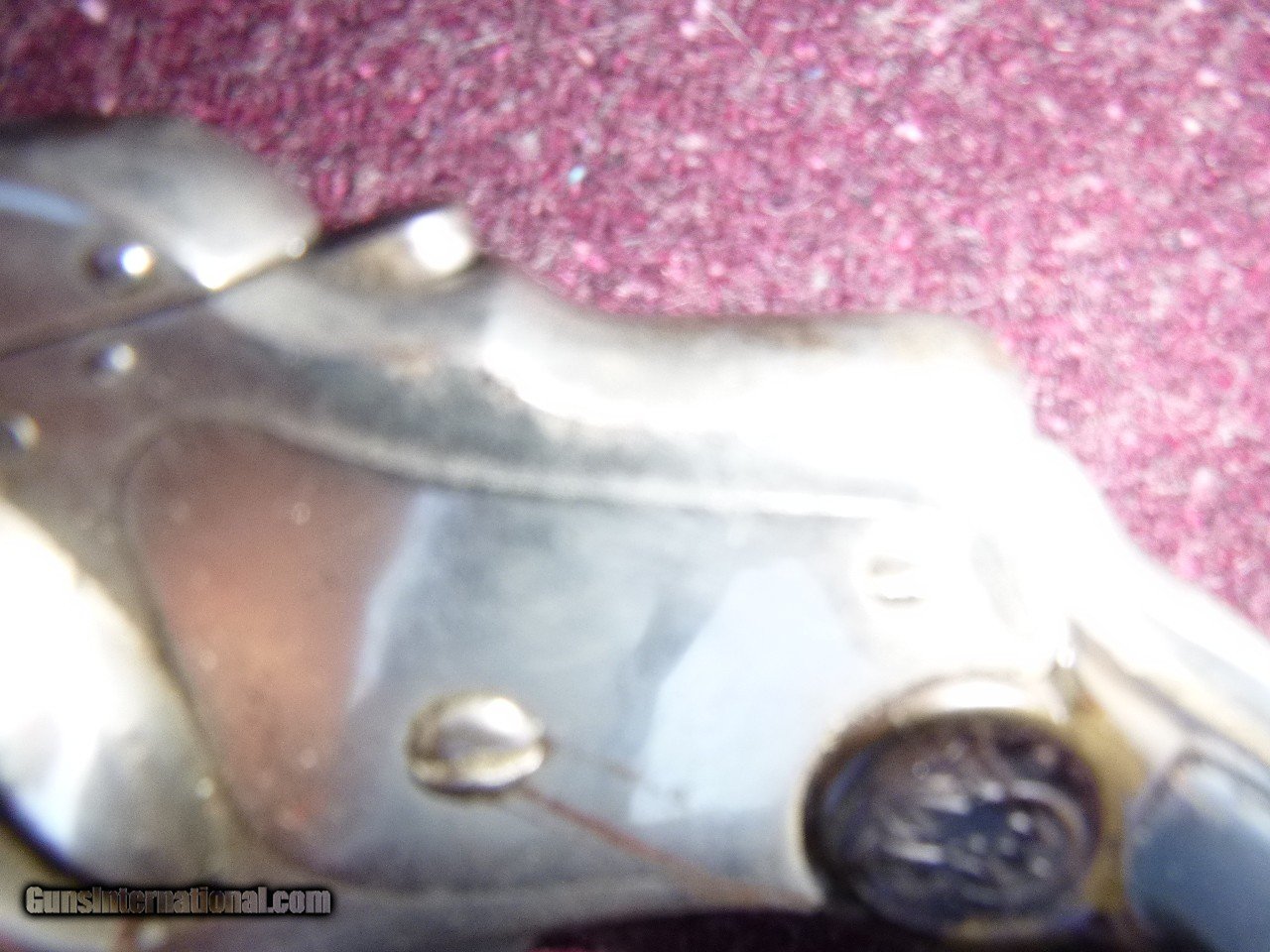 Description: Here is one I hadn't seen before This little revolver opens by pushing down the button right behind the hinge. Good lettering, worn but intact grips, excellent action, grip safety. Bore is very good and lock-up is tight. The original nickel has some issues as can be seen in the photos. Still a very nice little Smith pocket pistol that works as it should. Shipping and insurance included in the price to your door in most states. SOLD Antique: Yes Handgun Caliber: .38 S&W (.38 Colt New Police, .38 Super Police) Manufacturer: Smith and Wesson Model: Safety hammerless Serial Number: 15047 Barrel Length: 3 Condition: Good Metal Condition: Good Wood Condition: Good Bore Condition: Very good |