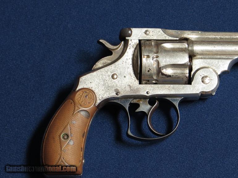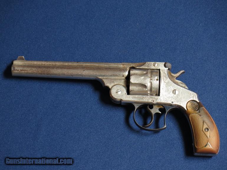 Description: Smith & Wesson 44 DA Frontier Target 44-40. 1st model. SN 54XX. 6 1/2" barrel. 80-85% original nickel. 50% case coloring on hammer & trigger. Excellent bore. SOLD |