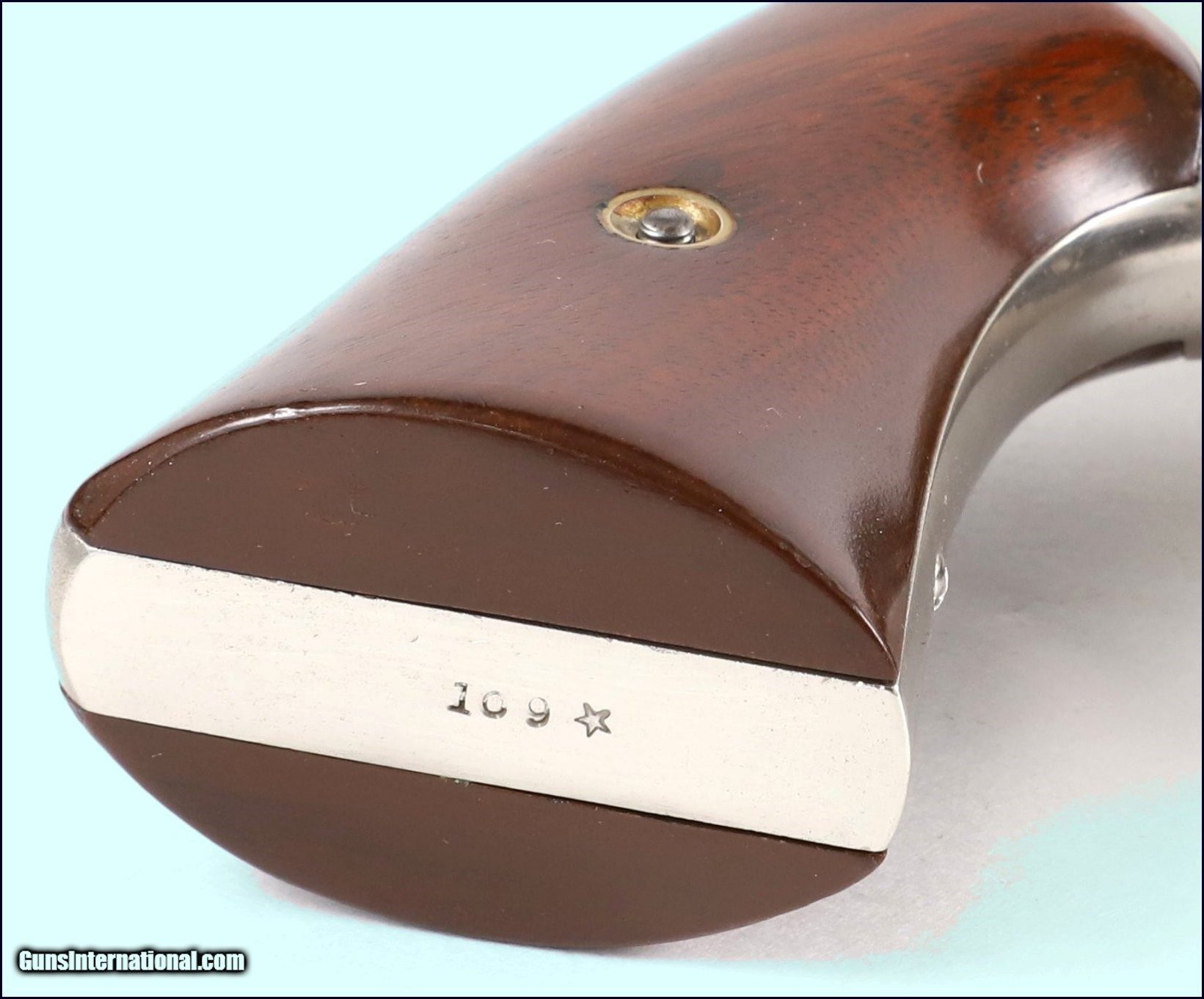 Description: An awesome and very rare First Model American "OIL HOLE" # 3 in .44 S&W caliber, that remains in absolutely wonderful condition inside-out! It was returned to the Smith & Wesson factory for refinishing 64 years ago, in March of 1956 - note the '3.56’ date and the stamp on the left grip frame and that it appears virtually untouched since that time. Serial Number #109... One could search high and low in a lifetime of collecting and never find a better example... This large frame, big-bore “Top Break" will make a fantastic addition to any collection of high-grade Antique S&W Number 3's. SOLD Antique: Yes |